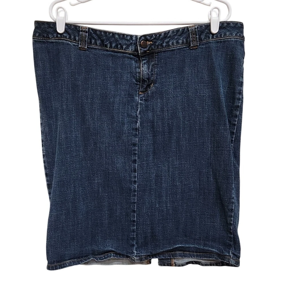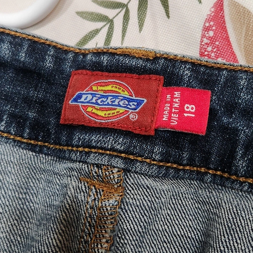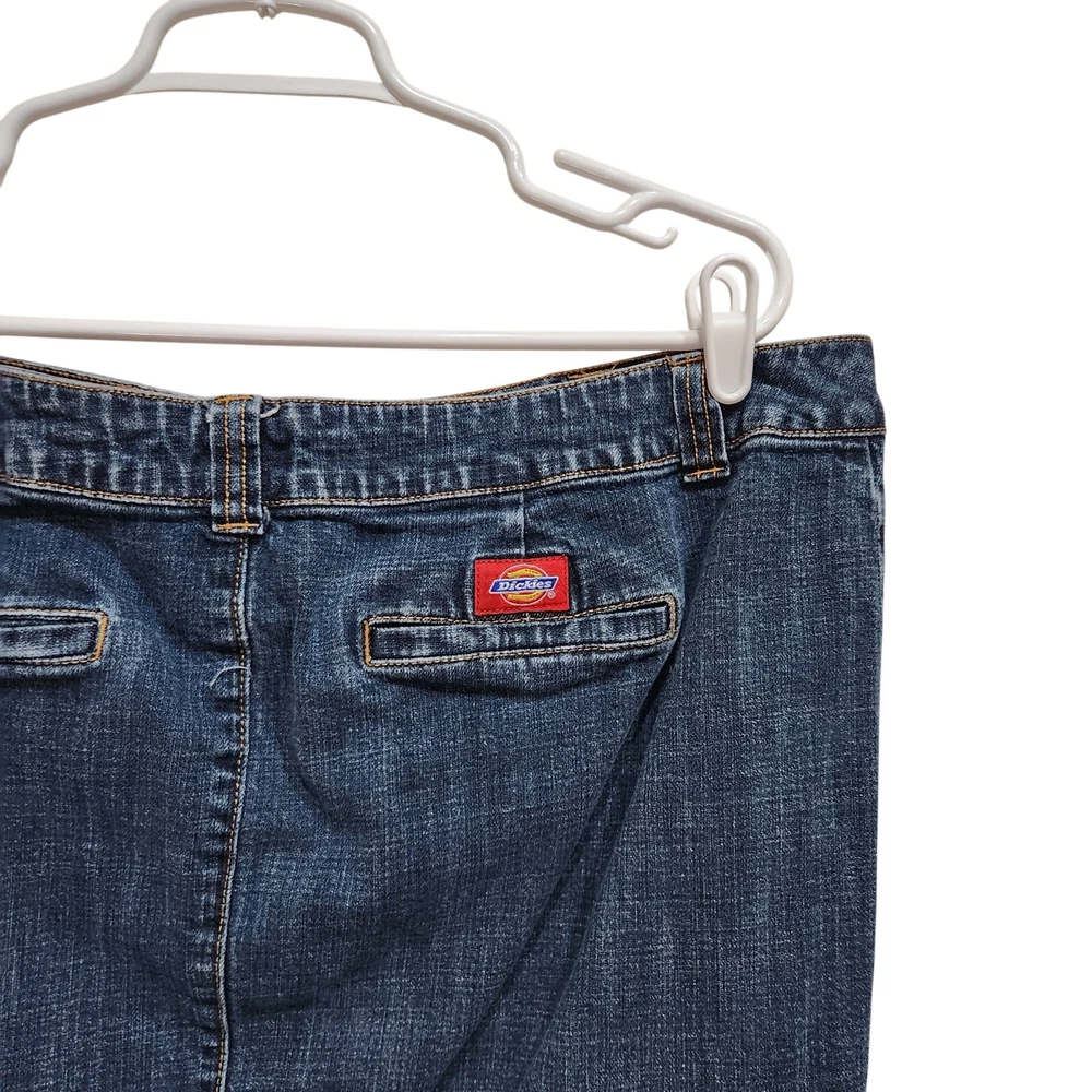 Dickies Vintage Y2K Logo Pencil Denim Skirt Mid Rise Dark Wash Blue Plus Size 18 Good pre-owned condition. Measurements: Waist: 19.5'' Length: 25'' Features: Belt loops Zipper fly with button closure Straight, pencil cut Above knee length Dark wash denim Slit on the back Stretch denim fabric 97% Cotton, 3% Spandex corpcore office siren layering work wear semi formal work attire modest y2k large logo branded acubi streetwear skater late 90's early 00's