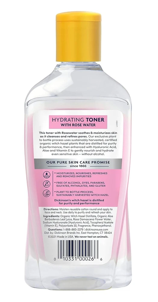 Expiration Date: N/A Set Includes: Toner Formulation: Fluid Sun Protection Factor (SPF): N/A Product Line: N/A Country/Region of Manufacture: United States gtin13: 0010331000266 Scent: Rose Features: Alcohol-Free, Animal Cruelty-Free, Contains Vitamins Skin Type: All Skin Types Type: Toner Ingredients: Rose Water MPN: 250791 UPC: 0010331000266 Size: Regular Body Area: Face Volume: 16 fl oz Active Ingredients: Aloe Vera Period After Opening (PAO): 9M Department: Unisex Brand: Dickinson's Main Purpose: Clogged Pores UVA Protection: 1-Star