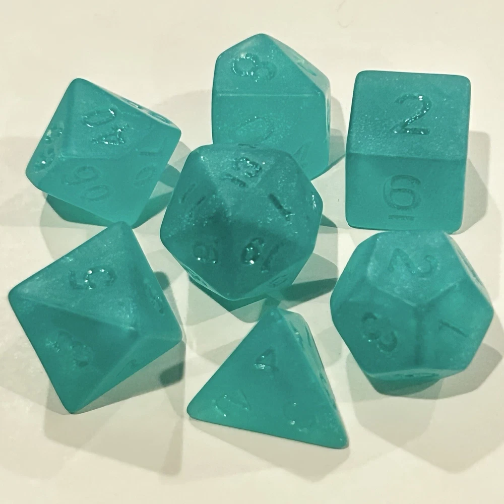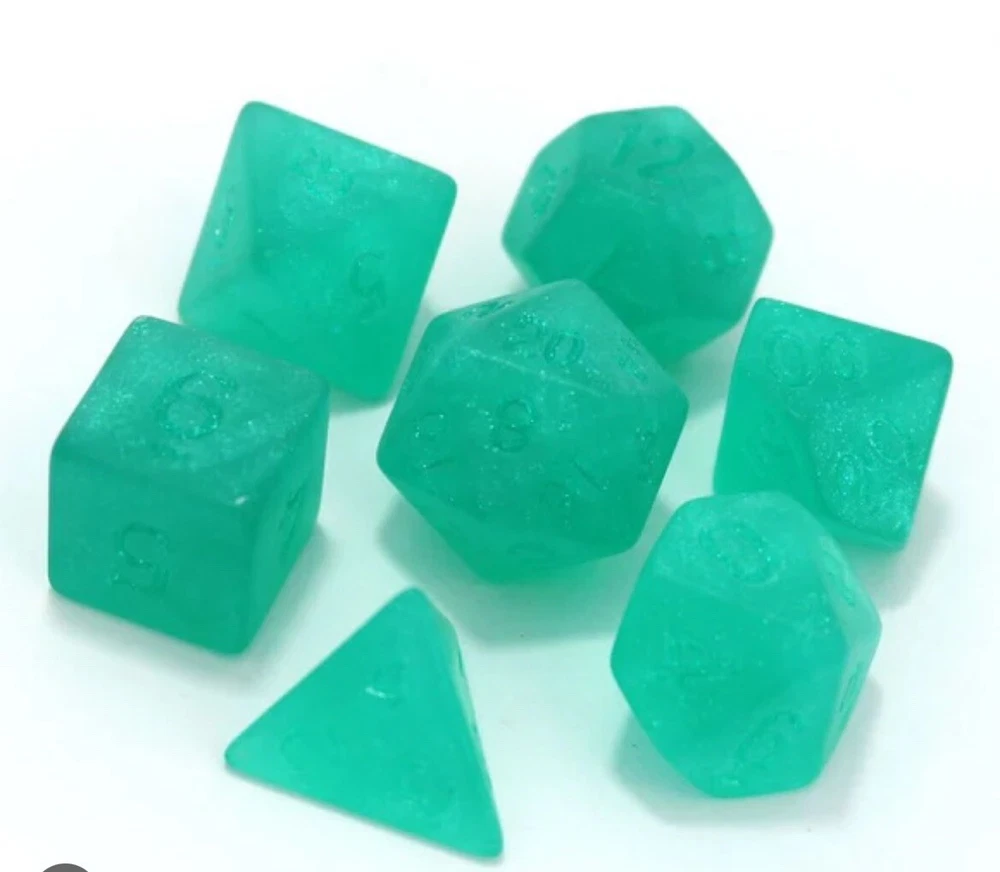 Die Hard Dice 7ct Polyhedral Dice Set - Frosted Hakuro (opened bag, never used) Please Note: These dice are intentionally left unfinished. They've been tumbled so they have rounded edges, but still require inking and a final polish. Proper safety equipment should be used when sanding polymer dice. FEATURES • Material: Teal/Green Acrylic with microglitter (vibrant color that is hard to photograph!) • 7 piece dice set • Standard, 16mm size • Numbers unpainted • Die Hard Dice Exclusive