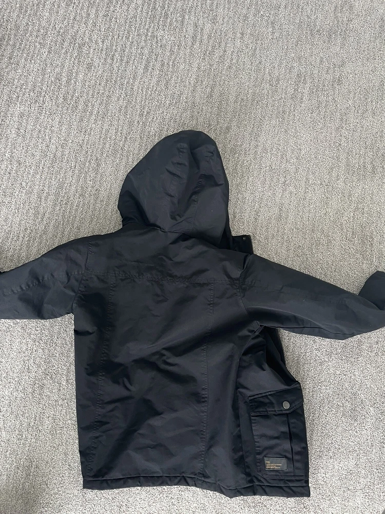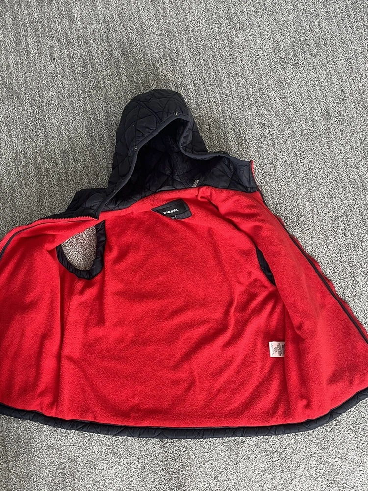 Stay warm during the winter season with this stylish 2 in 1 jacket from Diesel. The black jacket features a button-down collar and a full zip closure. Made of 100% cotton, the jacket is perfect for formal occasions and is designed for boys aged 10-12 years. The mid-length jacket has long sleeves and is fully lined with 100% polyester for added comfort and warmth. The solid pattern and accents add a touch of style to the jacket, making it perfect for any occasion. The jacket is easy to care for and should be dry cleaned only. It is a 2 in 1 perfect for any occasion. The vest even comes off and can be worn on its own.