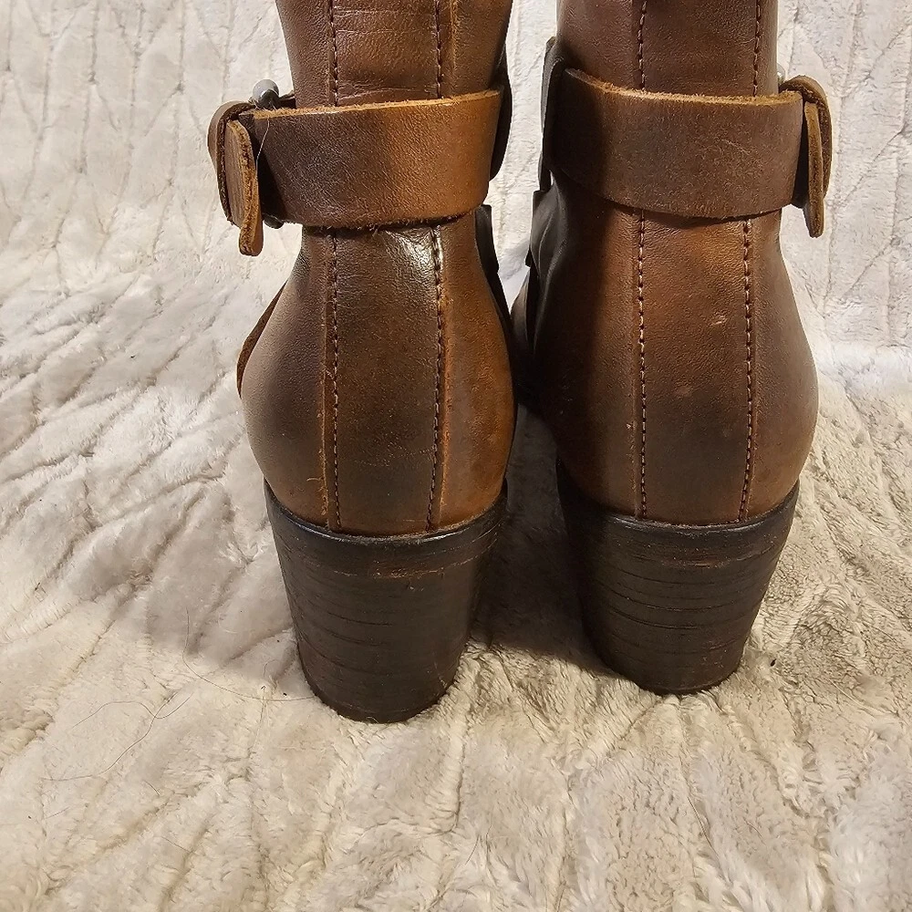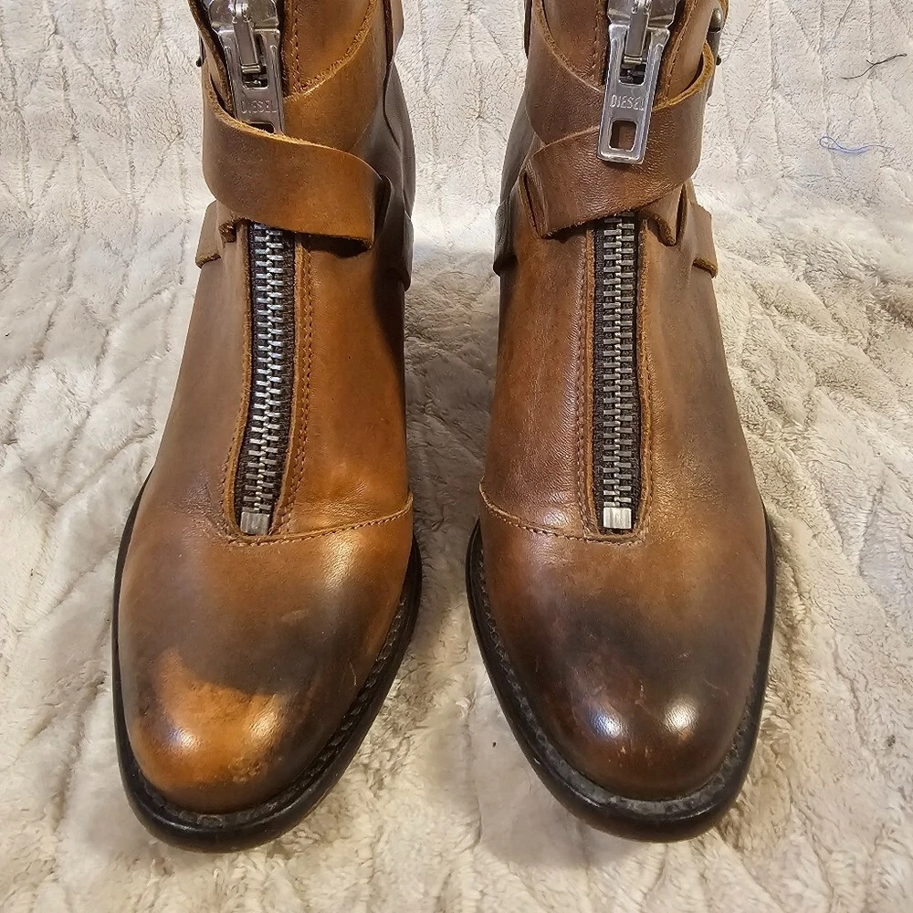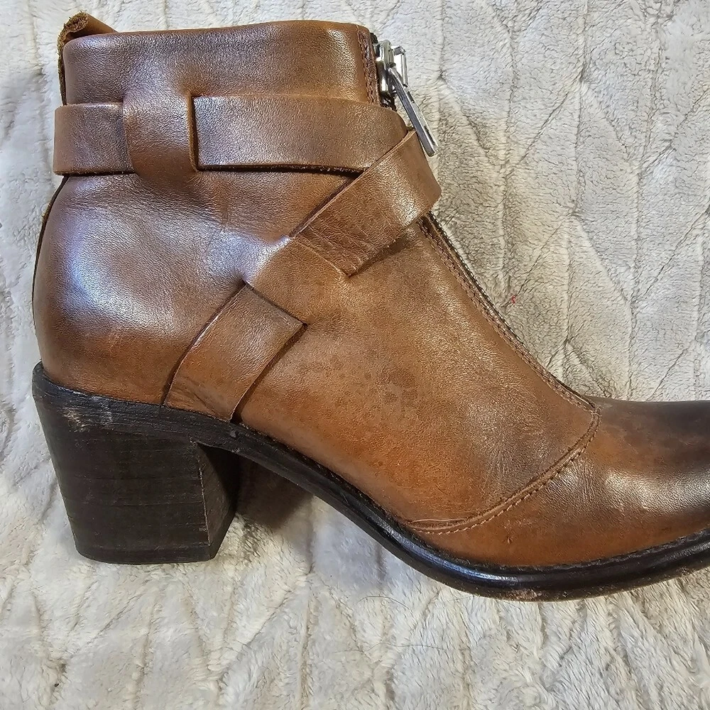 High quality pair of leather boots. Has an adjustable belt and zipper closure. Has a 2.5 inch heel. The leather is super soft. There's some discoloration and scuffs to the leather as shown in the photos, not sure if it is stock or not. See photos for full details.