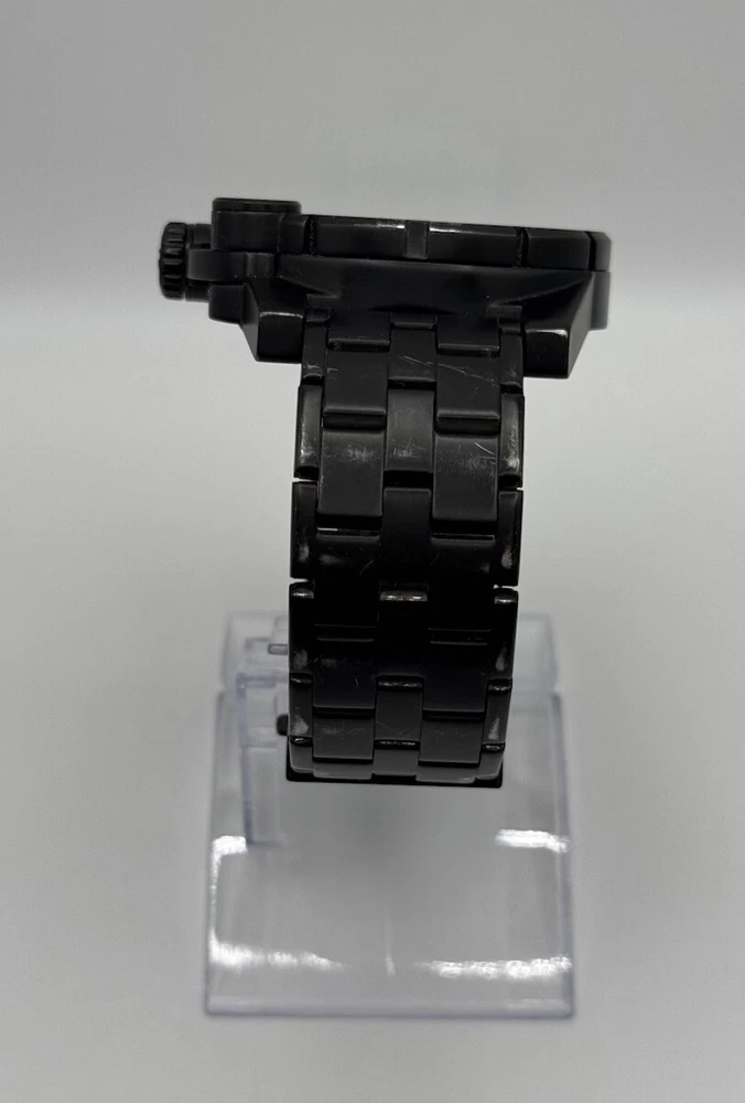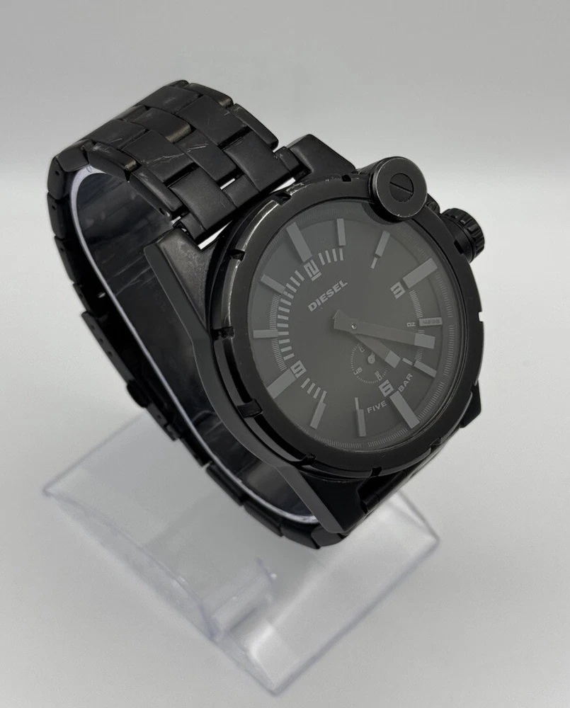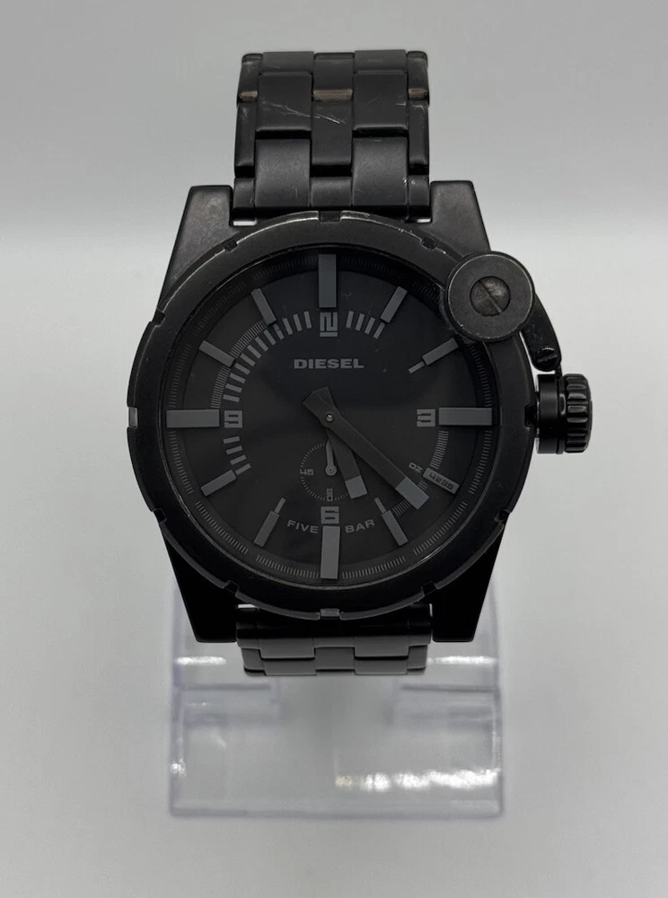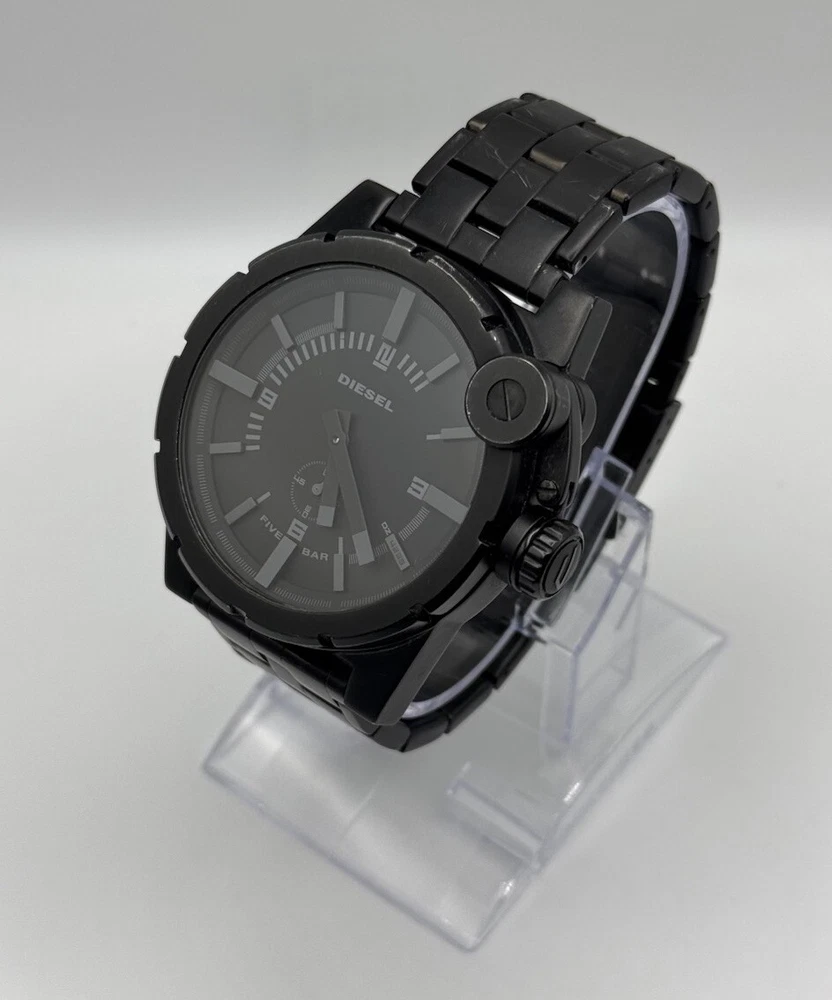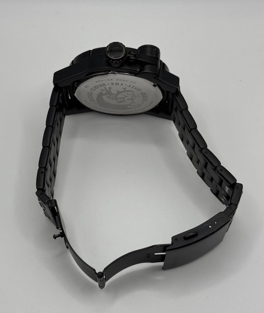 Department: Men Band/Strap: Bracelet Water Resistance: 50 m (5 ATM) Type: Wristwatch Number of Jewels: 0 Indices: Arabic Numerals, Baton Indexes Band Material: Stainless Steel Display: Analog Brand: Diesel Dial Color: Black Year Manufactured: 2000-2009 Lug Width: 24 mm Vintage: No Bezel Type: Engine-Turned, Fixed, Edge Indentations at each Hour Style: Casual, Classic, Sport Dial Pattern: Logo With Service Records: No Features: 12-Hour Dial, Mineral Crystal, Push/Pull Crown, Screwdown Crown, Small Second, Water-Resistant, Signed Crown, Original, Signed Bracelet Watch Shape: Round Case Material: Stainless Steel Seller Warranty: No Handmade: No Movement: Quartz Band Width: 24 mm With Manual/Booklet: No Case Color: Black Bezel Color: Black Case Size: 48 mm Customized: No With Papers: No Closure: Fold-Over Push-Button Deployant Case Finish: Matte Country/Region of Manufacture: China With Original Box/Packaging: No Caseback: Screwback Reference Number: DZ-4235, DZ4235 Band Color: Black