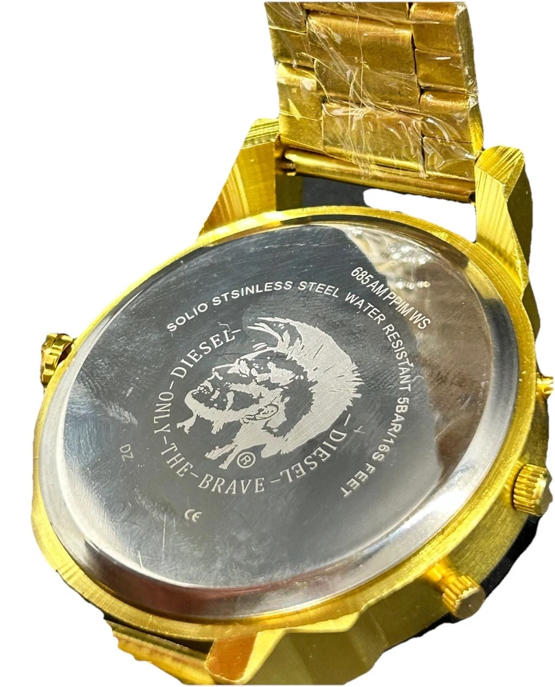 This Diesel Mr. Daddy 2.0 Chronograph wristwatch is a perfect addition to your collection. With a striking gold dial and bracelet, this watch exudes luxury and elegance. The round watch face features stick indexes and a date and day indicator, making it both practical and stylish. Crafted with high-quality stainless steel, this watch is water-resistant and has a quartz movement powered by battery. The case has a gloss finish and measures 57mm in size with a 14mm thickness. The bracelet is also made of stainless steel and has a width of 28mm. This watch is suitable for adult men and is perfect for a variety of occasions, including casual, classic, luxury, dress/formal, and sports.
