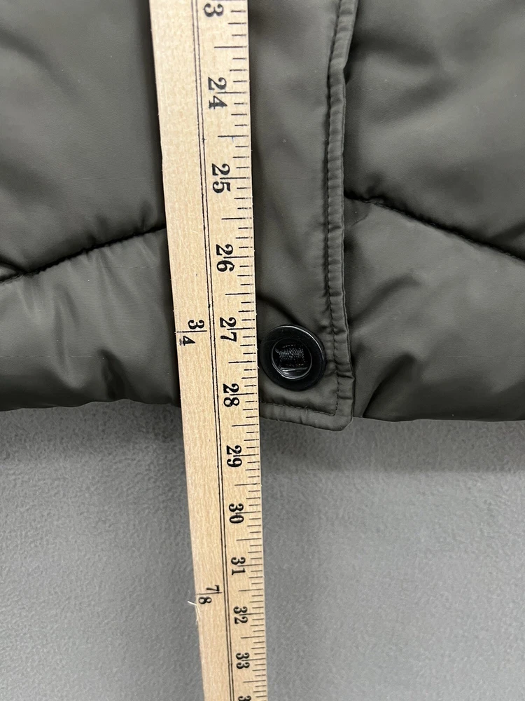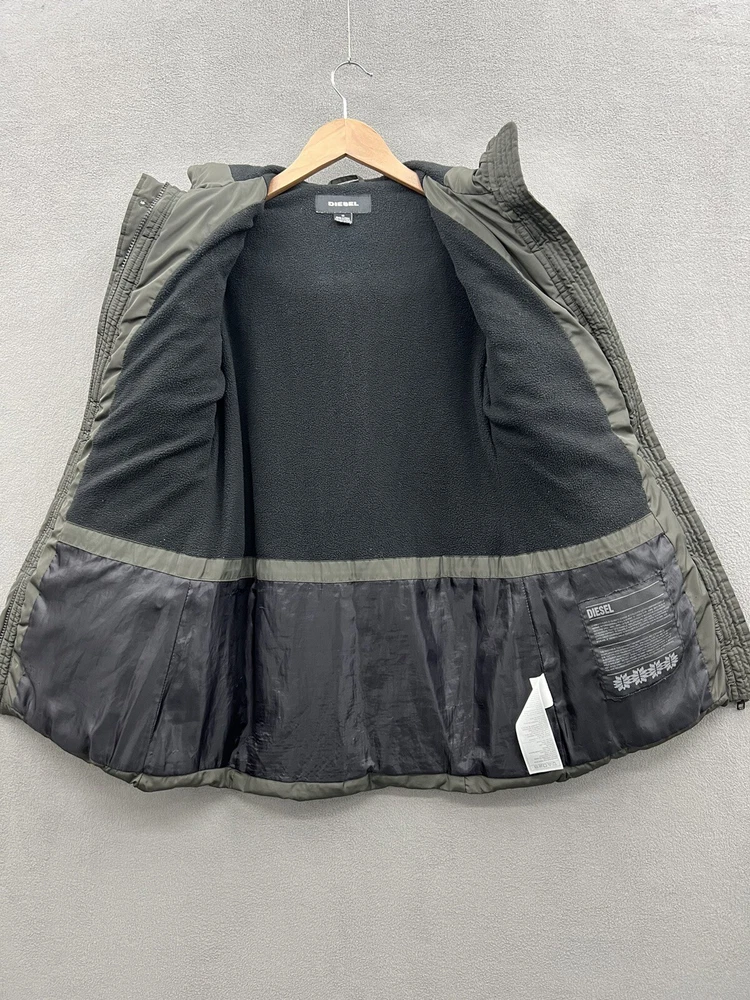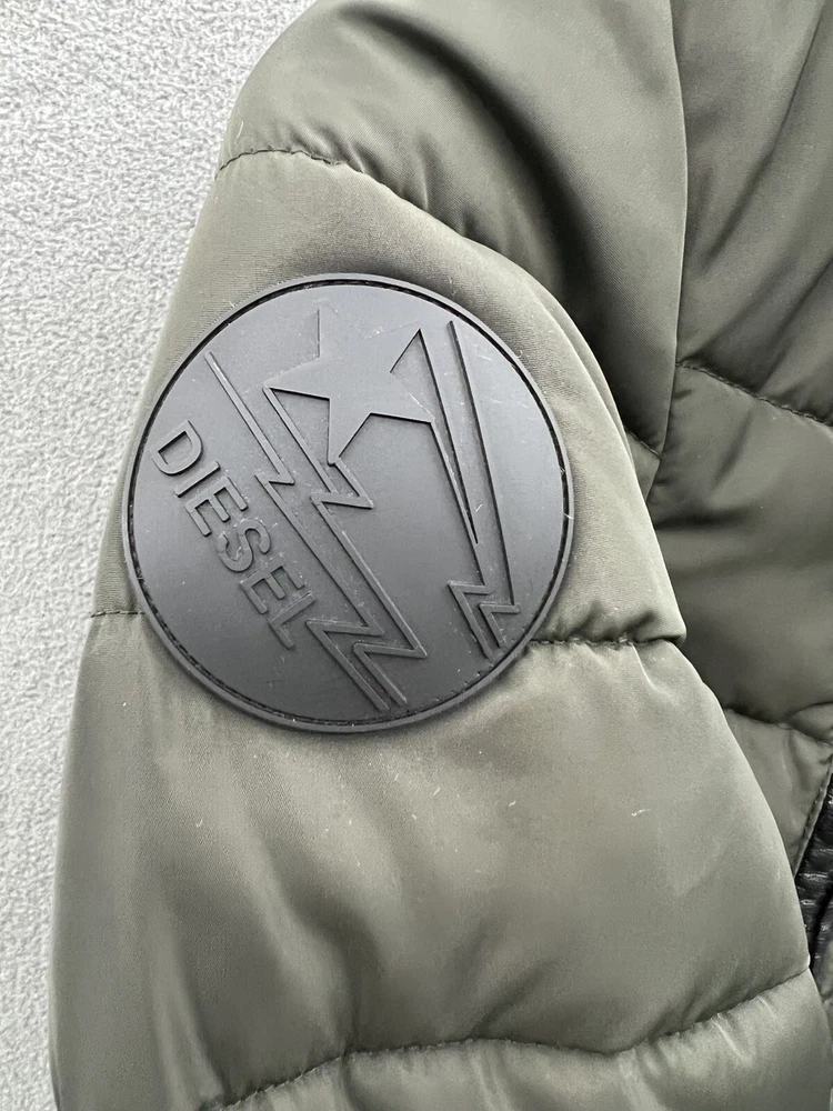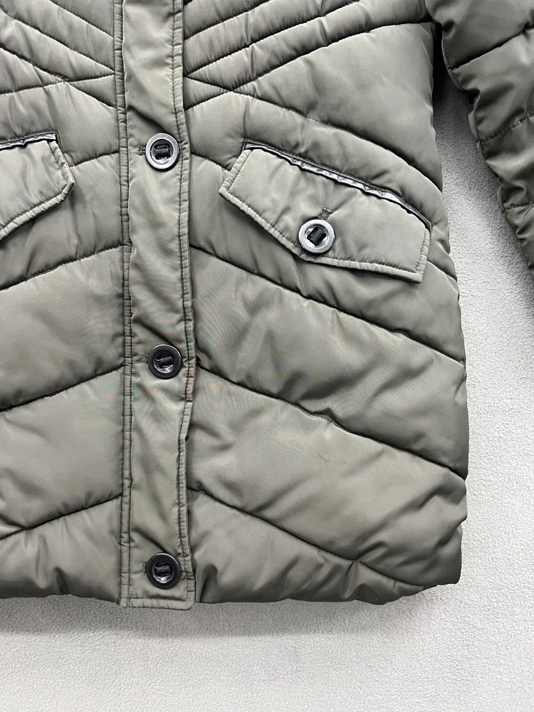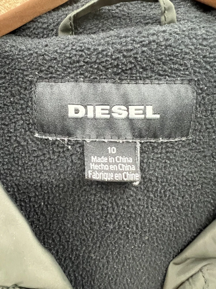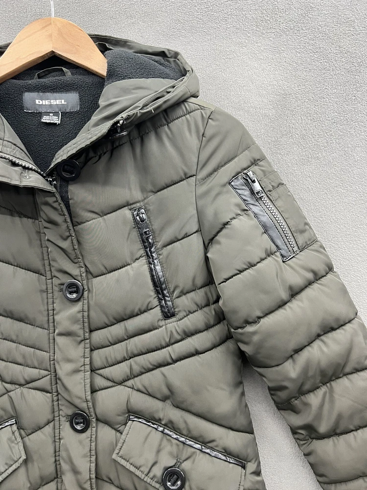 This DIESEL girls' puffer jacket in size 10 is perfect for winter and fall. The long sleeve, solid green coat is made with a nylon outer shell material and a polyester lining material to keep your little girl warm and comfortable. It features a hood, zip closure, and pockets for added convenience. The quilted accents and army theme add a stylish touch to this casual jacket, which is ideal for everyday wear. The slim fit and jacket/coat length make it a great addition to any girl's wardrobe. Get your hands on this Olive brand puffer jacket and keep your little girl cozy this winter!