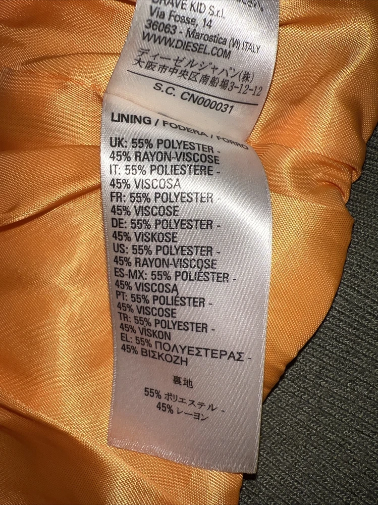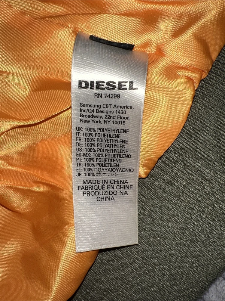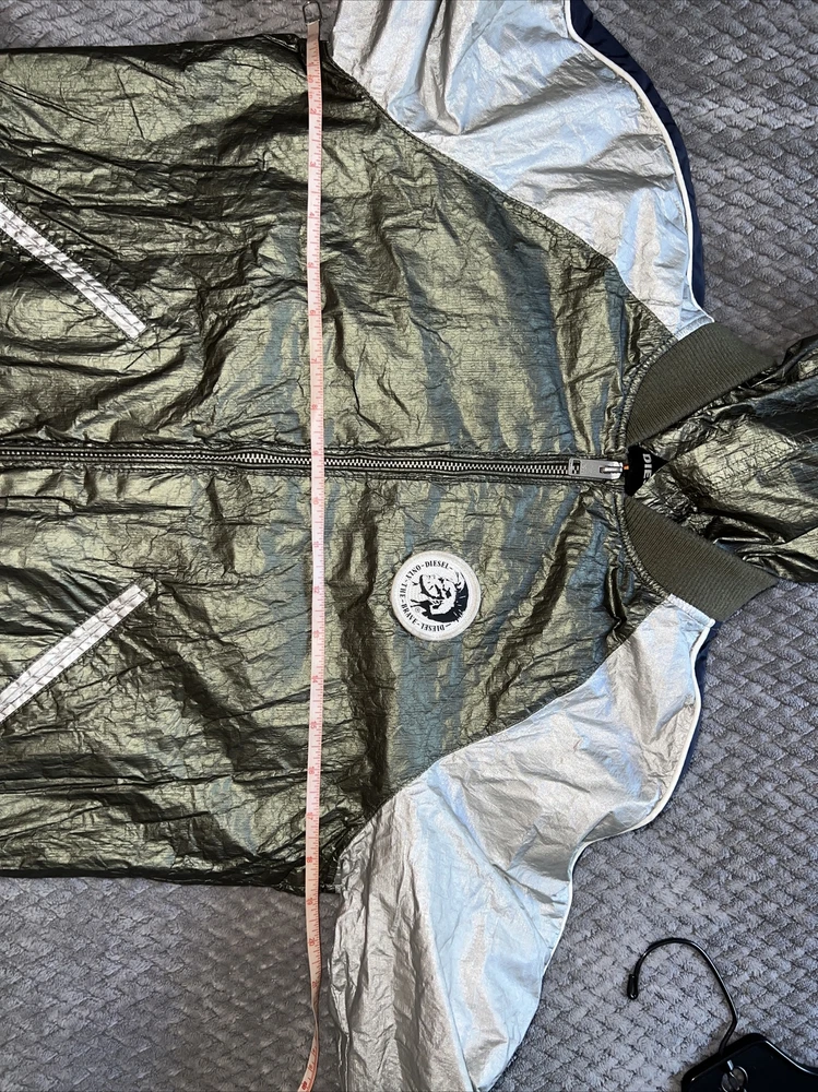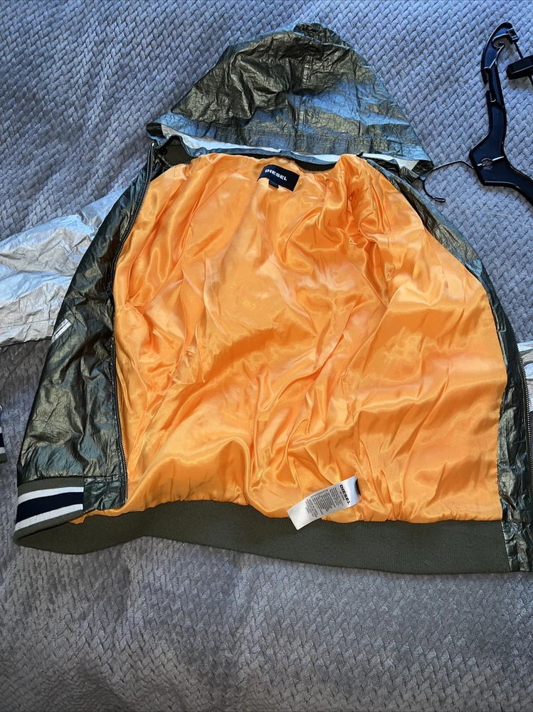 Fabric Type: Latex Style: Bomber Jacket Size: 14 Color: Green Outer Shell Material: Polyethylene Closure: Zip Lining Material: 100% Polyester Brand: Diesel Department: Boys Type: Jacket