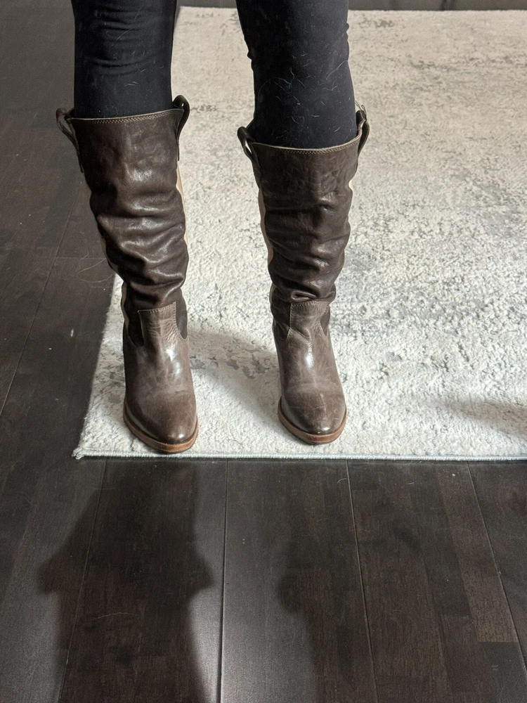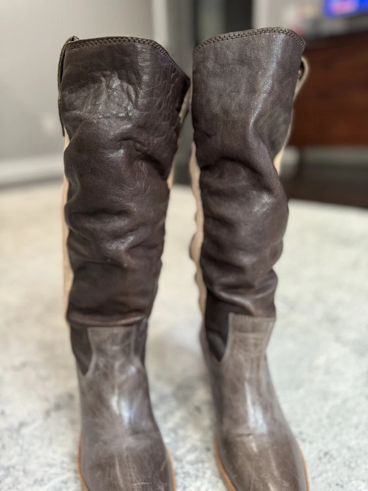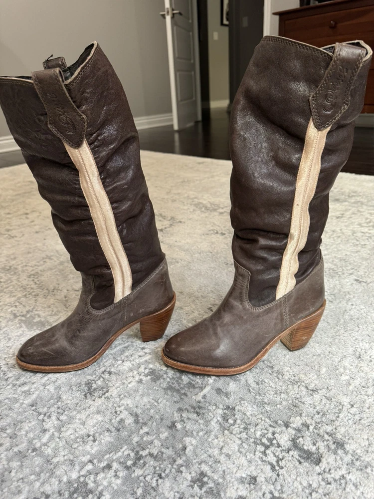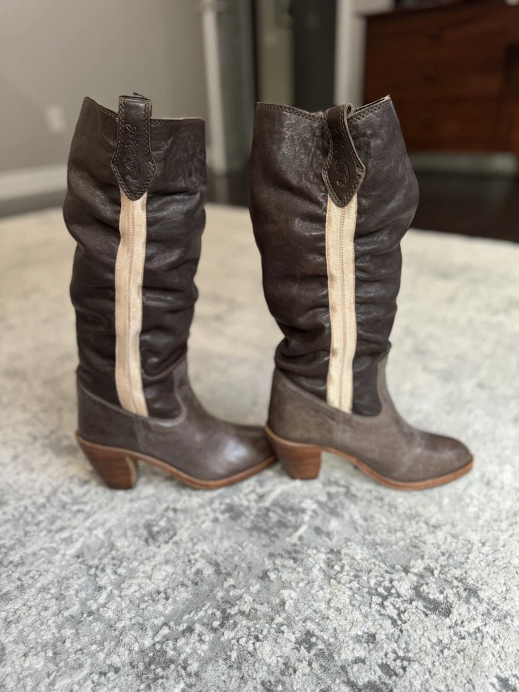 Designer Diesel 100% leather brown slouchy western style boot. Made in India. The cream panel has elastic stretch so the boot is super easy to put on! The Diesel brand has an incredible reputation and makes long lasting shoes. 3” Heel Excellent condition. Never worn. No box. Similar quality as Frye! Regular price $380