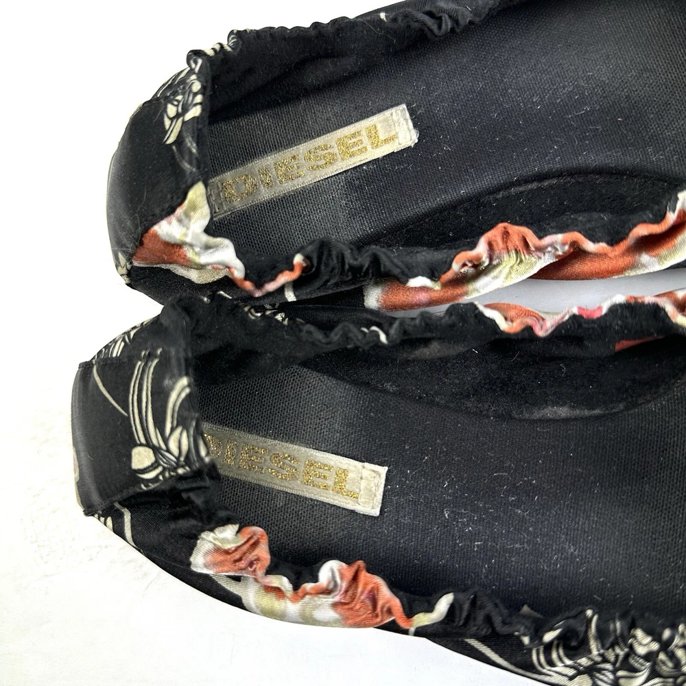 Diesel Obi Ballet Flats 8.5 Black Floral Silky Fabric Slip On Shoes Womens Minimal to normal signs of wear. No rips or tears. Peace.