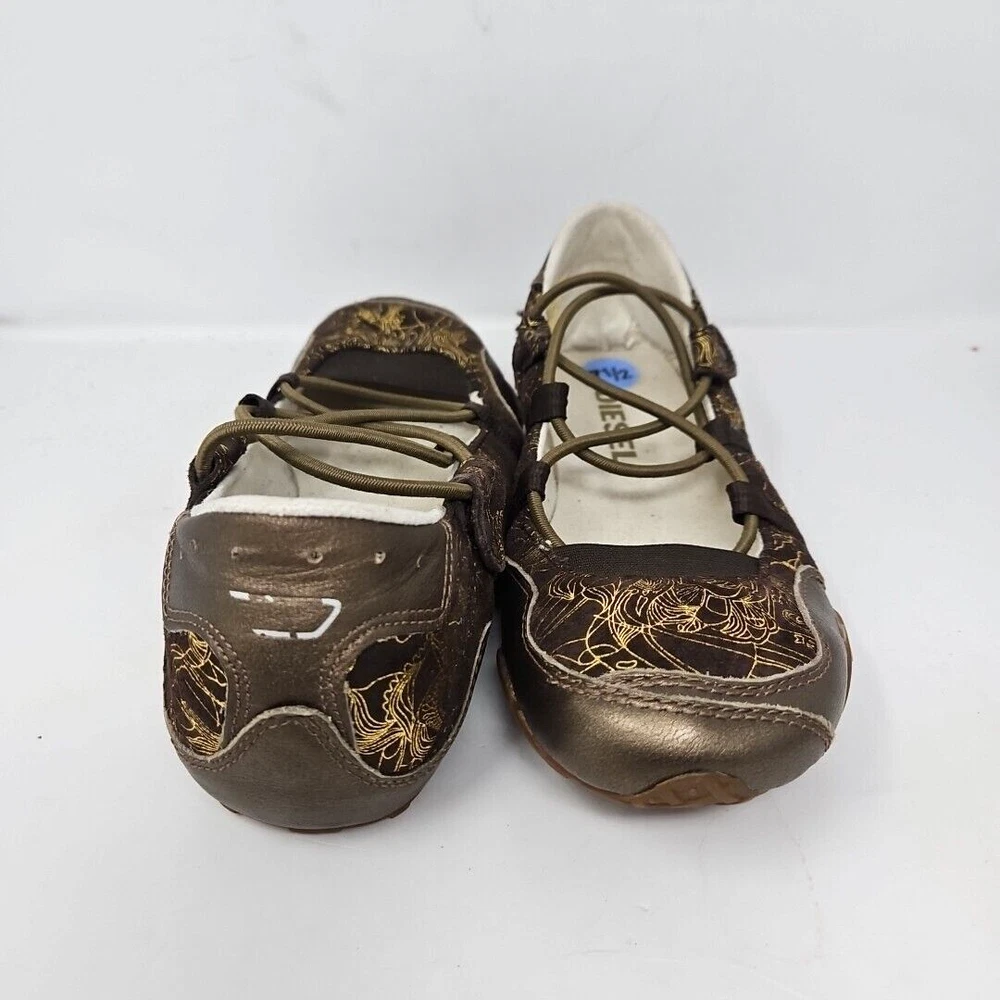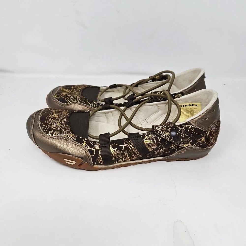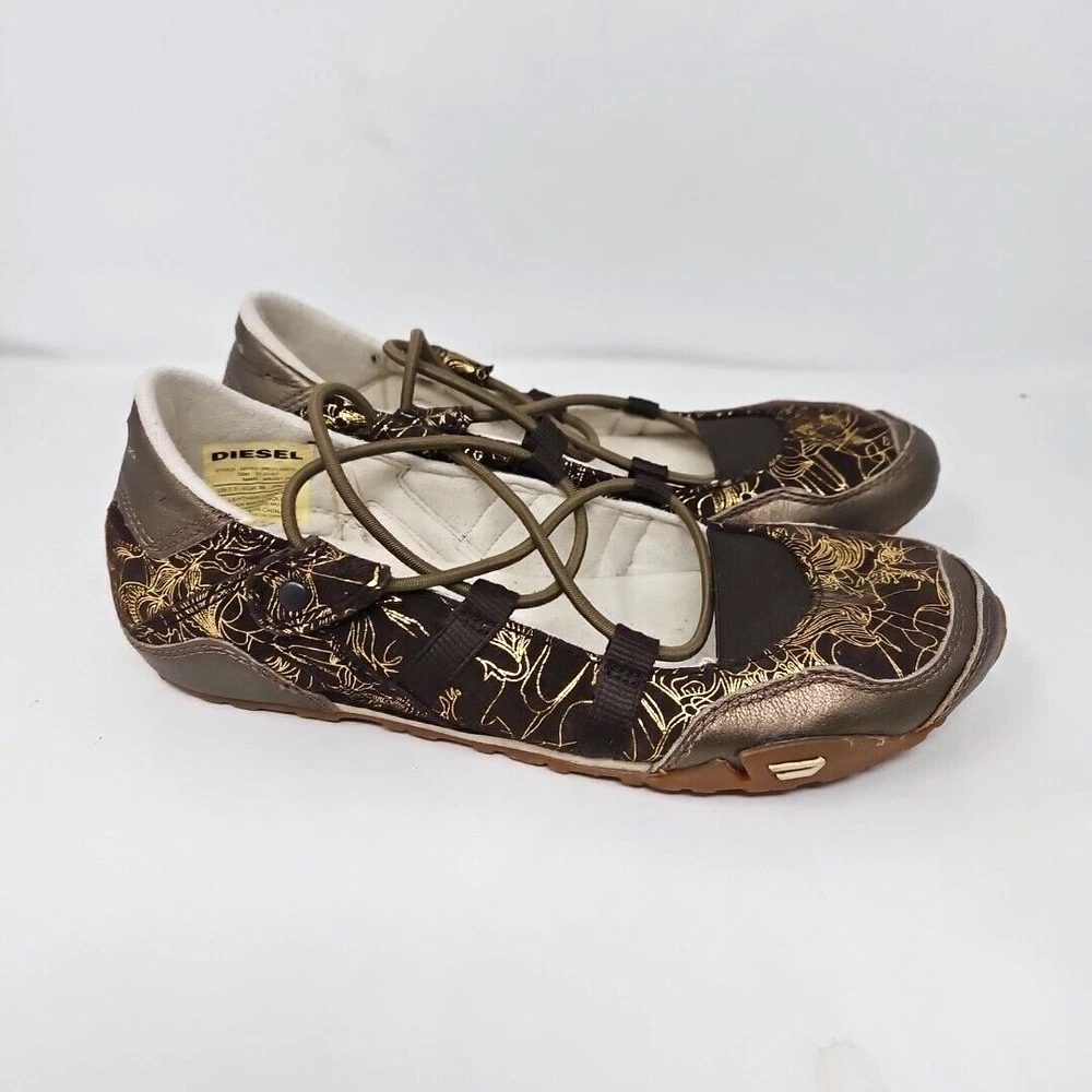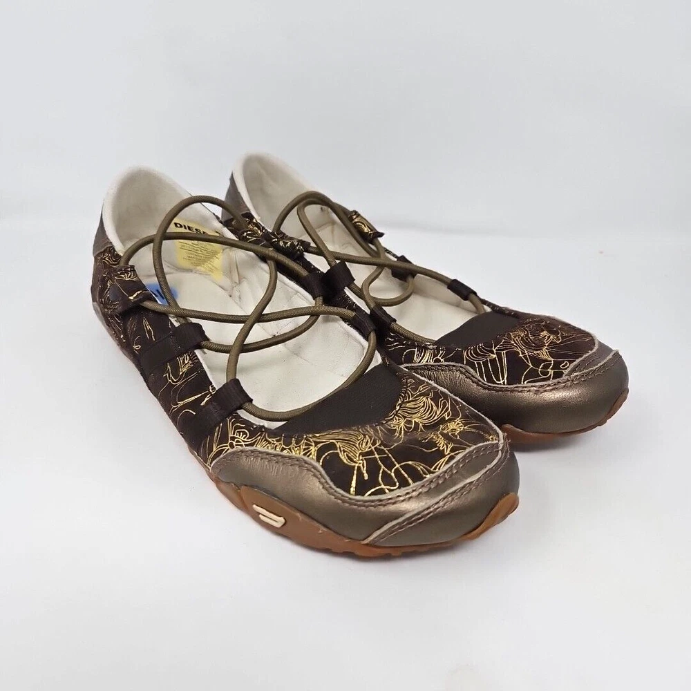 Diesel Shoes Womens 7.5 Leather Maudy Jane Vintage Casual Y2K Flats Brown & Gold