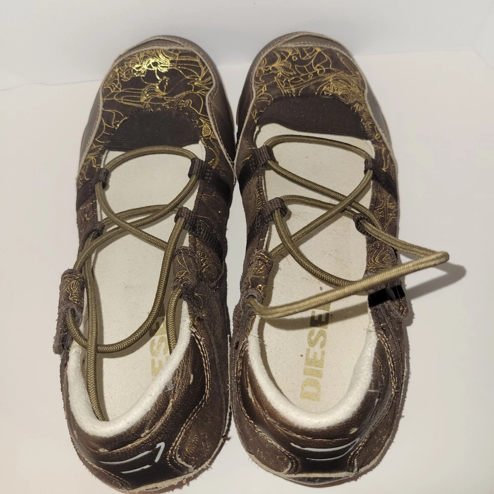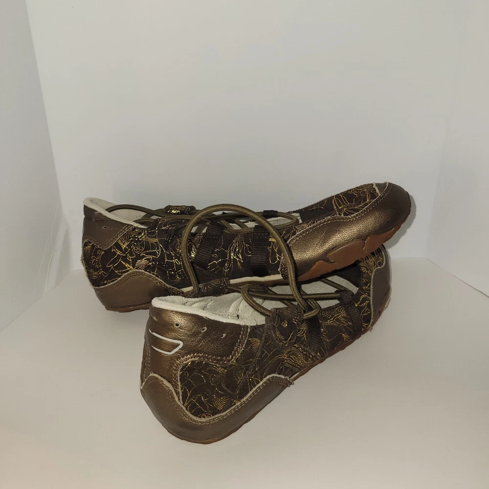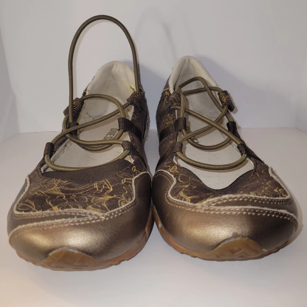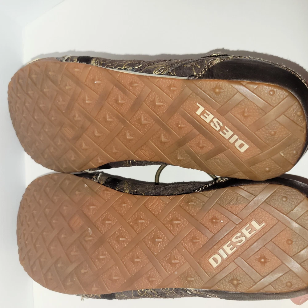 Elevate your casual look with these vintage Maudy Jane flats from Diesel. Crafted from a blend of leather and blended fabric, these round toe shoes feature a glittery geometric pattern, a pull-on closure, and a low-top shoe shaft style. The brown and gold color combination adds a touch of sophistication, while the lightweight, breathable, and comfortable foam insole makes them perfect for all-day wear. Ideal for summer, fall, and spring, these Mary Jane style shoes are suitable for a variety of occasions, including gym and training, cross-training, dance, crossfit, and hiking. They come in a standard shoe width, with a US shoe size of 9 and an EU shoe size of 38. The outsole is also made of leather, ensuring durability and traction. Get ready to rock the Y2K and 90s fashion with these Marie character inspired shoes.