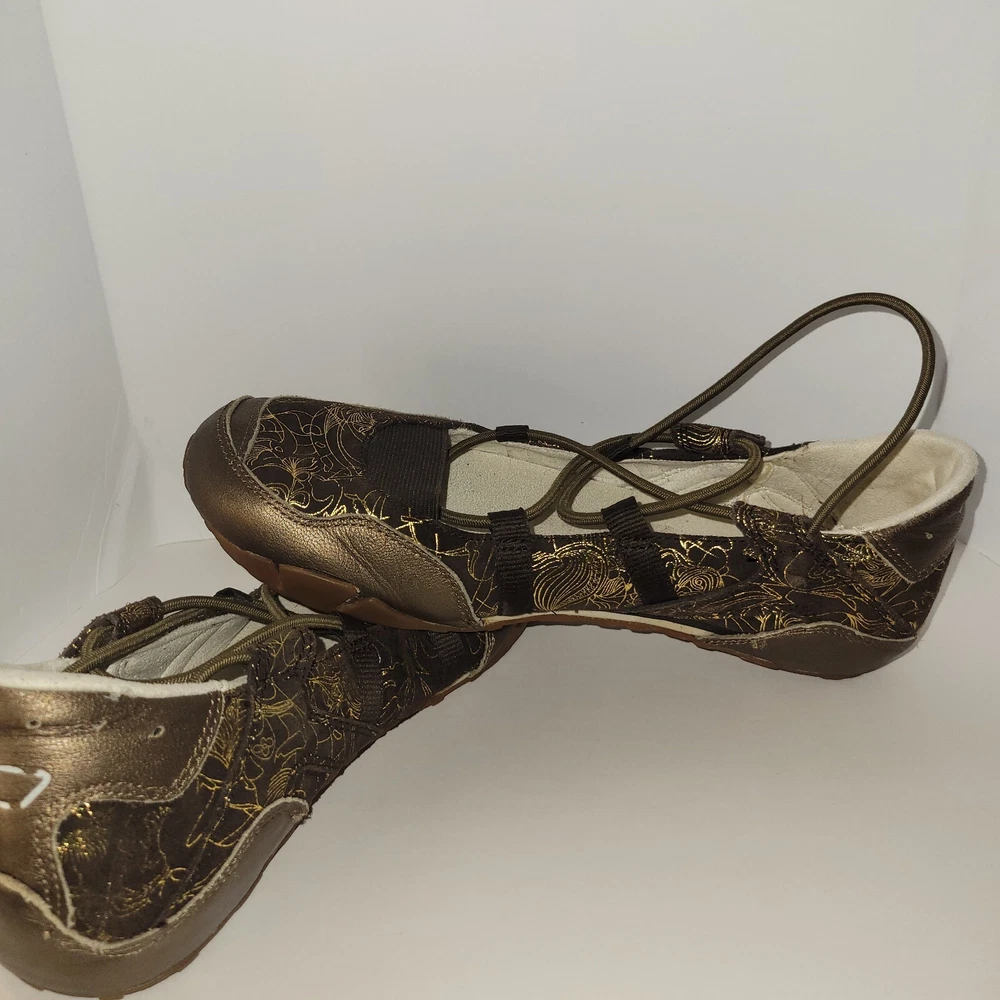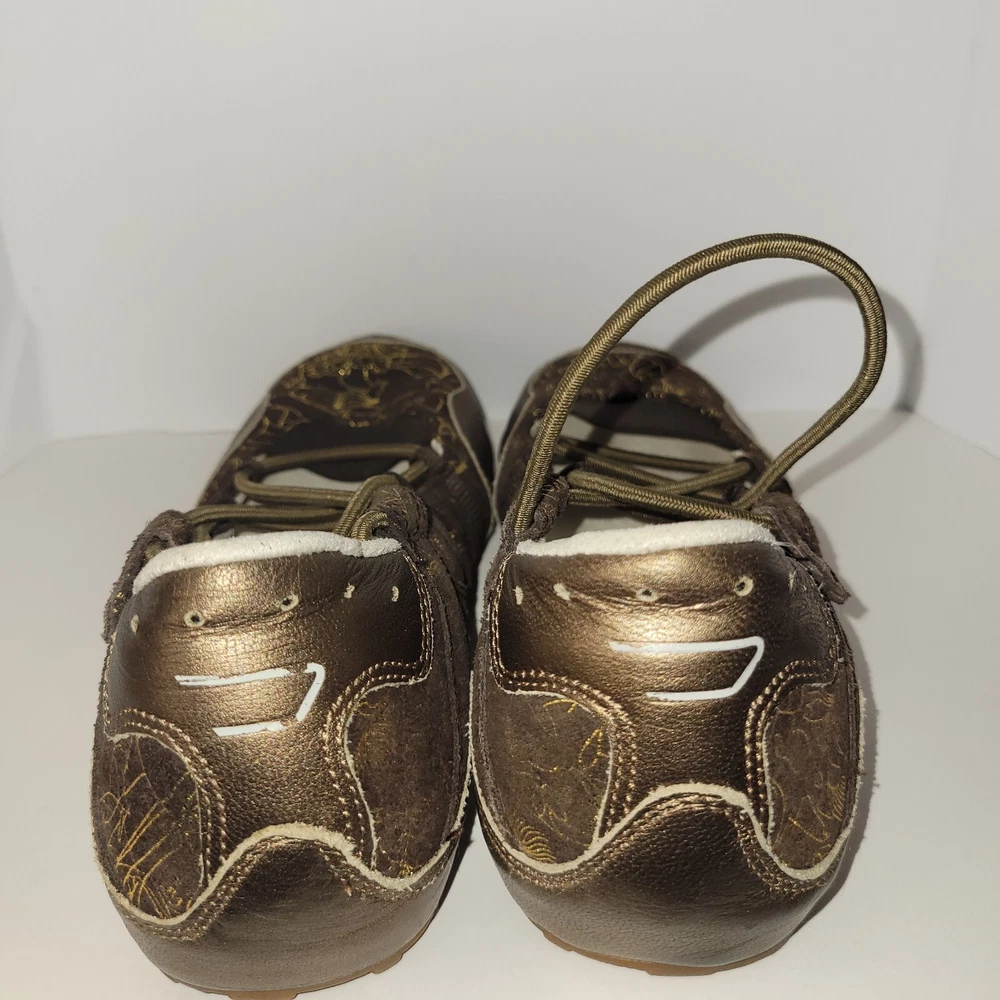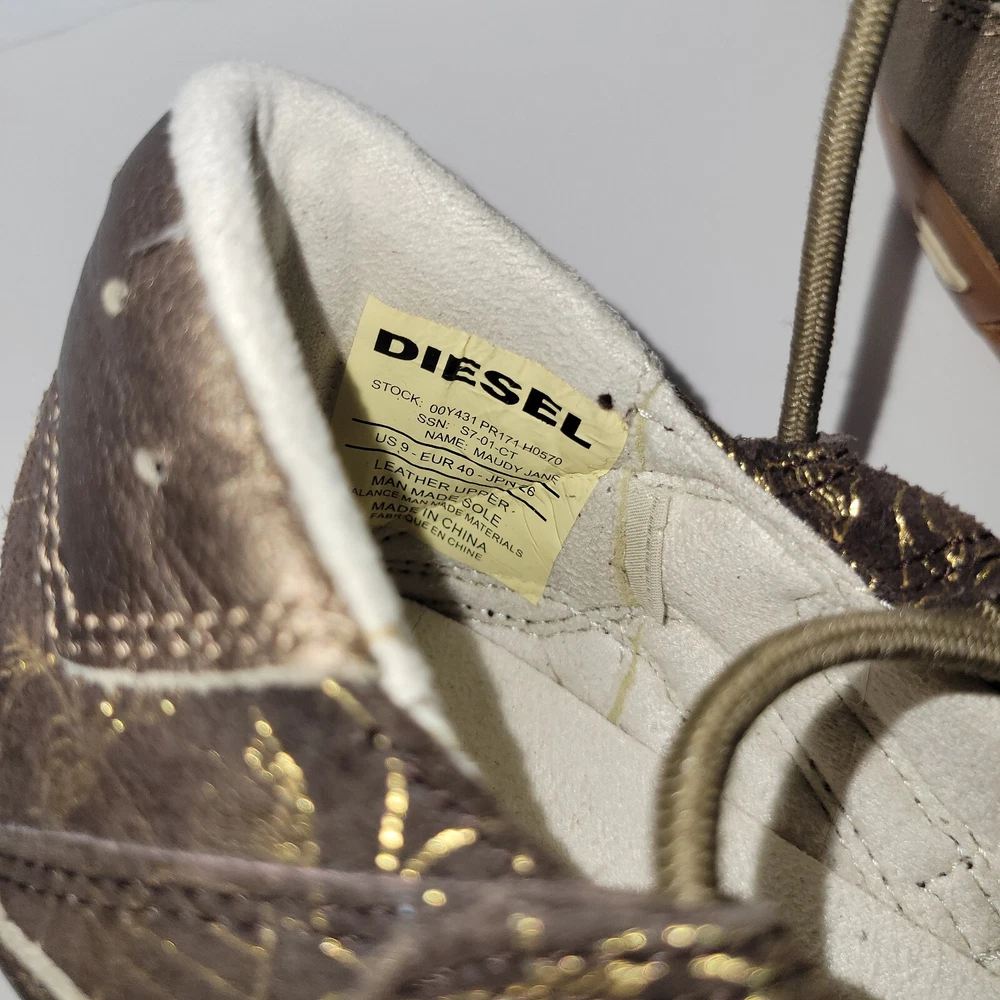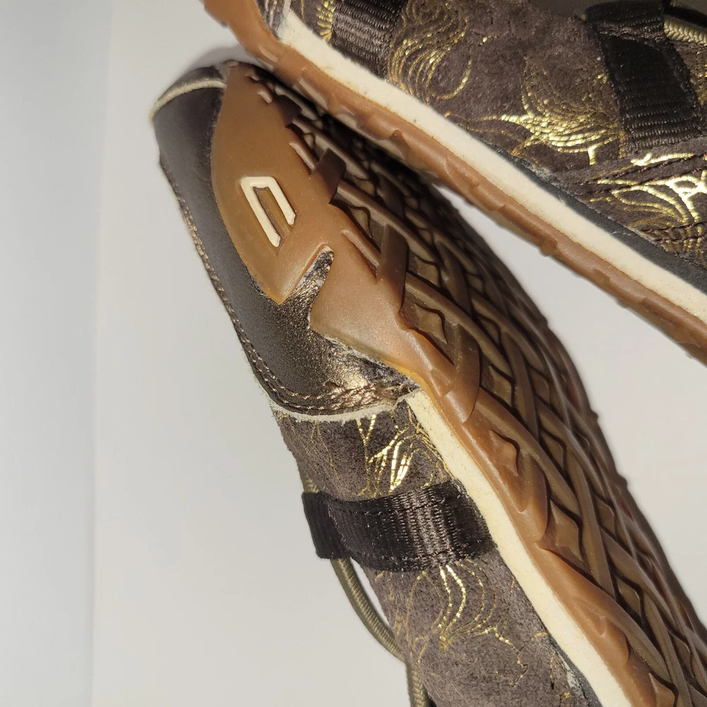 Elevate your casual look with these vintage Maudy Jane flats from Diesel. Crafted from a blend of leather and blended fabric, these round toe shoes feature a glittery geometric pattern, a pull-on closure, and a low-top shoe shaft style. The brown and gold color combination adds a touch of sophistication, while the lightweight, breathable, and comfortable foam insole makes them perfect for all-day wear. Ideal for summer, fall, and spring, these Mary Jane style shoes are suitable for a variety of occasions, including gym and training, cross-training, dance, crossfit, and hiking. They come in a standard shoe width, with a US shoe size of 9 and an EU shoe size of 38. The outsole is also made of leather, ensuring durability and traction. Get ready to rock the Y2K and 90s fashion with these Marie character inspired shoes.
