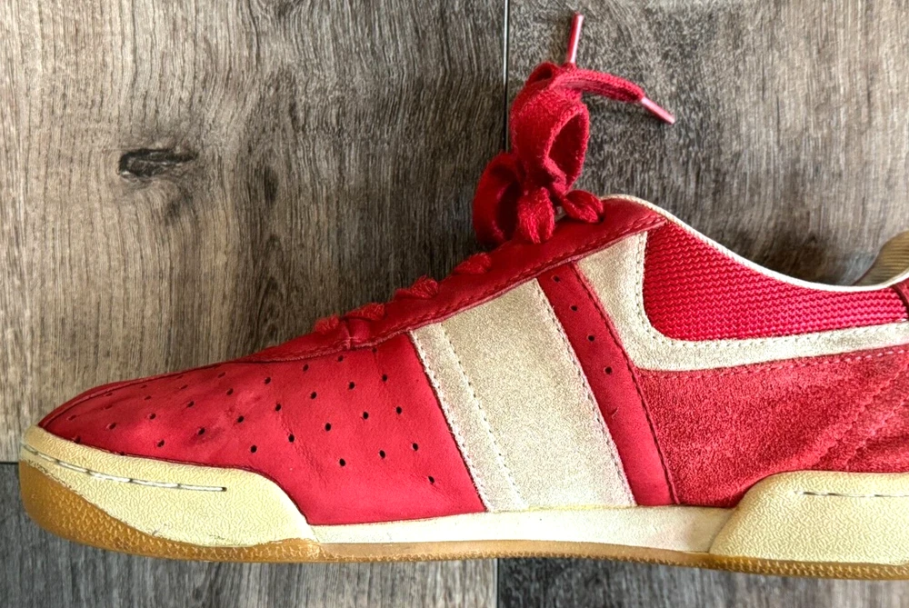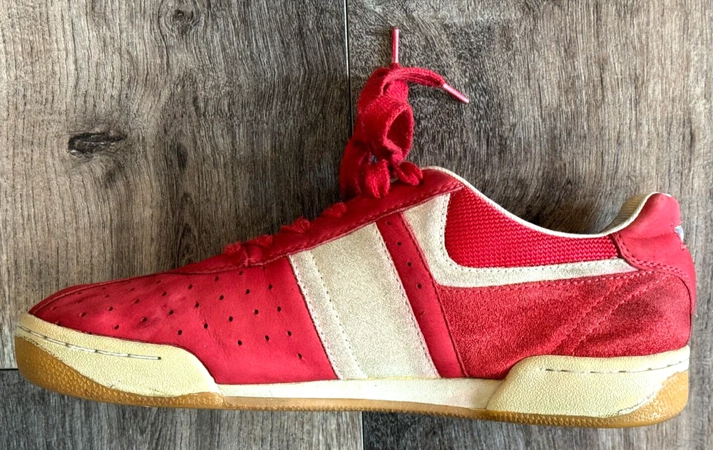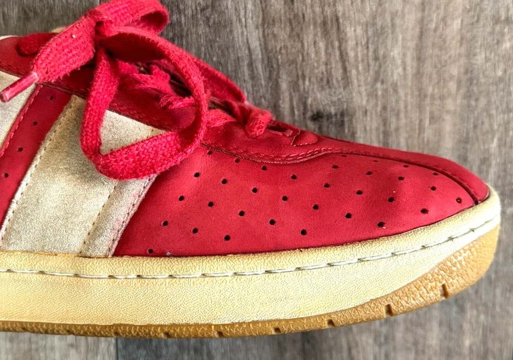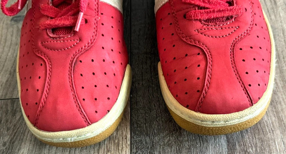 AMAZING DIESEL UPSCALE DESIGNER LUXURY, MEN MIXED MEDIA SUEDE LEATHER/CANVAS RED SNEAKERS WITH LOGO STITCHED DIESEL SHOE TONGUE, LOGO DIESEL STITCH BACK PANEL, SIDE EMBOSSED LOGO RUBBER SOLE, CUSTOM PERFORATED SUEDE LEATHER DETAIL AND LOGO EMBOSSED BOTTOM OUTER RUBBER SHOE SOLE. MADE OF FINE, TOP QUALITY SUEDE LEATHER AND CANVAS, IMMACULATE STYLING DETAIL AND IMPECCABLE CRAFTSMANSHIP. SIZE US 8.5