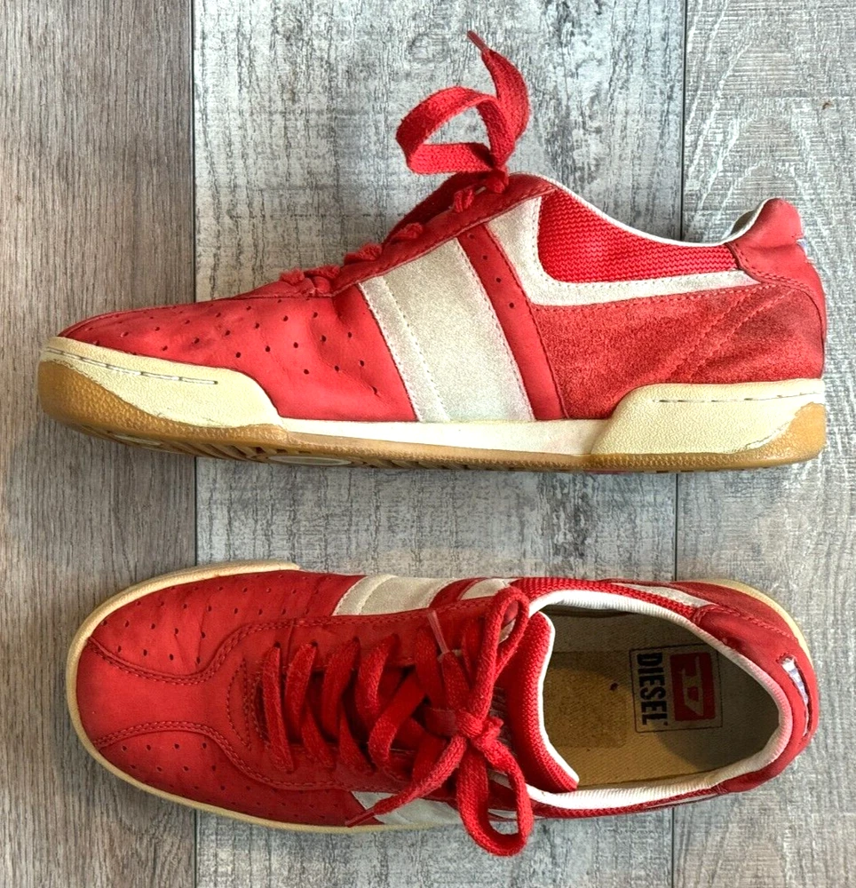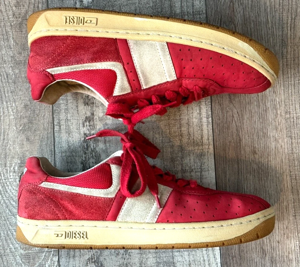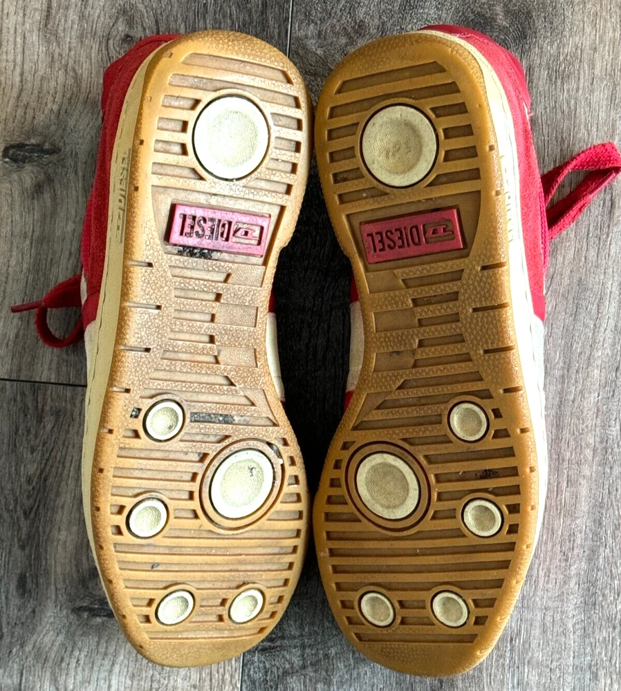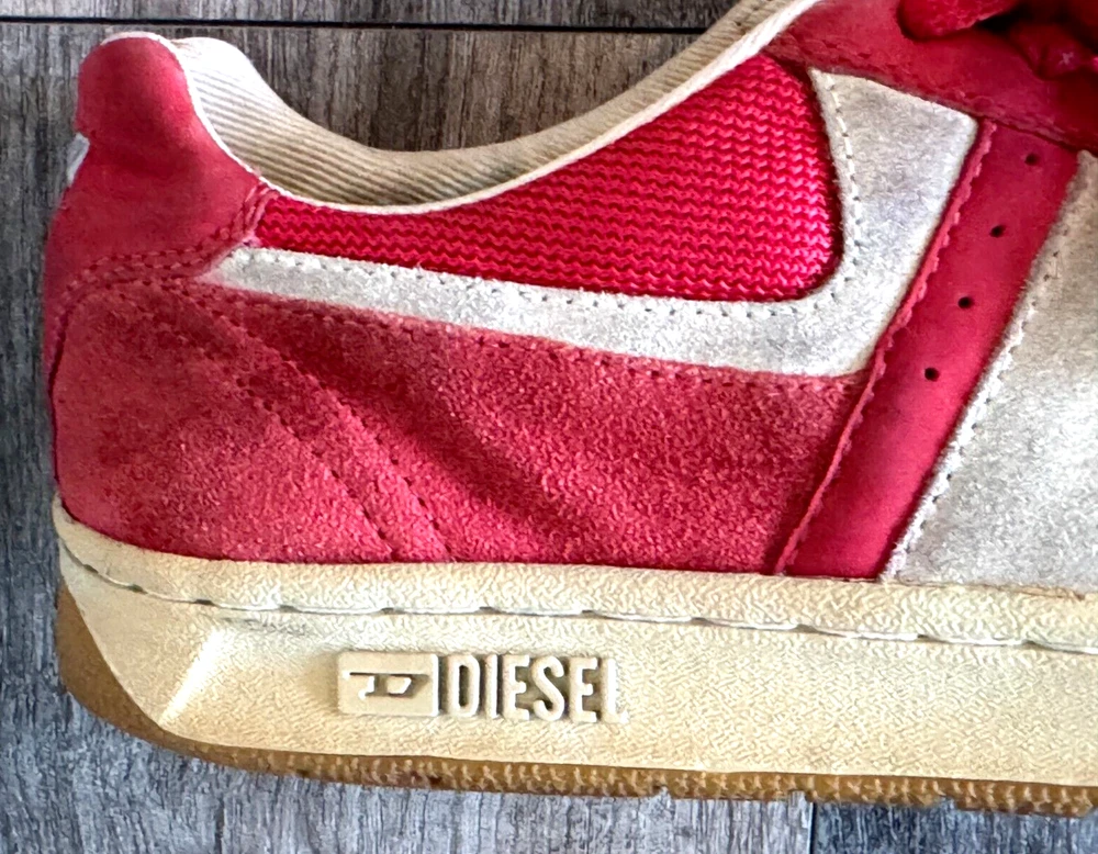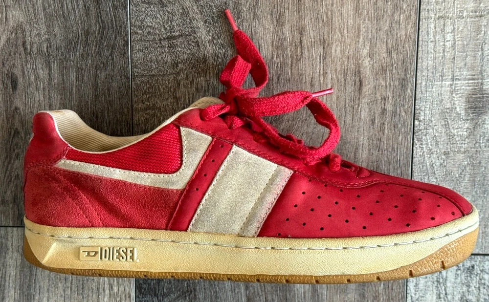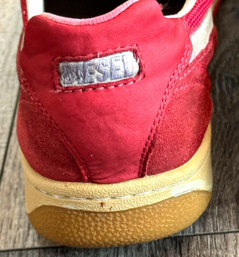 Pattern: SOLID MIXED MEDIA US Shoe Size: 8.5 Seller Notes: “GOOD CONDITION - WITH SOME NORMAL WEAR - SEE ALL PHOTOS FOR DETAILS!” Closure: Lace Up Style: UPSCALE DESIGNER LUXURY LACE UP Model: DIESEL LOGO SNEAKERS Character: UPSCALE DESIGNER LUXURY Department: Men Type: Dress Outsole Material: Rubber Insole Material: Fabric Features: LOGO DETAIL Color: Red Upper Material: MIXED MEDIA SUEDE LEATHER & CANVAS Brand: Diesel