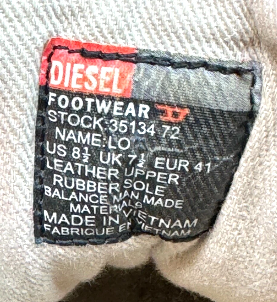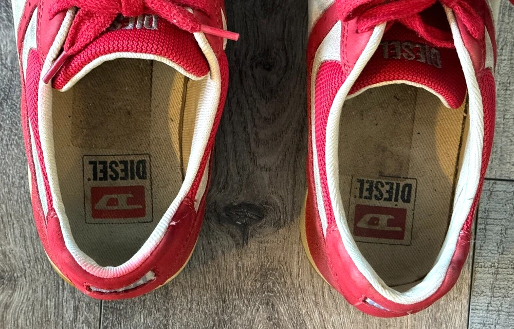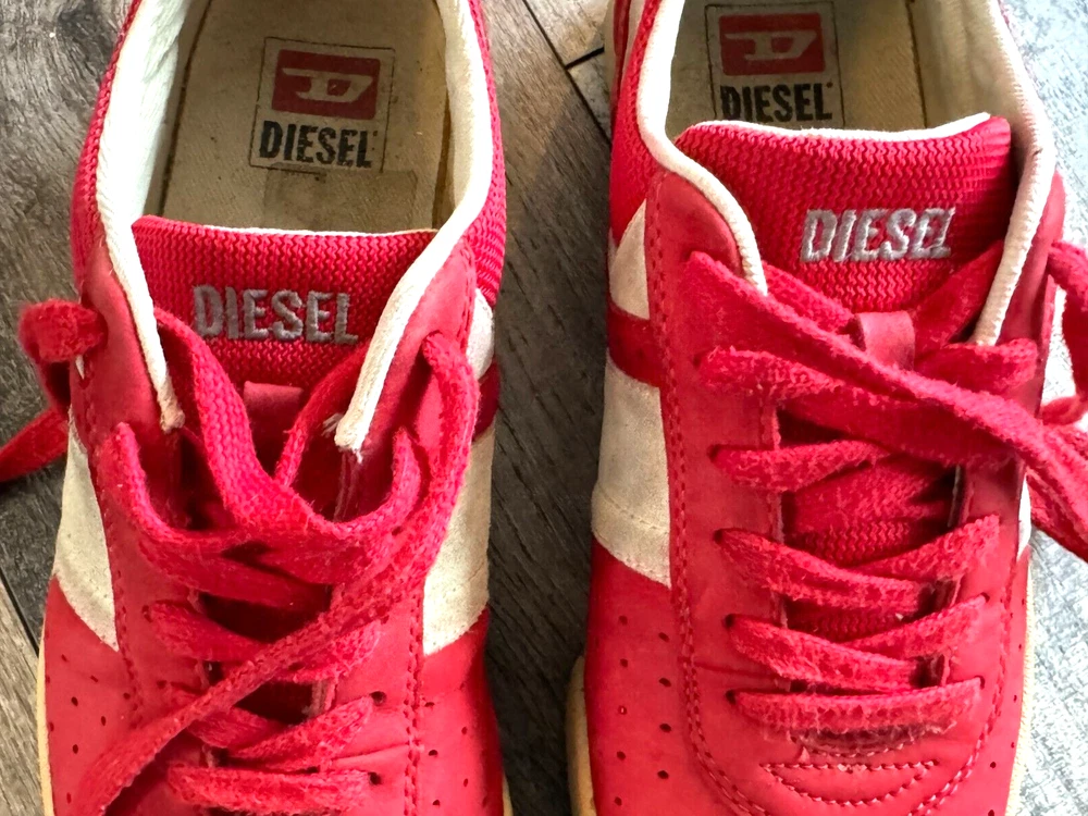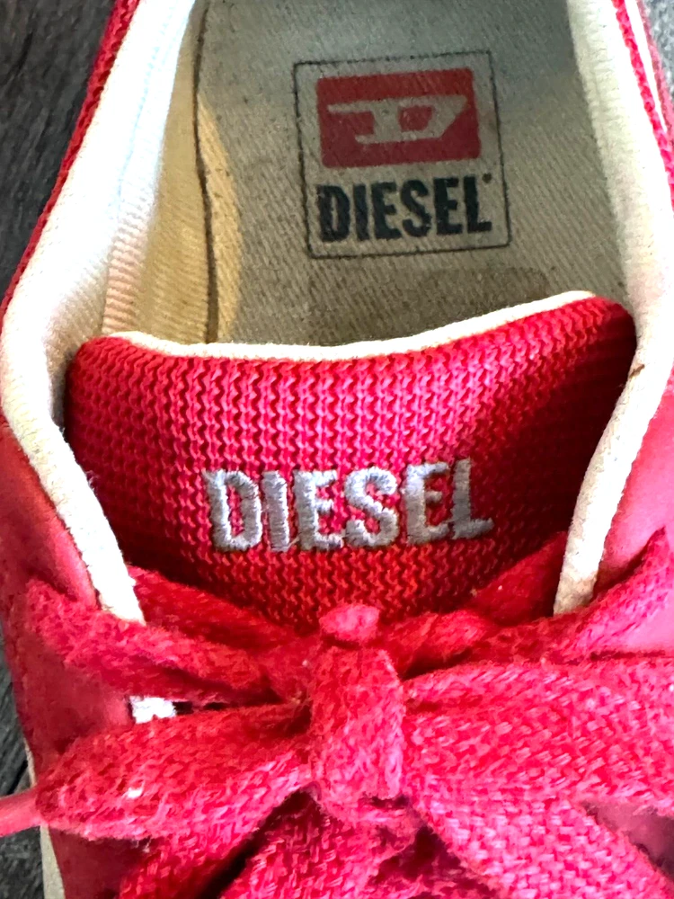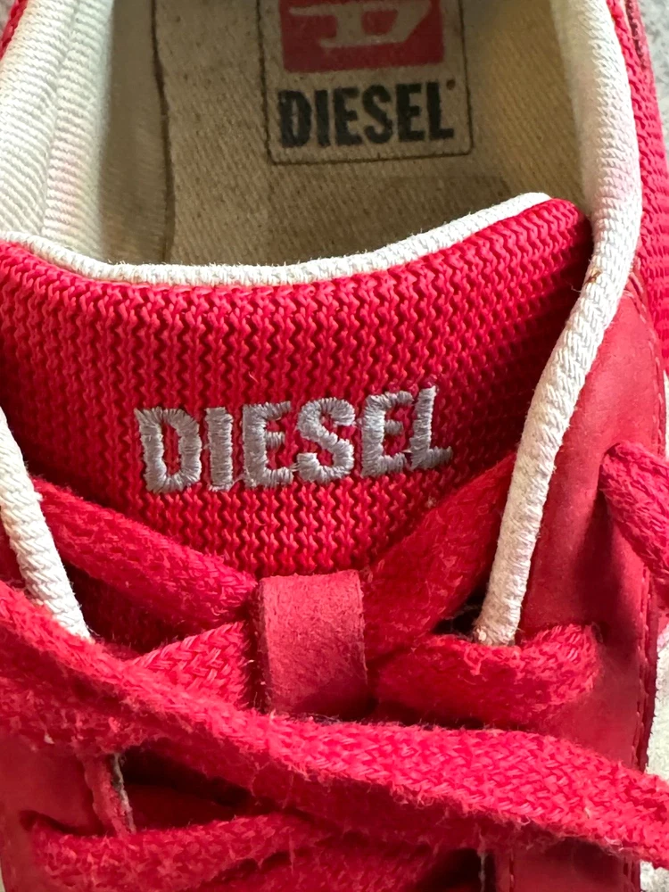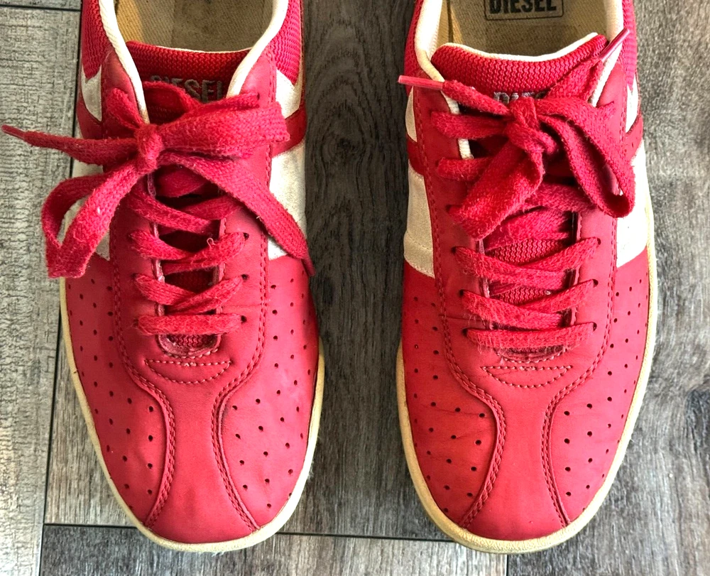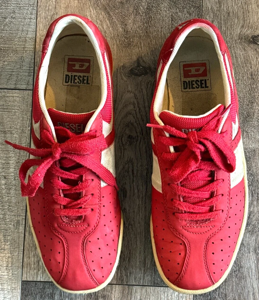Pattern: SOLID MIXED MEDIA US Shoe Size: 8.5 Seller Notes: “GOOD CONDITION - WITH SOME NORMAL WEAR - SEE ALL PHOTOS FOR DETAILS!” Closure: Lace Up Style: UPSCALE DESIGNER LUXURY LACE UP Model: DIESEL LOGO SNEAKERS Character: UPSCALE DESIGNER LUXURY Department: Men Type: Dress Outsole Material: Rubber Insole Material: Fabric Features: LOGO DETAIL Color: Red Upper Material: MIXED MEDIA SUEDE LEATHER & CANVAS Brand: Diesel