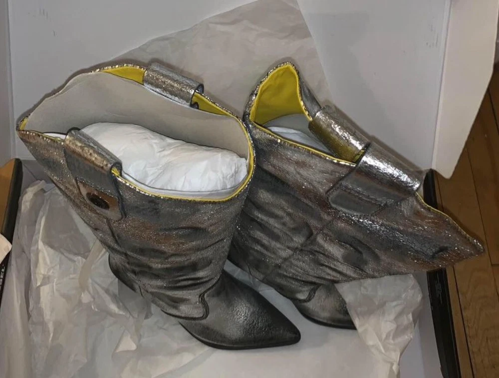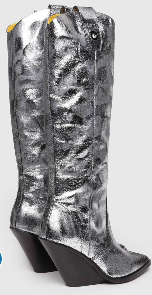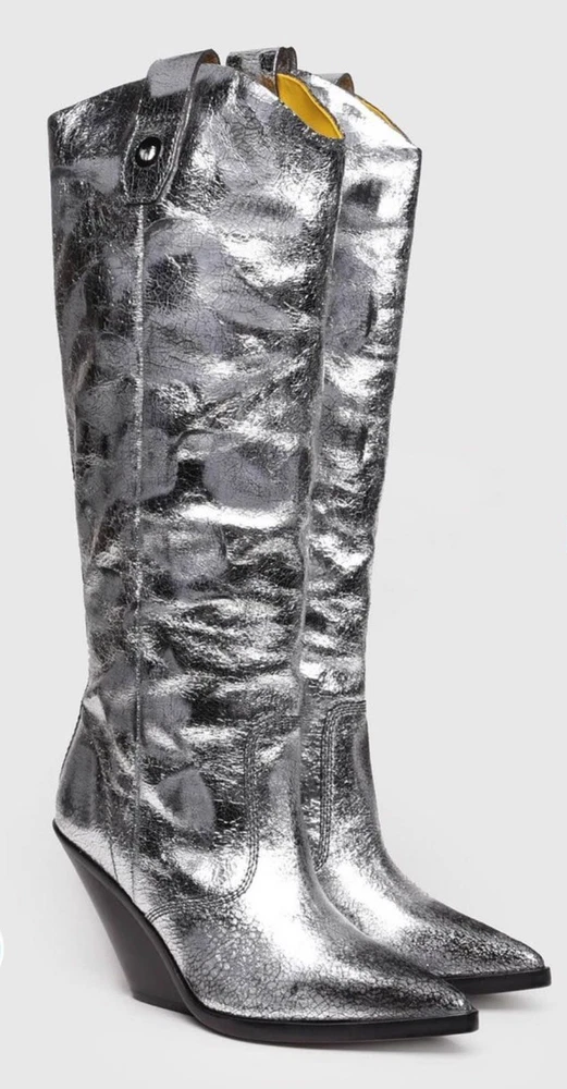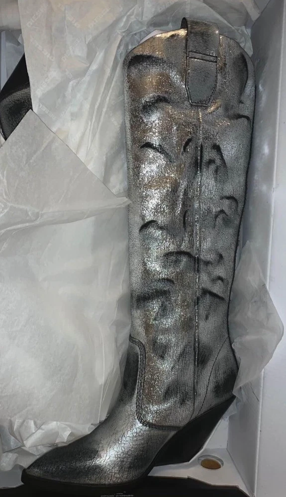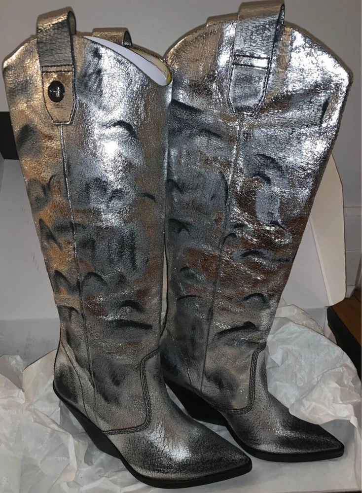 Step out in style with these brand new metallic silver cowboy boots from Cowboy. Made with laminated leather, these boots are perfect for any occasion. The boots are size 7 and are sure to make a statement with their eye-catching design. Whether you're dressing up for a night out or looking for a unique addition to your everyday wardrobe, these boots are the perfect choice. They are new without a box. Order now and add a touch of glamour to your shoe collection with these stunning Cowboy boots.