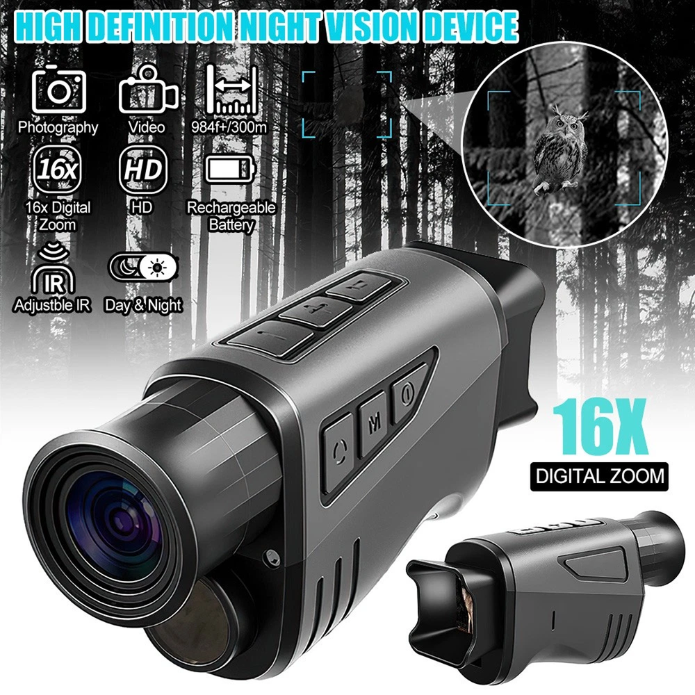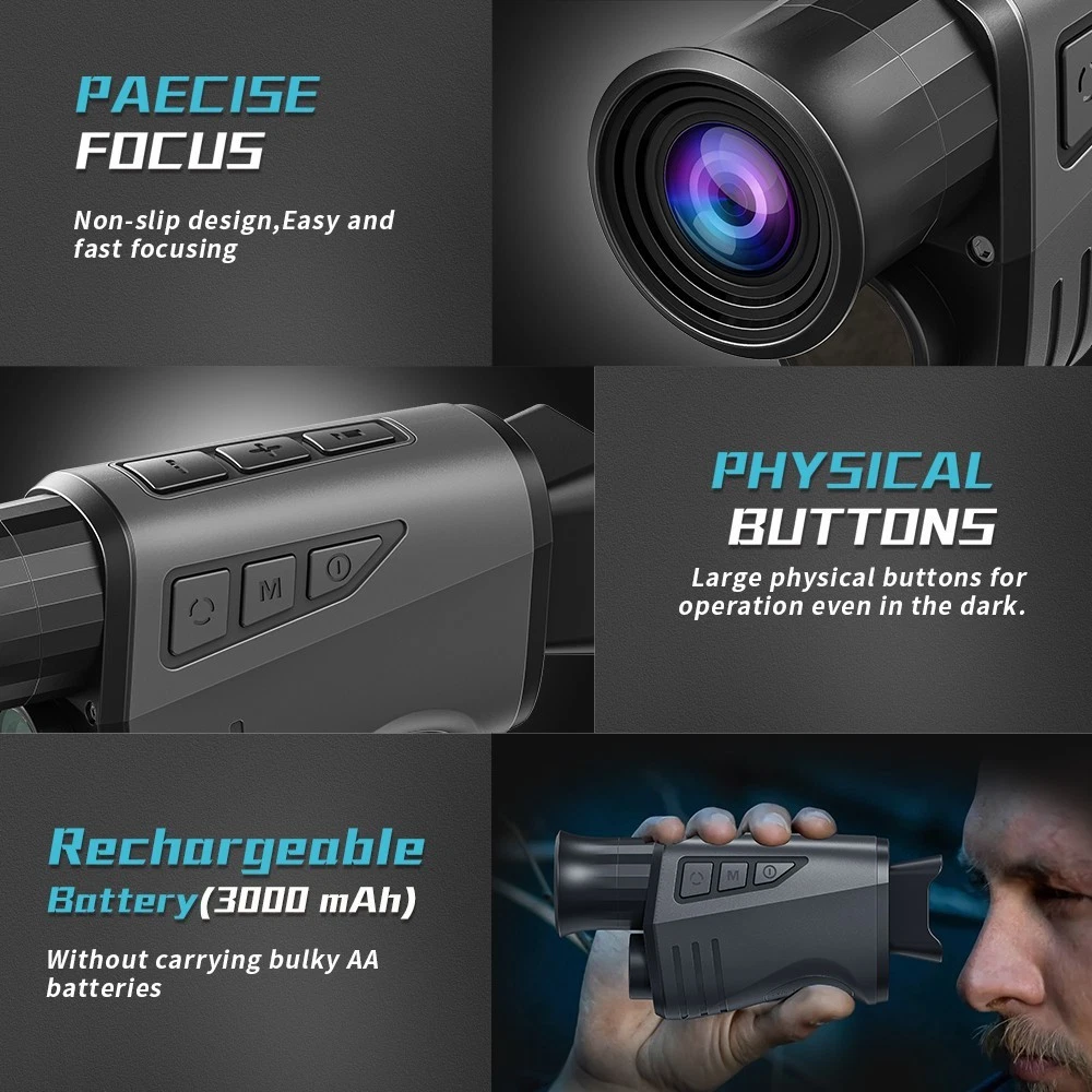 Features: 1.1080P & 12MP HD Clarity for Outdoor Exploration: Enhance your adventures with the night vision monocular, perfect for activities like wildlife observation, camping, or nighttime exploration. Capture every moment in HD video and photos, ensuring sharp, high-quality visuals even in the dark. Whether you're tracking animals in the wild or navigating a campsite, this monocular delivers the detail you need. 2.Clearly See in Darkness: The night vision goggles can take photos, record a video and playback, you can capture high definition photos & videos with its outstanding optical clarity in the daytime, low light, or night time. 3.16X Digital Zoom: The monocular night vision features a fully multi-coated 25mm objective lens technology, enhance 16X digital zoom to help focus distant objects quickly; Designed for hunters and wildlife enthusiasts, this monocular offers unmatched versatility. 4.1.54" Viewing Screen with Video Recording: The digital night vision infraed monocular supports real-time photographing, video recording (without sound records) and playback function. Video / pictures can be transmitted to the computer through the data cable or TF card to view and share! 5.Rechargeable Lithium Battery: Built-in a Li-ion rechargeable cell of 3000mAh. The Infrared high-tech night vision binoculars feature an 850 NM infrared illuminator which allows you to view animals in pitch dark for hours. 6.Highly Portable & Multifunctional: Compared with the bulky night vision googles or binoculars, this night vision monocular is highly portable, helps you focus on your target quickly and accurately with one hand; It supports installation on the tripod, compatible with Bushnell, firefield, sionyx and sightmark tripods. Specification: Image Size: 12MP/10MP/8MP/5MP/3MP Video Size: 1080P(1920X1080)/720P(1280X720) Aperture: 1/2.9 f=25mm Lens Angle: FOV=10°, diameter 25mm Display Screen: 1.54 inch IPS LCD Digital Zoom: 16X Storage Media: TF card, up to 32/64 GB Viewing Distance in full dark: 0.5M-300M Viewing Distance in weak light: 3M to Infinity IR LED: 3W/850nm USB Port: Type-C USB Power Source: 3000mah Built-In Lithium battery Operating Temperature: -10℃ to +60℃ Storage Temperature: -20℃ to +60℃ Mic/Speak: included Tripod compatible: Yes Dimension: approx.150*70*50mm Weight: approx.165g Package included:(Decide on your choice, thank you) 1X Night Vision Goggles 1X USB Cable 1X Cloth Bag 1X User Manual OR +/or 1x32GB TF card
