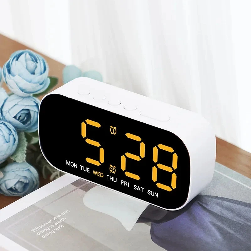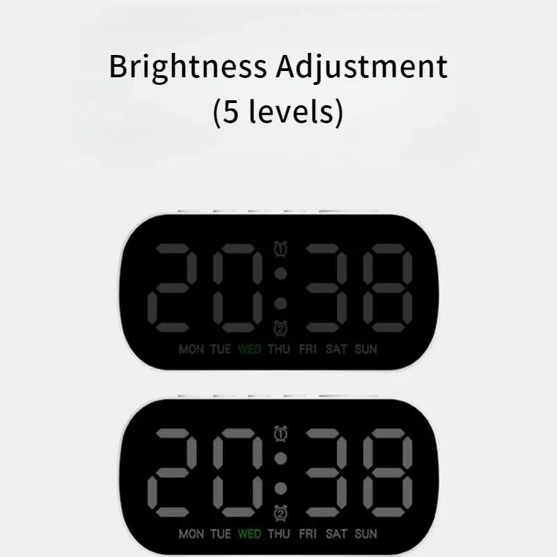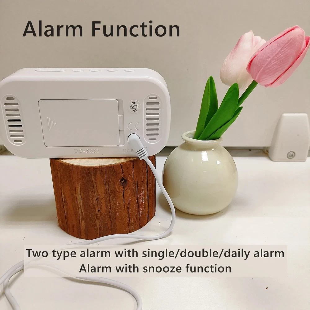 Function 1.Time/Date/Temperature /Week Display 2.Dual Alarm clock function Support to set Alarm frequency :1-5/1-6/1-7 1-5:Alarm rings from Monday to Friday 1-6:Alarm rings from Monday to Saturday 1-7:Alarm rings from Monday to Sunday 3.Brightness adjustment 5 Levels manual brightness adjustment 4.Two Display Modes Press “+” button more than 3s to switch display mode ①Time and week are displayed on the same screen ②Time/date/temperature+week circle display 5.Time memory function Available when powered by battery and plug in use at the same time 6.Night Mode If night mode is on,Brightness darkens at night (22:00-6:00) 7.12/24 hour format switch (1)Time Display (2)Press S button more than 3s 24Hr Display (3)Press UP or DOWN can switch to 12Hr 8.℃/℉ Switching Press “-” button more than 3s to switch ℃/℉ Product Show Material: plastic Power type: external power supply(USB powered) Color: black white light, black green light, black blue light,black pink light,black orange light USB Cable Length:100cm/39.37inch Package size: 14*8.5*4cm/5.5*3.3*1.6inch Product size: 13.5*6.5*3.5cm/5.1*2.6*1.4inch Package: 1xDigital Alarm Clock 1x100cm USB Cable 1xInstruction NOTE 1:Take the protective flim on Clock Screen,it will be brighter. NOTE 2:It will go off after 10 seconds when only powered by 3xAAA Battery(Not Included).Press any key to wake up the alarm clock . If you want screen always on, please plug in use.(USB Included but Plug Not Included)