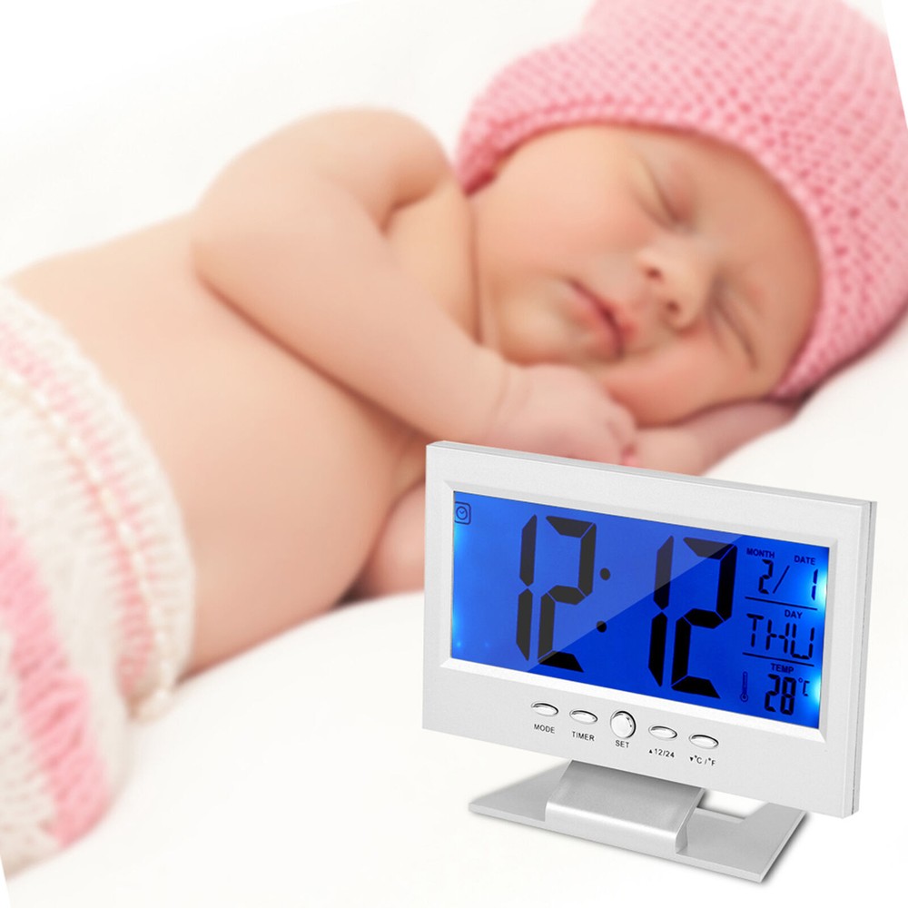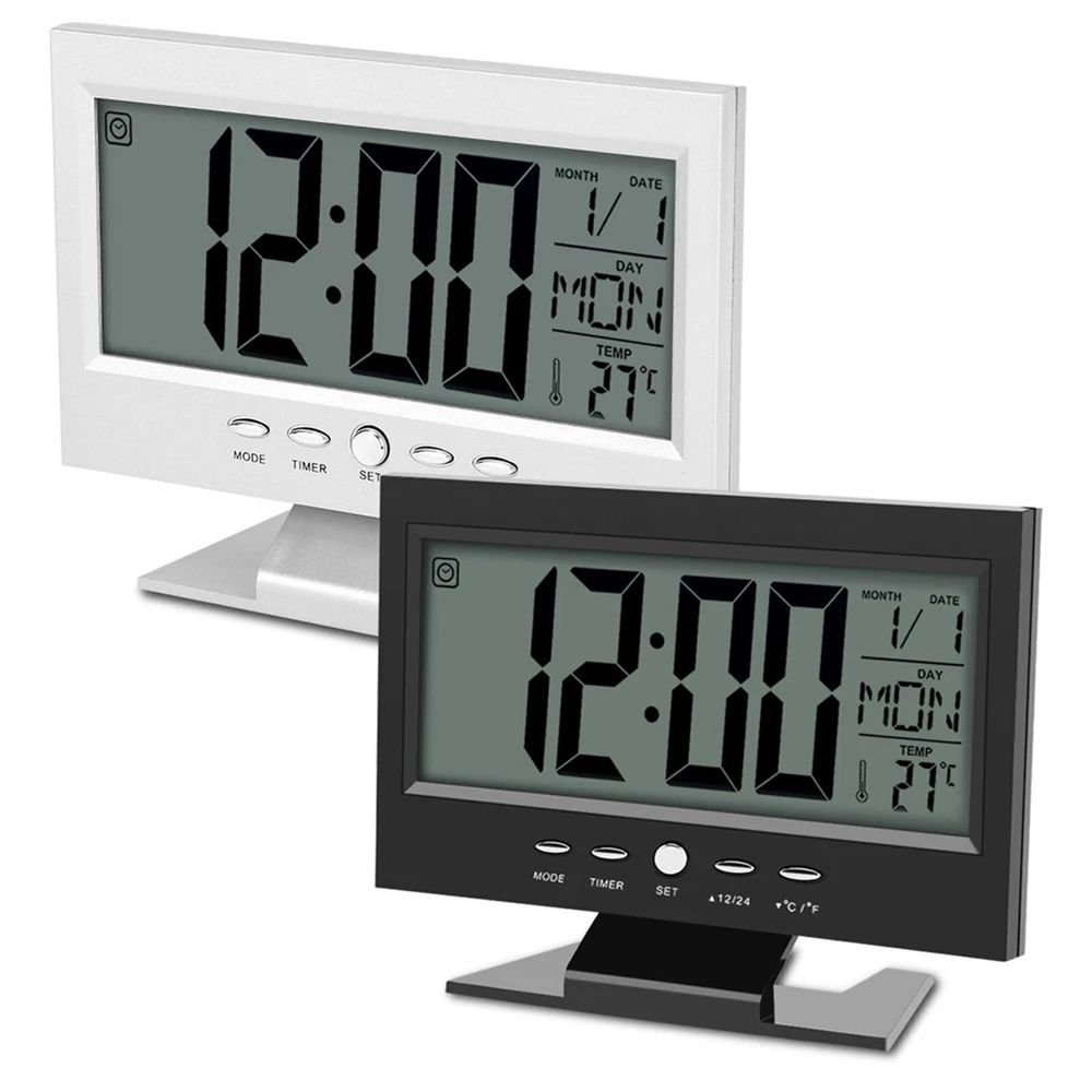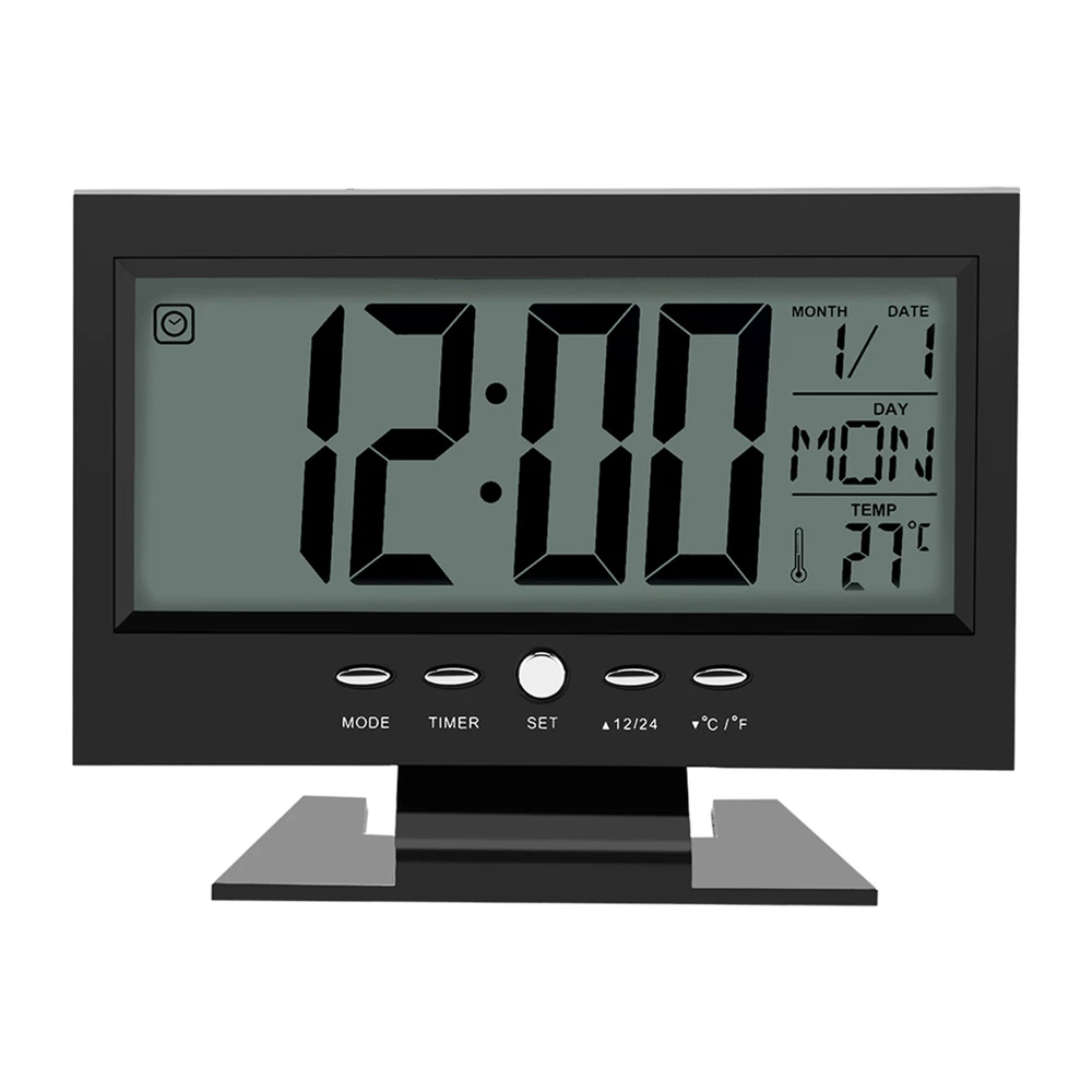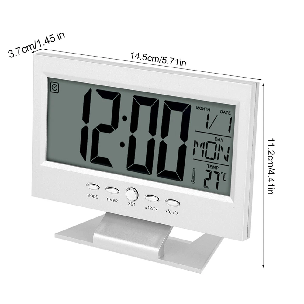 Feature: 1. Brand new and high quality multi‑functional electric clock with alarm and snooze function 2. Sound sensor light up function 3. Large LCD display will simultaneous display of date, time and week, and time can be shifted between 12:00 and 24:00 4. Real time display the temperature. °C and °F change freely for easy reading 5. Easy to use and place on the table or desk with the support bracket Specification: Features: Brand new and high quality multi-functional electric clock with alarm and snooze function. Sound sensor light up function. Large LCD display will simultaneous display of date, time and week, and time can be shifted between 12:00 and 24:00. Real time display the temperature. °C and °F change freely for easy reading. Easy to use and place on the table or desk with the support bracket. Specifications: Condition: Brand New Type: Clock Material: ABS Appearance: Rectangle Display Type: LCD Display Type: Number Display: Date, Time, Week, Temperature Battery: 2 * AAA Batteries(not included) Size: Approx. 14.5 x 11.2cm / 5.71 x 4.41'' Package included: 1 * Electric Clock Note: Please note that the new type and old type of this product will be sent randomly, and make sure you will not mind before ordering.