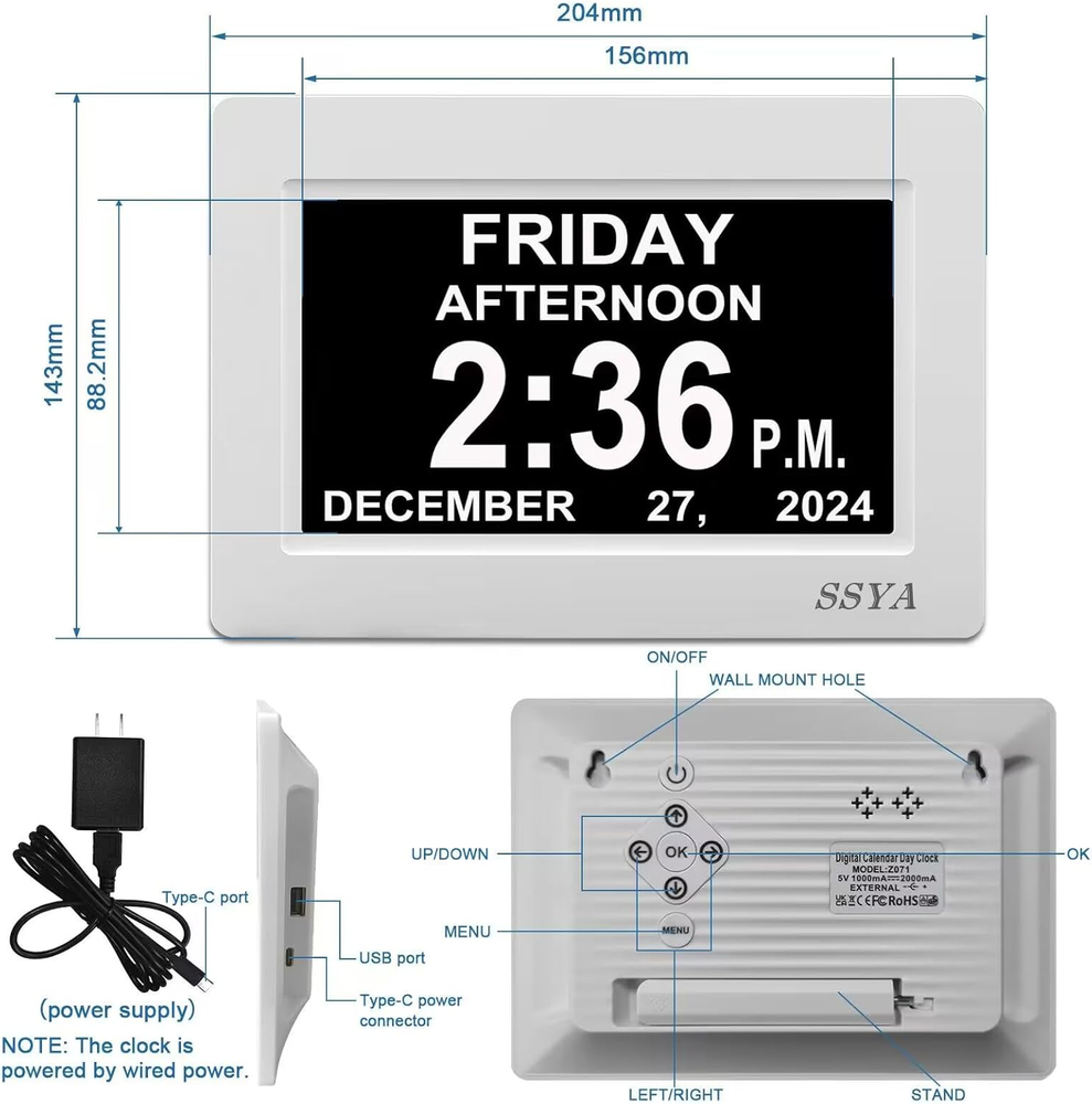 Store New Arrivals Add to Favorite View Feedback Contact Digital Calendar Alarm Clock - Dementia Clocks for Vision Impaired, Elderly, Memory Loss Clock with Non-Abbreviated Clock with Date and Day (7 Inch) Description Item model number Z071 Style Digital Number of Items 1 Power Source Corded Electric Dial Color black Country of Origin China Operation Mode Electrical Theme Plain Are Batteries Included Yes Room Type Bedroom, Living Room, Home Office Batteries required Yes Product Dimensions 8.03"W x 5.63"H Material Plastic Watch Movement Automatic Frame Material Plastic Age Range (Description) Adult Alarm Clock TRUE Number of Batteries 1 Lithium Metal batteries required. (included) Indoor/Outdoor Usage Indoor Item Weight 1 pounds Special Feature Corded Display Type Digital Mounting Type Tabletop, Wall Mount Color 7" White Shape Rectangular Batteries 1 Lithium Metal batteries required. (included) Size 7 inch Clear Display:7 inch 1024*600 HD LCD,Clearly spells out the time.no confusing abbreviations,easy to read. Time display: 6:00 am - 11:59 am (MORNING), 12:00 pm - 5:59 pm (AFTERNOON), 6:00 pm to 8:59 pm (EVENING), 9:00 pm to 11:59 pm (NIGHT) and 12:00 am - 5:59 am(PREDAWN). Easy to Use: Plug and play, Easy to set up. It can be hung on a wall or stood on a table. No matter which you choose, you can see the time, date, and day of the week very well. Auto Night Dimming: The clock auto dims during the night at 7:00 pm and brightens up during the day at 7:00 am. It also has the option to turn off the auto-dimming function,5 levels of brightness to choose from, which is convenient for the people who prefer high brightness all the day. Easy Alarm Settings:12 Alarm Modes Easy set , Single Alarm, Every Day, Weekdays Only, or Weekends Only. & tag: Meal, Medicine, Appointment and so on. It is quickly becoming a perfect Senior Care and In Home Care necessity. 8-Languages Support: The large display digital clock for seniors supports 8 languages (English, français, Deutsche, italiano, Polskie, Español, Nederlands, Cymraeg) and offers different time formats. Backup: In case of a power outage, it will be reset to the correct time and date when the power returns. The clock requires an A/C adapter (included) to operate. Best Clock for Senior Care: Many seniors are suffering from memory loss due to dementia, stroke, Alzheimer's or just advancing years.This clock can provide them with great help, buy an clock for your loved ones today! Product Description BEST CLOCK FOR SENIOR CARE: This unique High Resolution Digital Alarm Clock clearly spells out the time. no confusing abbreviations. Many seniors are suffering from memory loss due to just advancing years,Give the gift of confidence and happiness ! Different time display modes: The Day Clock can be set to 12-hour or 24-hour format, which can meet your various requirements. Also, different DATE display: Month-Day-Year/Day-Month-Year date display. 1.5 meter-cable: The Day Clock has 1.5 meter-cable which can be hung on a wall or stood on a table, nightstand, shelf or desk (using its pull-out stand). Anti-glare screen: 7-inch alarm clock clearly spells out the full DAY of the WEEK, MONTH and DATE in large, bold letters with no confusing abbreviations. The large anti-glare screen allows you to easily read the time from any angle across a large room. Great clock for the Vision Impaired, Elderly and Memory Loss People. Package Contents 1 x Digital Clock, 1 x Adapter, 1 x English User Manual, 1 x Holder High-resolution large clock: The clearest, easiest-to-read day clock. It's great for seniors who are faced with memory loss. The alarm clock is incredibly easy to set up and use. It is the best gift for your loved ones! Digital Photo Frame Support USB flash drive(Not Include) : The alarm clock can also serve as a digital photo frame with an USB flash drive (Not Included). insert the USB flash drive in the slot at the back of the clock. And it can play the photo video or music on your USB flash drive too. Let you enjoy your free time better. 12 Alarms options alarm clock 12 Alarms options and set tag:Meal,Medicine,Clinic,Shower,Gardening,Cleaning,Appointment and walk dog . It is quickly becoming a perfect Senior Care and In Home Care necessity. Auto Light Dimming The clock will auto light dimming from 7 pm to 7 am to help save energy and protect eyes. 8 languages clock It supports English, French, German, Italian, Spanish, Polish, Dutch and Welsh, which is suitable for transnational families. Wide in use Suitable for Home, Office, Bedroom. Perfect gift for elderly who suffer Vision Impaired, Elderly and Memory Loss. ABOUT US Customer service is our top priority! Please be sure to read the description thoroughly to make sure that this is the item you want before making a purchasing decision. If you have any questions about this item, please contact us via eBay messages before placing your order. We make every effort possible to accurately describe and depict the items. Please be aware that slight variations in color may be due to differences in lighting and computer monitor resolutions. All items are in stock at the time of listing; however, in the unlikely and unforeseen event that we are unable to fulfill your order through any of our networked warehouses, we will notify you as quickly as possible and offer you a 100% refund on your purchase. Thank you for shopping with us. We appreciate your business! SHIPPING We are always working hard to ensure your package arrives as soon as possible. Please understand that some factors like weather, high postal traffic, and the performance of shipping companies are outside of our control. We offer free shipping to all 50 states including Puerto Rico and ship within 3 business days, usually sooner. Shipping times to Contiguous U.S. vary from 1-4 business days depending on your location. Shipping times to Alaska, Hawaii, and Puerto Rico vary from 5-9 business days depending on the destination, however certain restrictions may a