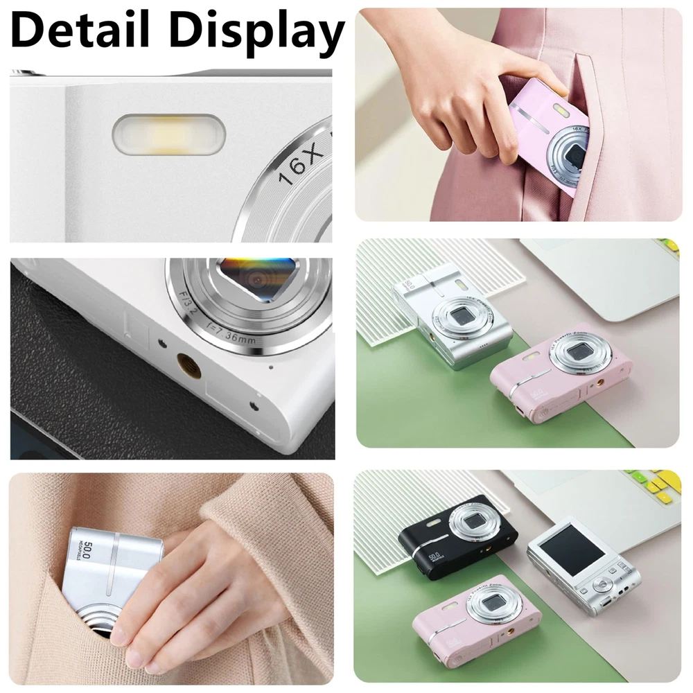 Digital Camera FHD 4K 50MP with 32GB Card 16X Zoom Anti Shake Compact Portable Small Cameras for Photography Point and Shoot Camera Gift for Student Teen Beginner (Pink) Description 50MP with 32GB Card 16X Zoom Anti Shake Compact Portable Small Cameras Features: Designed for Camera Beginner, teens, this point-and-shoot digital camera requires no intricate setup. With features like self-timer, continuous shooting, time-lapse, automatic recognition and various filters and scene modes etc. This digital camera fhd lets you unleash your creativity and take photos that stand out. Ideal for nurturing people's interest in photography and crafting delightful moments with family and friends. With 4K FHD video resolution and 50 Megapixels photo pixels, this compact digital camera 4k ensures high-quality image clarity and captures unforgettable moments. The point and shoot camera is equipped with an enlarged 2.4 inch HD display screen, which is convenient for taking photos and watching videos. A 32GB memory card is included to record the beautiful moments around you at any time. No need to remove the battery for charging; simply use the included USB-C charging cable to charge your compact digital camera anytime, anywhere. With its long-lasting, high-capacity battery, this small digital camera allows you to shoot all day without worrying about running out of power. Its pocket-sized, lightweight design ensures it's always ready to accompany you on your travels or daily adventures.You can also set automatic shutdown to save more power when you don't need to use it, Special mini-size design to easily handheld, this point and shoot camera is small and lightweight, fits in Teen's hands perfectly. Comes with a lanyard hang, it's portable for them to carry and move, and compact for travel and camp. The clear simple settings and features of the small portable digital camera make it easy for them to figure out and use themself. Use the provided USB-C cable to swiftly download pictures and videos to your computer. Alternatively, you can utilize an card reader to transfer pictures and videos from the camera's card to your phone for convenient sharing on social media.Whether it's Beginner's first camera or a thoughtful surprise for a best friend, it's an excellent choice. Ideal for gifting on holidays like Christmas and Thanksgiving, as well as for birthdays, graduations, and Valentine's Day. Package list:Digital camera, 32G SD card, lanyard, storage bag, Instruction manual, converter, cable, Card Reader Product Details: Compatible Mountings: Micro Four Thirds Aspect Ratio: 1.33:1 Photo Sensor Technology: CMOS Supported File Format: MP4 Image Stabilization: 光学 Optical Zoom: 4 x Expanded ISO Minimum: 100 Brand: Vlmazlm Model Name: digital cameras Maximum Webcam Image Resolution: 4096 MP Optical Zoom: 4 x Lens Type: Macro Battery Average Life: 2 Hours Photo Sensor Resolution: 4096 MP Sensor Type: CMOS Viewfinder: Optical Expanded ISO Maximum: 25600 Expanded ISO Minimum: 100 Battery Cell Type: Lithium Image stabilization: 光学 Battery Weight: 30 Grams Color: Pink Battery Capacity: 600 Amp Hours Skill Level: Novice Compatible Mountings: Micro Four Thirds Video Resolution: 1080p Number of Batteries: 1 9V batteries required. (included) Battery Type: Lithium Ion Photo Sensor Size: 1/3.2-inch Form Factor: Compact Flash Memory Type: SD Connectivity Technology: USB, Micro USB Built-In Media: Camera Body & Accessories Age Range Description: Youth Model Name: digital cameras Remote Included: No Model Number: 01215 Brand: Vlmazlm Are Batteries Included: Yes Display Type: LCD Screen Size: 2.4 Inches Auto Focus Technology: Contrast Detection Aspect Ratio: 1.33:1 Effective Still Resolution: 48 MP File Format: MP4 Handling We will ship all orders within 3 business days of payment. Delivery We do not ship outside of the Continental US. Feedback We take our reputation seriously, we buy and sell online, so we understand the value of trust. If you are unsatisfied with your order, please contact us and we will work with you to resolve it to your satisfaction.