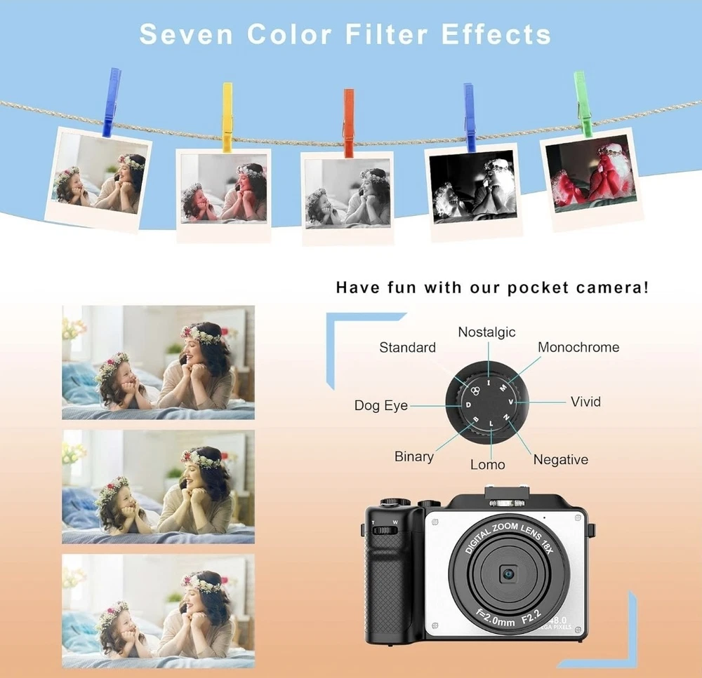 ✔【VLOGGING CAMERA WITH AUTO FOCUS & ANTI-SHAKE】Our digital camera delivers high-bit-rate 4K-resolution video and clear image at 48MP without missing any details. The 4k camera also supports 18X digital zoom. By just one-click you can take real auto focus and anti-shake photos. The free hand strap which you can wrap your finger around comfortably helps prevent dropping the video camera. ✔【A CREATIVE POINT AND SHOOT CAMERA!】The multifunction handgrip features an ergonomic design that puts important functions such as focus zoom and shutter buttons at your fingertips. There's even a scroll wheel under your index finger for making quick 7 color filters adjustments, so you get total creative freedom to make more funny pictures! ✔【TRUVIEW ORIGINAL WIDE ANGLE LENS】With the built-in wide-angle lens, this camera for photography is able to capture 45% more picture with every snap. There is no need to take heavy add-on lens, which greatly reduces your travel burden. With this 4k camera, you can shoot stunning photos of people, landscapes, selfies and more! ✔【WIFI & 9-SQUARE GRID FUNCTION】Pictures and videos can be instantly shared online with mobile phones through the Wi-Fi function, allowing friends to share your happiness in the first time without waiting any longer. The 9-square grid function enables you to take ideal pictures with better proportions, which makes you act like a professional photographers! ✔【BEST CAMERA FOR YOUTUBE】The YouTube camera for vlogging can be used as webcam for live streaming. Our vlogging camera also supports time-lapse, loop video, and slow video features. Compact but powerful for its size, this small camera is great for keeping in your pocket on those occasions when you want to travel light without having to take loads of lenses. We also offer you a 32G TF card so that you can use it the moment you receive it.