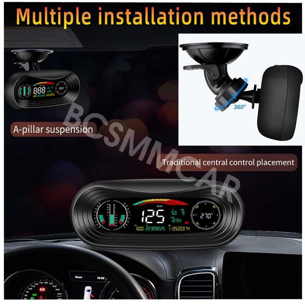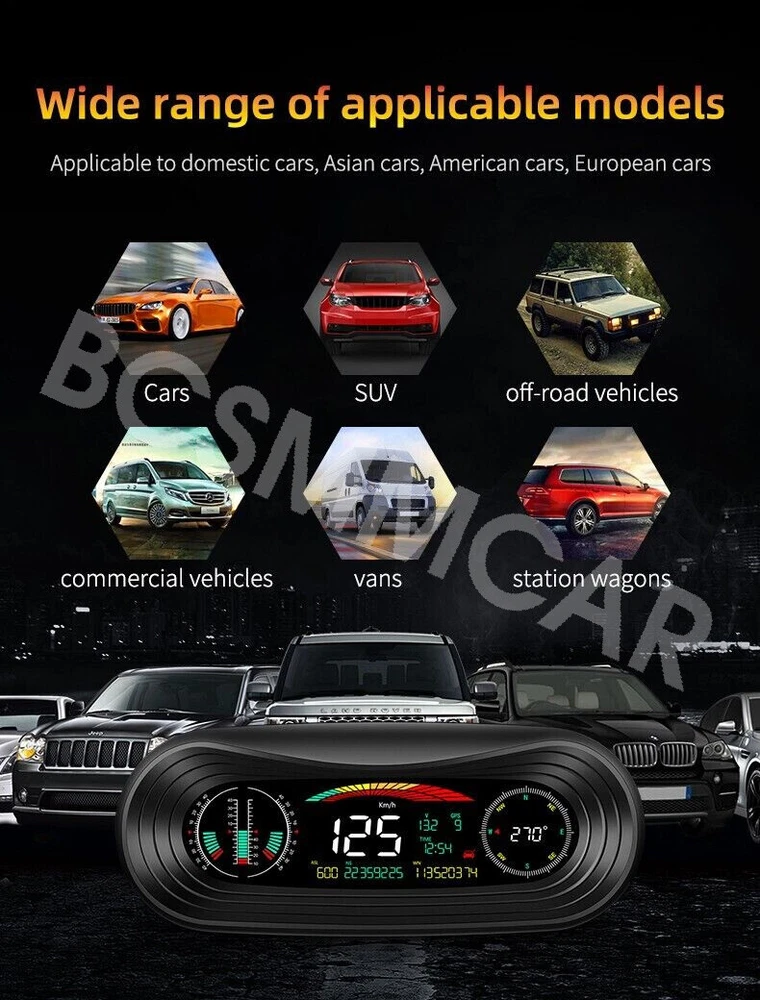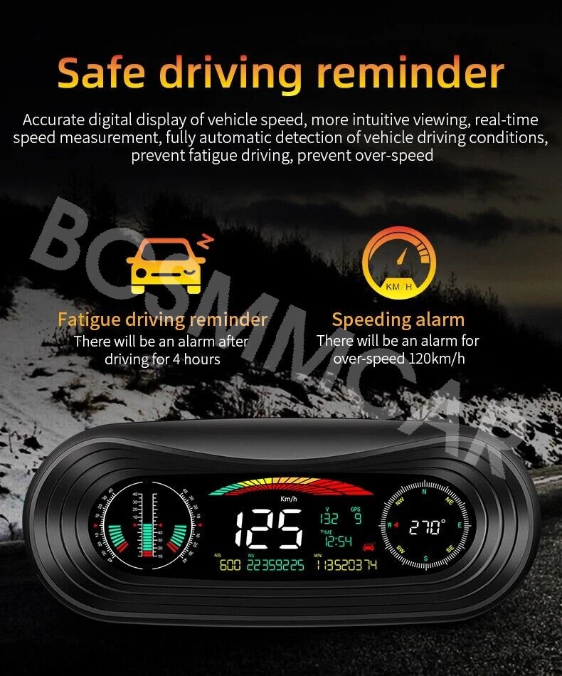 Product Description Car Compass HUD Head-Up Display Smart GPS Slope Meter Speedometer Overspeed Warning Gauge Digital Multi-Function Alarm Tool Add our listing to Watchlist Or Add to Cart , you will get more discount Main feature 1. Left tilt Slope meter 2. Front and rear Slope meter 3. Right Slope meter 4. Decorative icons 5. Voltage display 6. GPS number: flashing means searching for satellites, GPS light stops flashing and displays the number of satellites after the satellites are found 7.Driving direction: Driving direction indication:W=West, N=North, S=South, E=East when the vehicle speed >5KM / H (NW: Northwest NE: Northeast SW: Southwest SE: Southeast) 8. Altitude 9. Speed 10. Longitude display,driving time 11. The clock defaults to the UTC 8, and the time in the UTC 8 is displayed after the satellite signal is searched (adjust the local time zone according to the location) 12. Latitude display,mileage display 13. Fatigue driving icon, flashing reminder after accumulated driving for >4 hours 14. Compass direction scale Package included 1 x GPS Slope Meter 1 x Manual 1 x Suction cup holder 1 x Car Charger +USB cable Payment Returns Contact Us Shipping We accept payment by PayPal only ! Payment should be completed within 5 days after buyer places the order,or else an unpaid case will be opened in order to cancel the transaction. If you can not pay in time, please contact us. e-check from PayPal will only be processed once the payment clears. All of the items will be shipped to buyer's EBAY address,please confirm your address on Ebay before you buy.Your order will be usually shipped out the same or next business days once the payment is made and cleared. 30-day Warranty with Exchange for defective, malfunctioned, incorrect or parts-missing items. Please notify us and return the item with all parts and accessories packed and marked "FOR EXCHANGE" within 14 days of receipt. If defective, malfunctioned or parts-missing items are no longer available, a refund may be issued. All returning postage costs will be the responsibility of the buyers under all circumstances. If you encounter any problems about anything, please feel free to contact us and we will do our best to assist you solve the issue. If you are not satisfied in anyway, please feel free to let us know and give us a second chance to correct it before you decide to leave any neutral or negative feedback. Please contact us through eBay link if you have any questions. We will reply you within 24- 48 hours. Please check you spam mail if no response for 48 hours. All items will be checked before packing. All items are new and of high quality. Item will be shipped within 1 business days upon receipt of payment, excluding weekends and public holidays. If to USA,we will ship your order by USPS,it will take about 8-12 working days to you,and you can track it on line. If to other country,we will ship your order by China Post or Singapore Registered Air Mail,it will take about 14-21 working days to you,you aslo can track it on line. Delivery time is about 14-28 business days and it may take up to 8 weeks . Payment We accept payment by PayPal only ! Payment should be completed within 7 days after buyer places the order,or else an unpaid case will be opened in order to cancel the transaction. If you can not pay in time, please contact us. eCHECK from PayPal will only be processed once the payment clears. All of the items will be shipped to buyer's EBAY address,please confirm your address on Ebay before you buy.Your order will be usually shipped out the same or next business days once the payment is made and cleared. Returns 30-day Warranty with Exchange for defective, malfunctioned, incorrect or parts-missing items. Please notify us and return the item with all parts and accessories packed and marked "FOR EXCHANGE" within 14 days of receipt. If defective, malfunctioned or parts-missing items are no longer available, a refund may be issued. All returning postage costs will be the responsibility of the buyers under all circumstances. Contact Us If you encounter any problems about anything, please feel free to contact us and we will do our best to assist you solve the issue. If you are not satisfied in anyway, please feel free to let us know and give us a second chance to correct it before you decide to leave any neutral or negative feedback. Please contact us through eBay link if you have any questions. We will reply you within 24- 48 hours. Please check you spam mail if no response for 48 hours. Shipping All items will be checked before packing. All items are new and of high quality. Item will be shipped within 1 business days upon receipt of payment, excluding weekends and public holidays. If to USA,we will ship your order by USPS,it will take about 7-10 working days to you,and you can track it on line. If to other country,we will ship your order by China Post or Singapore Registered Air Mail,it will take about 14-21 working days to you,you aslo can track it on line. Delivery time is about 14-28 business days and it may take up to 8 weeks . Welcome to our Store ~