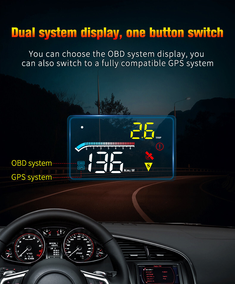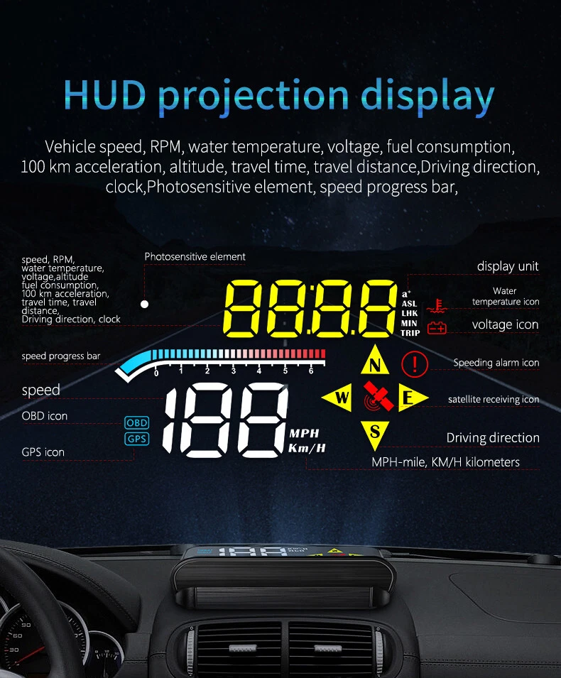 Product Description Multifunctional 3.5 Inch Car HUD Head-up Display OBD2 GPS Speedometer Overspeed Alarm Projection On Car Glass Description: HUD short for Head Up Display,the main function is to reflect the car dashboard information (e.g. speed,RPM,water temperature,voltage,trip distance etc) Main Function: OBD System (For OBD2 car) Functions:Vehicle speed,engine RPM,water temperature,voltage,fuel consumption,altitude,clock, travel time,travel distance,number of compass satellites. GPS System (For all car) Functions:Speed,Voltage,Compass,Number of Satellites,Speed Icon,Decorative bar Features: 1. The hood design, shields the excess light of the head-up display, and does not dazzle the eyes when driving at night. 2. 6 alarm modes: overspeed alarm, speed alarm, voltage alarm, water temperature alarm, fault code clearing, fatigue driving reminder. 3. Support two power supply modes: OBD Cable supply and USB Cable supply. 4. Automatically turn on/off, start and stop with the car, automatically adjust the brightness, 3.5-inch large screen. Specification: Color: Black Material: PC/ABS Size: 90*55*30mm(3.5-inch) Working voltage: 11V~18Vdc (12Vdc/200mA) Please use the USB cable if car voltage > 24V Package Included: 1*Car HUB Displayer 1*OBD2 Cable 1*USB Cable 1*Reflective film 1*English Manual 1*Sticker Note: This product is a dual system:Users can freely choose the mode(press the '+' key to select OBD or GPS system) before the OBD icon on screen stop to flash,it will automatically save and enter your last selected option. Payment Returns Contact Us Shipping We accept payment by PayPal only ! Payment should be completed within 5 days after buyer places the order,or else an unpaid case will be opened in order to cancel the transaction. If you can not pay in time, please contact us. e-check from PayPal will only be processed once the payment clears. All of the items will be shipped to buyer's EBAY address,please confirm your address on Ebay before you buy.Your order will be usually shipped out the same or next business days once the payment is made and cleared. 30-day Warranty with Exchange for defective, malfunctioned, incorrect or parts-missing items. Please notify us and return the item with all parts and accessories packed and marked "FOR EXCHANGE" within 14 days of receipt. If defective, malfunctioned or parts-missing items are no longer available, a refund may be issued. All returning postage costs will be the responsibility of the buyers under all circumstances. If you encounter any problems about anything, please feel free to contact us and we will do our best to assist you solve the issue. If you are not satisfied in anyway, please feel free to let us know and give us a second chance to correct it before you decide to leave any neutral or negative feedback. Please contact us through eBay link if you have any questions. We will reply you within 24- 48 hours. Please check you spam mail if no response for 48 hours. All items will be checked before packing. All items are new and of high quality. Item will be shipped within 1 business days upon receipt of payment, excluding weekends and public holidays. If to USA,we will ship your order by USPS,it will take about 8-12 working days to you,and you can track it on line. If to other country,we will ship your order by China Post or Singapore Registered Air Mail,it will take about 14-21 working days to you,you aslo can track it on line. Delivery time is about 14-28 business days and it may take up to 8 weeks . Payment We accept payment by PayPal only ! Payment should be completed within 7 days after buyer places the order,or else an unpaid case will be opened in order to cancel the transaction. If you can not pay in time, please contact us. eCHECK from PayPal will only be processed once the payment clears. All of the items will be shipped to buyer's EBAY address,please confirm your address on Ebay before you buy.Your order will be usually shipped out the same or next business days once the payment is made and cleared. Returns 30-day Warranty with Exchange for defective, malfunctioned, incorrect or parts-missing items. Please notify us and return the item with all parts and accessories packed and marked "FOR EXCHANGE" within 14 days of receipt. If defective, malfunctioned or parts-missing items are no longer available, a refund may be issued. All returning postage costs will be the responsibility of the buyers under all circumstances. Contact Us If you encounter any problems about anything, please feel free to contact us and we will do our best to assist you solve the issue. If you are not satisfied in anyway, please feel free to let us know and give us a second chance to correct it before you decide to leave any neutral or negative feedback. Please contact us through eBay link if you have any questions. We will reply you within 24- 48 hours. Please check you spam mail if no response for 48 hours. Shipping All items will be checked before packing. All items are new and of high quality. Item will be shipped within 1 business days upon receipt of payment, excluding weekends and public holidays. If to USA,we will ship your order by USPS,it will take about 7-10 working days to you,and you can track it on line. If to other country,we will ship your order by China Post or Singapore Registered Air Mail,it will take about 14-21 working days to you,you aslo can track it on line. Delivery time is about 14-28 business days and it may take up to 8 weeks . Welcome to our Store ~