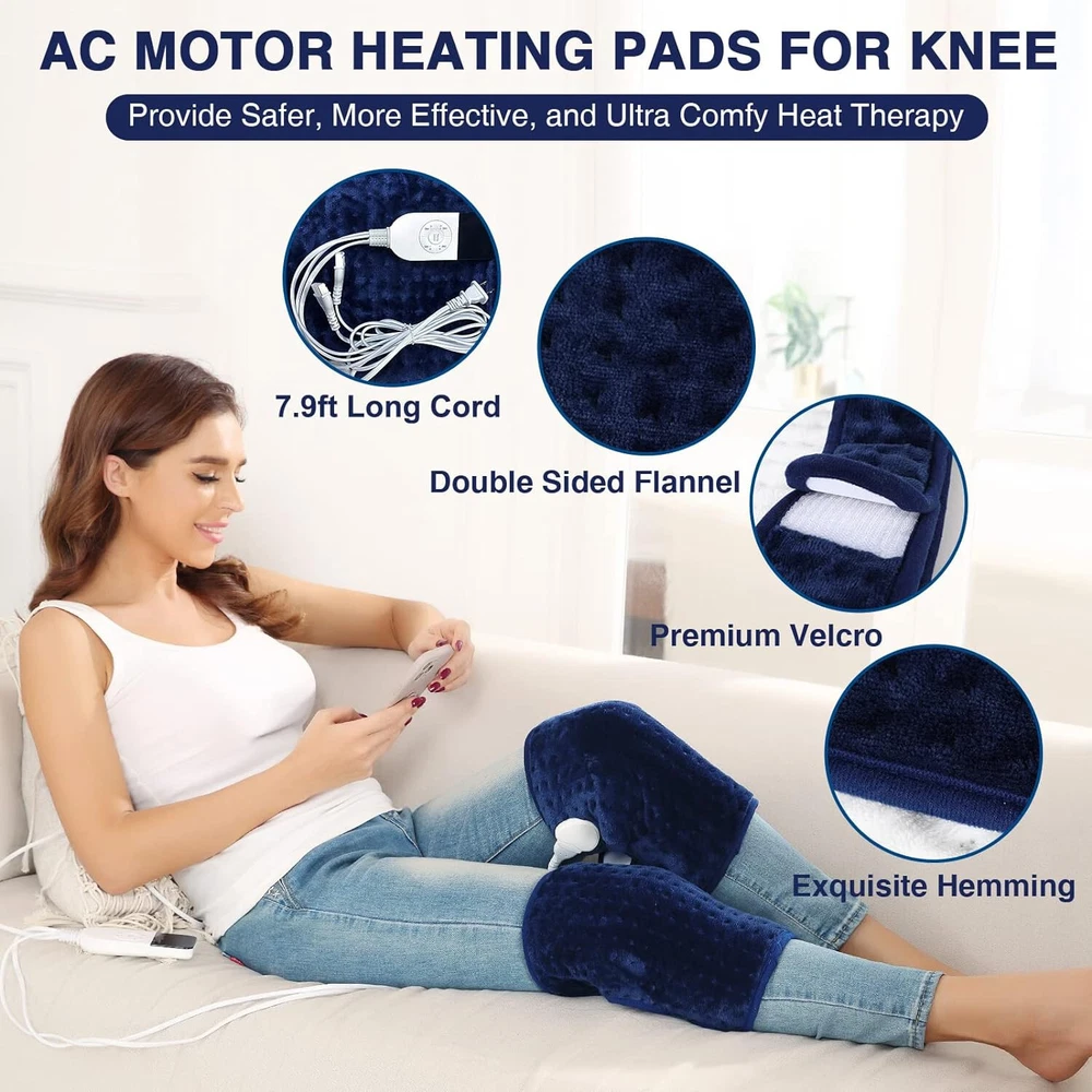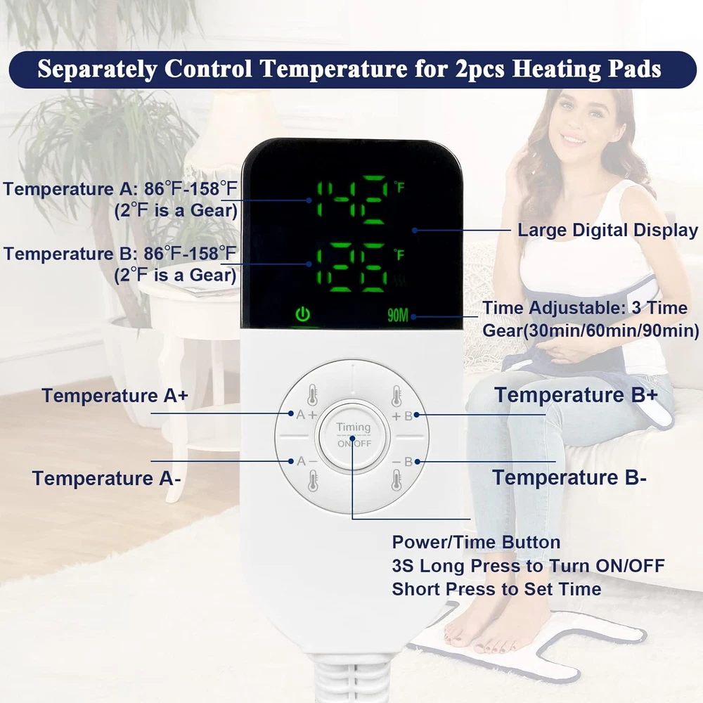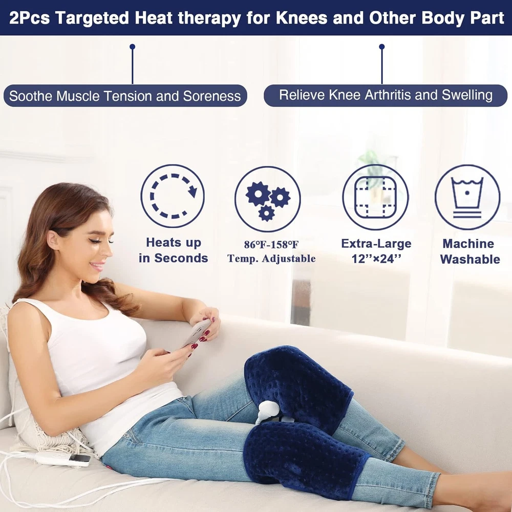 【Efficient Relief Knee Pain】Powerful heating of our ergonomic and compact knee heating pad will warm your knees and enhance blood circulation, also can effectively relieve knee pain and muscle stiffness caused by various reasons such as knee cold, arthritis, sports injury, joint swelling and surgical recovery. 【Double Side Flannel Material】This heating pad for knee is made with durable, soft, and comfortable flannel, which feels smooth and offers maximum comfort for daily use. it's easy to clean and machine-washable after detaching the controller. (Note: The washing temperature should not be over 86℉/30℃.) 【Fast Heating & Adjustable Temperature】With outstanding and advanced heating wire density technique, our JOBYNA heat pad heats up in seconds till reaches the temperature you want from a warm 86℉~158℉, each gear differs by 2℉, allowing you to choose your desired temperature according to different needs. 【Auto Shut Off Design】JOBYNA heated knee wrap supports 30/60/90min auto-off for timing heat therapy, it will auto-off if you forget to turn it off, helps you conserve energy, and prevents excessive heating from hurt. You can freely set the combination of temp and shutdown time according to your own needs, to get the best experience. 【Backlight Setting】Our electric heating pad is designed with a digital LDD controller, make it easier to adjust the heating time and temperature even at night. And it is designed with dual control switch means you can use one switch to control 2 pcs knee heat pad conveniently. The heating Pad for knee Pain Relief is lightweight, you can take it with you at work, at the gym, or when you travel.