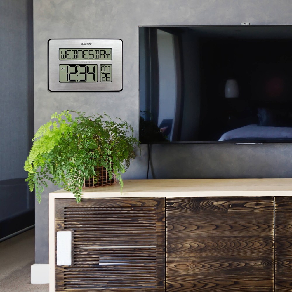 Stay on track of the time with the La Crosse Technology 513-1419-INT Full Calendar Atomic Clock (with Extra Large Digits).The numbers are nearly 2.5" tall, which makes it easy to read. This digital wall clock shows the time, the day of the week and the date. It is self-setting for accuracy. Made of durable plastic, it has a lightweight design. The La Crosse technology clock also boasts a changeable calendar view. This digital wall clock can be programmed to one of the seven US time zone settings. The low-power indicator lets you know when the batteries need changing. Keep the date and time handy with this clock. Extra-Large, easy to read digits to assist those suffering from memory loss and/or labor with abbreviated words Time digits measure close to 2.5" tall Day of the week is 1" tall Atomic self-setting time and date (manual set option) Automatic daylight saving time reset (optional ON/OFF) 12 hr. or 24 hr. time mode Adjustable display mode - Full Weekday; Weekday & Date - Date; Seconds; Indoor temperature (F/C) Keeps your time accurately set according to one of 7 US time zone settings Low power indicator icon lets you know when batteries will need changing Alarm with 10 minute snooze Wall hang or Table Standing Requires 2 AA batteries (sold separately) Lockable Bow Case 5 Archery Storage Compact Hard Protective For Compound Bows US 44.41 USD Free shipping 56-inch Retractable Fishing Net W/ Telescopic Pole Durable Landing Net Outdoor 39.78 USD Free shipping Green Tea Extract Vegetarian Capsules 500 mg, 60 Count 7.71 USD Free shipping Saucer Chair Folding Cozy Chair Accent Moon Chair for Bedroom Living Room Black 40.83 USD Free shipping S-365/N743 16X6.50-8 B Lawn & Garden Tire Heavy duty 1 PACK 38.44 USD Free shipping NEW Galvanized Steel Bushel Utility Basket Reusable Basket Tub 1 Bushel (35 L) 45.62 USD Free shipping Home Workstation Computer Desk w/ 3 Storage Shelves Writing Laptop Study Table 50.9 USD Free shipping NEW Ready To Eat Pickled Sausage 32 oz Jar Bold Spicy Snack Perfect For Sharing 15.98 USD Free shipping NEW 8-Piece Anchor Kit 15-inch Auger Style w/ Rope For Tents Canopies Car Ports 36.19 USD Free shipping Electric Fireplace Heater 17" Adjustable Brightness Heating Overheating Safe US 168.92 USD Free shipping 2 Pack Wheeled Laundry Hamper Flip Top Lid Durable Airflow Easy Transport New 39.48 USD Free shipping 15 Piece Kitchen Knife Set Triple Rivet Block Natural Wood Stainless Steel New 48.23 USD Free shipping