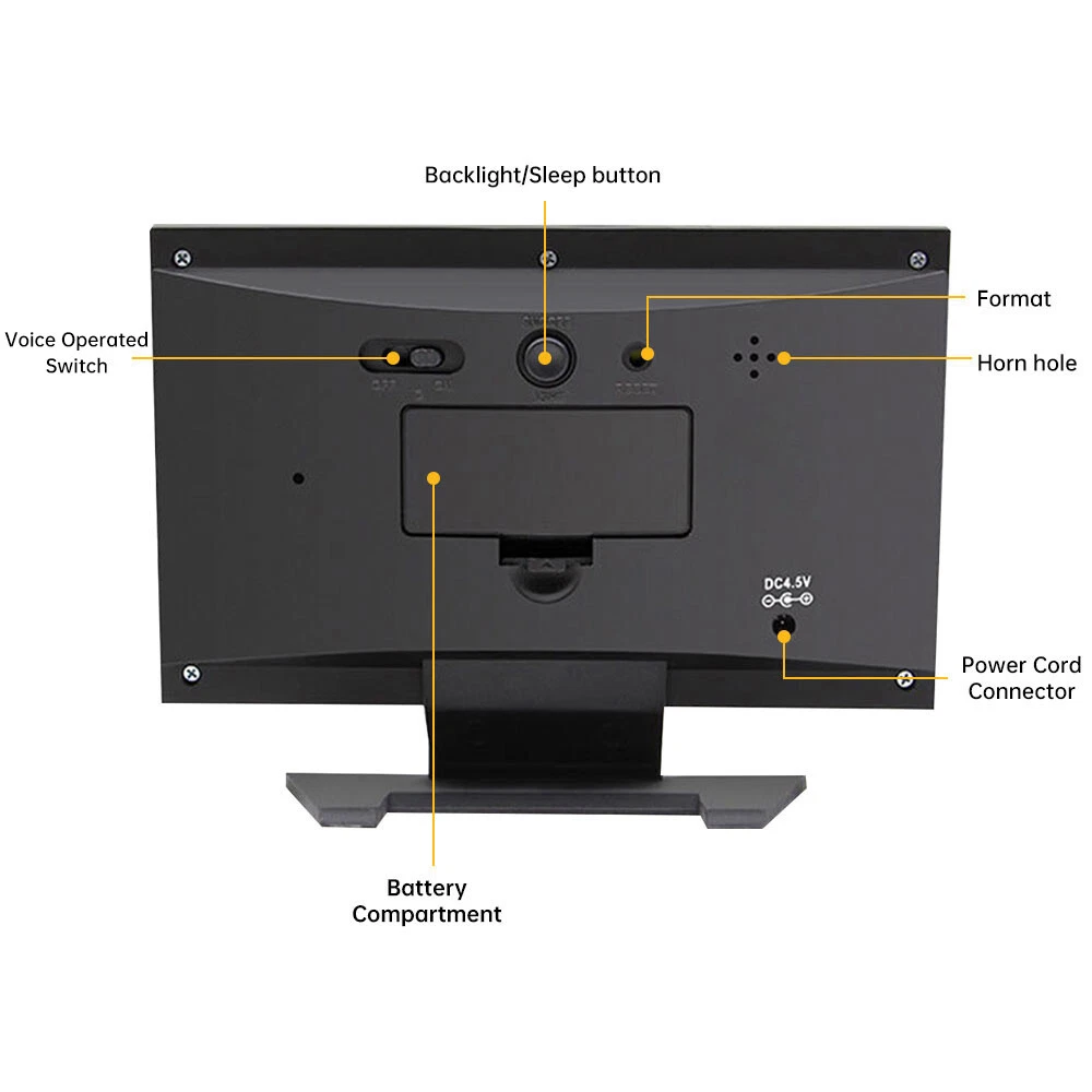 Description: 1. Clock display, 12/24 hours can be switched. 2. It can display time, weather, temperature, humidity, day of the week, temperature trend. 3. With alarm clock, snooze function, weather display, temperature trend indication, very practical. 4. Voice-activated backlight, energy-saving and convenient. You can turn off the voice-activated function through the switch on the back of the product. 5. Powered by 2 x 1.5V AAA batteries (not included). Specification: Material: ABS Color: Black Screen size: 107*58mm Temperature measurement range: -10-61°C / 14.2-140°F Humidity Measurement Range: 20%-99 Power supply: 2 * 1.5V AAA batteries (not included) Packing list: 1x Alarm clock (without battery) 1x USB charging cable Note: 1. When this product is powered by batteries, the screen backlight will not be always on (carbon batteries are recommended, please do not use high-power alkaline batteries) 2.When this product uses USB power supply, the screen will be always lit.