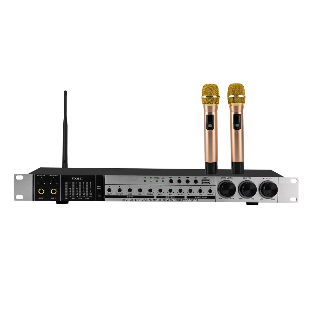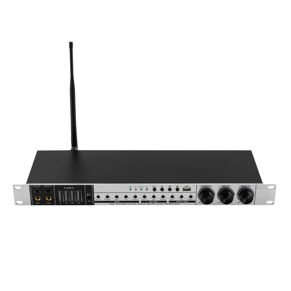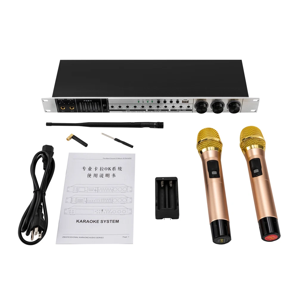 Specifications Material: Aluminum Color: Black, Gold Center Channel: 87dB Ultra Low Channel: 87dB Frequency Response/Music: 10-30KHZ Sound Quality Adjustment Range/Music Bass: +A10dB1H Microphone Bass: +/-10dB (100HZ) Treble: +/-5dB(10KHZ) Microphone: 20-15KHZ Microphone Squelch Threshold: Over-control Voltage 3MV, Start-up Time 3S Distortion: (1KHZ, 30MV) 0.03% Power Supply Voltage: AC110V/60HZ Packing Size: 55.5*8.8*30cm/21.85*3.46*11.81in Product Size: 48*19.5*4.8cm/18.9*7.7*1.9in Gross Weight: 2.5kg/5.5lbs Net Weight: 2kg/4.4lbs Package Included 1* Pre-stage Reverberation Effector 1* Power Cord 1* Bluetooth Antenna 2* Microphones 1* Battery Box 1* Chinese English Integrated User Manual Other Accessories for Use Digital Mixer Household Karaoke Reverb Durable Stable Operatio Sound Processor Key Features Robust and Durable : The housing is made of high-quality aluminum, which is robust, wear-resistant, rust-proof, and impact-resistant, effectively protecting the internal components and extending their service life. Professional Equipment: It is equipped with an exciter, equalizer, audio processor, feedback suppressor, effects, and mixer functions for better processing of vocals and backing vocals, giving you a professional-level experience. High-quality Vocals: With a built-in DSP dual digital reverb chip, it automatically corrects vocal deficiencies for richer, more natural, and clearer vocals. At the same time, its intelligent frequency calibration technology with a new type of noise reduction prevents frequency break-up, distortion, whistling, and crosstalk, ensuring a full, three-dimensional, high-quality vocal output. Anti-howling Technology: It uses advanced feedback suppression technology to fundamentally eliminate whistling interference while preventing sound collapse to give you a vivid and pure singing voice. Featuring a one-touch anti-howling button, it eliminates the need for debugging, making it convenient and practical. Input and Output : It can be switched to various input modes, Bluetooth, optical, or USB, using the INPUT button, so you can freely select and switch your favorite music. There are also multiple outputs, including a subwoofer output, a recording signal output, a center signal output, and a left and right channel model output for your daily needs. Easy Tuning: Three sensitive damping knobs and concealed operating knobs on the front of the unit make it easy to adjust the volume and parameters of the reverb, microphone, and music for a rich, immersive sound. Each part of the sound can be adjusted separately, giving you a wider vocal range and making it easier to sing well. Wireless Connectivity: The built-in microphone receiver, wireless Bluetooth module, and external Bluetooth receiver antenna with high interference immunity and stable signal allow music selection and microphone use over long distances without the hassle of cables. Stereo Sound Effect: With the bass, center, left and right channel modes, each zone can be adjusted independently to give the vocals a full, delicate and soft sound, giving you a full stereo feel. User-Friendly Design: The concealed operation knob is not easy to touch by mistake, and can be quickly and easily adjusted with a slotted screwdriver. In addition, with a memory function, each time it starts, it will automatically adjust to the last set mode to avoid the trouble of frequent adjustment. Good Heat Dissipation: The effector is equipped with multiple heat sinks for faster heat dissipation, resulting in long and stable operation. Customer Service: We aim to provide quality products and services. If you have any problems, please feel free to contact us. We will reply and solve the problem for you as soon as possible. Application It is suitable for small-stage performances, family entertainment, promotional activities, business meetings, KTV boxes, restaurants, bars, and other entertainment venues. Notes Please note that if fiber optic connection is required, your audio output device must have a fiber optic output connector. Please note that the package does not contain batteries. You need to purchase two AAA batteries yourself. Please allow the slight color difference caused by the shooting light and 1-3cm error due to manual measurement, and make sure you do not mind before you order. Payment Delivery details Terms of sales About us Contact us Payment We accept ebay payment 。 Fees such as import duties, taxes are not included in the item price or shipping costs. These charges are the buyer's responsibility. Delivery details Shipping: 2-9 working days to: USA Terms of sales We maintain high standards of excellence and strive for hundred percent customer satisfaction. Feedback is very important to us. We hope that you contact us immediately before you give neutral or negative feedback, so that we can address your concerns. It is impossible to address issues if we do not know about them! About us Your satis faction is our ultimate goal. We work hard to earn your trust and future business. Our certified technicians have tested each item before shipping. The unit comes with 1 year limited warranty on all manufacturing defects. a) If you receive a defective item, you may return it or ask for a discount. Please contact us within 14 days after you receive the package. b) What you returned must be intact and in its original packaging as re? u. Customer is responsible for shipping costs of the returned item. c) We will cover the cost of shipping back t with the shipping rate indicated in the registration page. We will send you a new unit or refund the full payment you paid. Thank you. Contact us Business Hour Business Hour: Monday To Friday: 8:30 AM to 5:00 PM (Beijing China time) Due to time zones, our reply to your questions may not be immediately. But within above working time, we will reply your email within 24 hours. If it's non-workdays, please kindly be patient and wait till Monday. Please contact us with ebay message. Please f