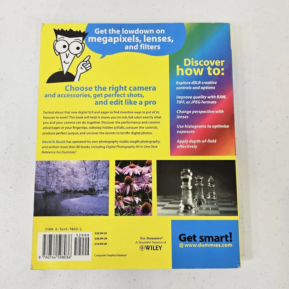 Item Height: 0.7 in Product Group: Book Binding: Paperback ISBN: 9780764598036 Number of Pages: 352 Pages IsTextBook: Yes Item Weight: 28.5 Oz Subject Area: Computers, Photography Publisher: Wiley & Sons, Incorporated, John Weight: 1 lbs Publication Name: Digital SLR Cameras and Photography for Dummies Format: Perfect Type: Textbook Language: English Author: David D. Busch Item Width: 7.4 in Publication Year: 2005 gtin13: 9780764598036 Item Length: 9.2 in Subject: Computer Graphics, Techniques / Equipment, Techniques / Digital (See Also Computers / Digital Media / Photography)