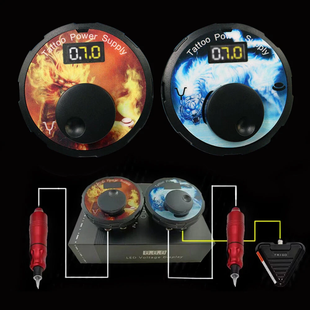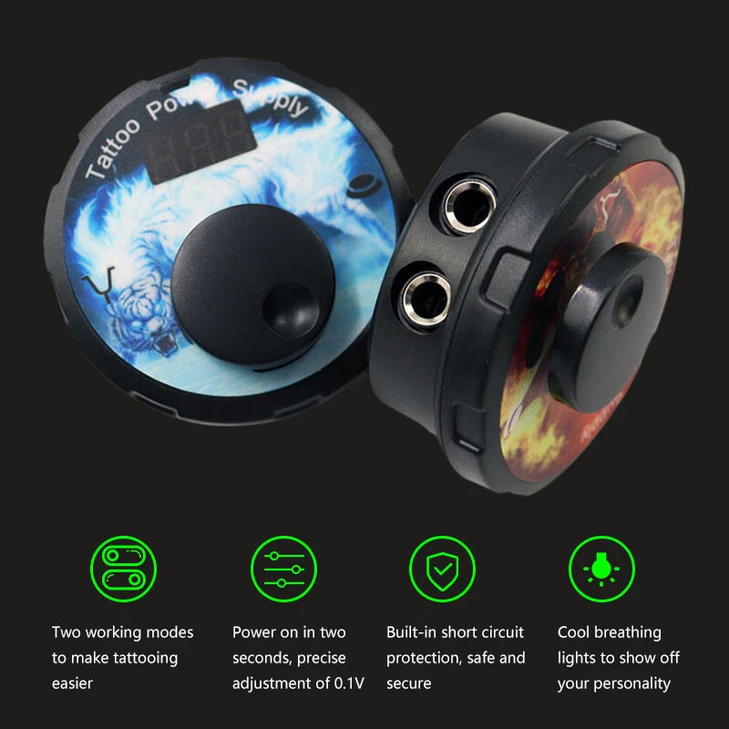 Feature: 1. VOLTAGE ADJUSTABLE: The adjustable voltage of the tattoo power supply for 3‑12V, the adjustment accuracy of 0.1V, rotate the adjustment button to adjust the voltage. 2. 2 PEDAL MODES: Tattoo power supply has 2 foot pedal mode, one is the need for foot pedal control mode, the other is no foot pedal control mode, short press the voltage adjustment button, the machine can run continuously. 3. HIGH EFFICIENCY: Strong movement, suitable for a variety of places, strong power, long working hours will not heat up, you can rest assured that the purchase and use. 4. LED DISPLAY: This mini tattoo power supply with LED display, can accurately display the current voltage, convenient for tattoo artists to adjust the voltage at any time. 5. LIGHT WEIGHT: Tattoo power box with ABS shell, small size, light weight, can effectively anti static, easy and safe to use. It also comes with cool and stylish LED lights. Specification: Item Type: Mini tattoo power Material: ABS, electronic components Input Voltage: AC100-240V 50/60Hz System Adjustable Voltage: 3-12V, adjustment accuracy 0.1V Power Supply Host Size: Approx. 75 x 75 x 45mm / 3 x 3 x 1.8in Product Characteristics: 1. 2 seconds to turn on, 0.1V precise adjustment. 2. Built in short circuit protection, breathing light. 3. Support foot pedal, no foot pedal 2 working modes. Voltage Adjustment Mode: Knob adjustment Package List: 1 x Tattoo Power Supply 1 x Adapter
