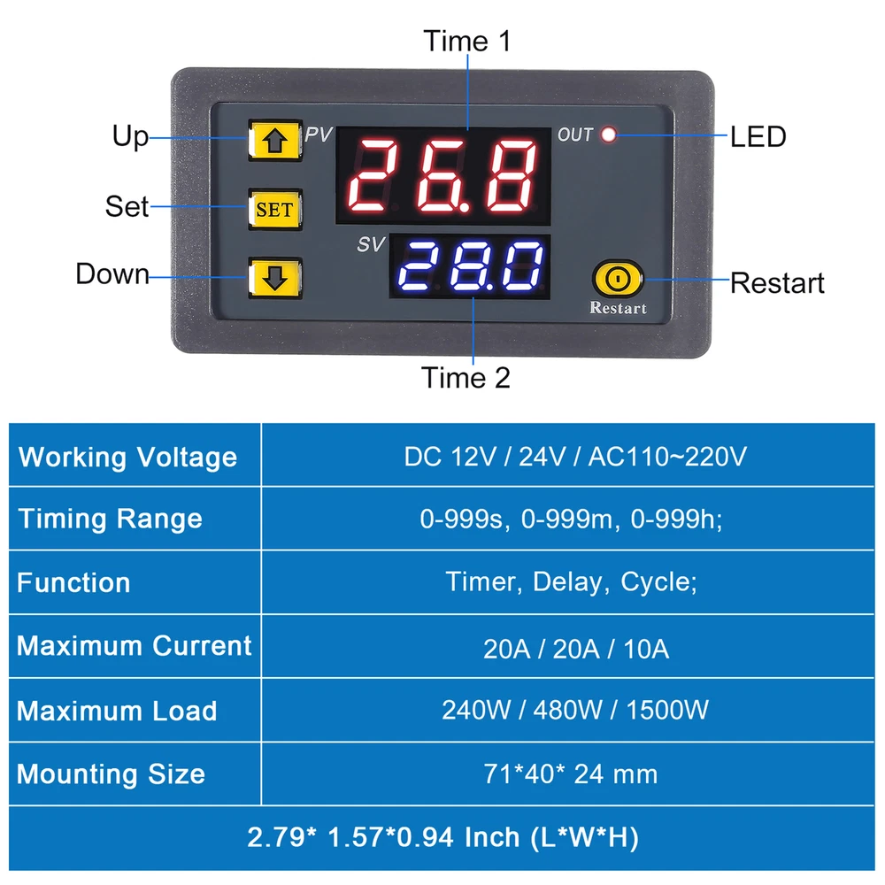 Digital Temperature Controller LED Display Electronic Control Board Temp upgrade Bullet Points: Multiple Modes: With multi-mode work capability, this digital temperature controller is perfect for timing, cycling, and looping. Additionally, it saves your adjustments after 6 seconds, ensuring efficient and accurate temperature regulation Effortlessly Manage Temperatures: Achieve precise temperature control effortlessly with this digital temperature controller. Its button setting and four-terminal wiring make it easy to use, and the small dimensions of 79x42x26mm ensure convenient installation. Advanced Timing and Control: Take advantage of our digital temperature controller's advanced timing and control capabilities, featuring two timing times with a time range of 1 second to 998 hours, and six working modes to choose from. Perfectly tailored for enhanced performance in a range of applications Double Monitoring Screen: Equipped with an onboard double green-red LED display module and responsive tactile button, this digital temperature controller provides precise monitoring Three Timing Modes: Set your customized timing mode in seconds 0-998s, minutes 0-998min, or hours 0-998h with the digital temperature controller's P0—0:T 1 timing second, P0—1:T 1 timing minute, and P0—2:T 1 timing hour settings Upgrade your thermostat game with our digital thermostat control board! Featuring a double LED display and button setting for ease of use. Wait 6 seconds after setting the data for optimal results. Can be used in various applications to meet different needs. Specification: Product name: Digital Temperature Controller Temperature control range: -50-120°C Resolution: 0.1°C at -9.9-99.9, 1°C at other temperature ranges Temperature measurement accuracy: 0.1°C Control accuracy: 0.1°C Hysteresis accuracy: 0.1°C Refresh rate: 0.5s Input powering supply: DC 12V Measurement input: 10K 0.5% Waterproof sensor Output: 1 relay output, 12 20A, 220V 10A Environmental requirements: - 10-60°C humidity 20%-85% Product size: about 7.9x4.3x2.6cm/3.11x1.69x1.02 inches Packing List: 1 x Digital Temperature Controller Note: Due to different lighting and screen settings, the item color may be slightly different from the picture. Due to different manual measurements, please allow a 1-2cm difference in size. 1.You can make a Credit payment via Paypal.Paypal will let you use MasterCard,Visa to pay. 2.Payment should be completed within 5 days after auction closed, or unpaid dispute will be filed for an closing auction.An unpaid case will be filled after 4 days. ● We strive for 100% customer satisfaction ! ● Positive Feedback is very important to us. ● We hope that you contact us immediately BEFORE you give us neutral or negative feedback, so that we can satisfactorily address your concerns. ● We promise to offer the lowest price and high quality produce. Dear buyers : ● Welcome to my store ! ● Your satisfaction is our top goal,we appreciate your patronizing. ● If you have any questions, please contact us before leave negative or neutral feedback, we will try our best to solve the issue to your satisfaction, thanks ! ● If you are satisfied with our service, please rate the details of the transaction (Detailed Seller Ratings) on eBay. ● Please always talk to us via ebay Message. ● We appreciate your business and look forward to growing our e-Bay sales with satisfied customers.