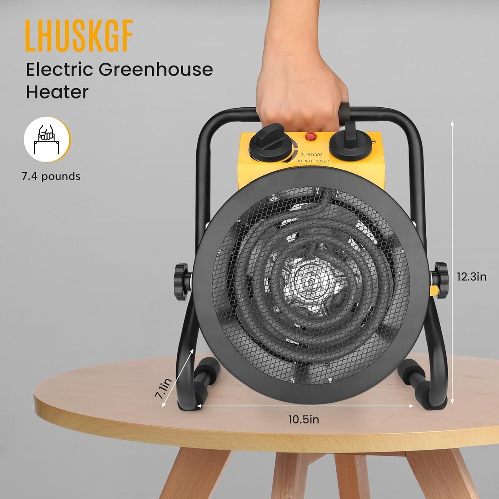 【Greenhouse Heater】: The greenhouse heater is equipped with a thermostat that easily heats up to 150 ft ² of space with a 5118 BTU/1500 W heating output for efficiency and energy savings. It can be used in greenhouse, tent, workshop, garage, bedroom, kitchen and other areas. 【Digital Thermostat】: The electric greenhouse heater is equipped with a digital thermostat, which can be selected in either degrees °F or °C,and the adjustable heating range is 40 ℉-108 ℉(5 ℃-42 ℃). When the ambient temperature is 1 °C higher than the setting temperature, the heater is automatically turned off 【Portable Greenhouse Heater】: The handle and base of the greenhouse heater with digtal thermostat are designed to be non-slip, making it very easy to carry, and it can help you and your plants survive the cold winter 【Overheat Protection】: When the greenhouse heater reaches a certain overheating temperature for a long time, the system will automatically turn off the heater and will restart when the temperature cooled down. This can prevent the harm caused by overheating! 【High-Quality】: The floor standing grow tent heater is made of stainless steel housing with IP X4 waterproof splash. The air outlet is designed to make the air out more efficiently, but also for the heater can have a longer life cycle. Dimensions: 7"D x 11"W x 12"H