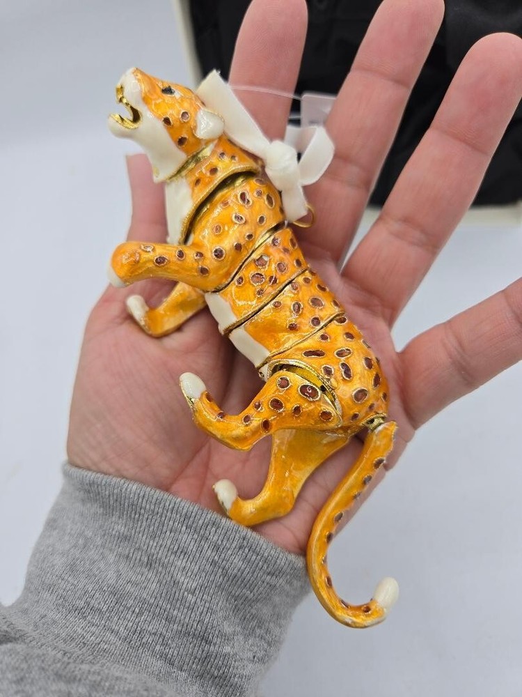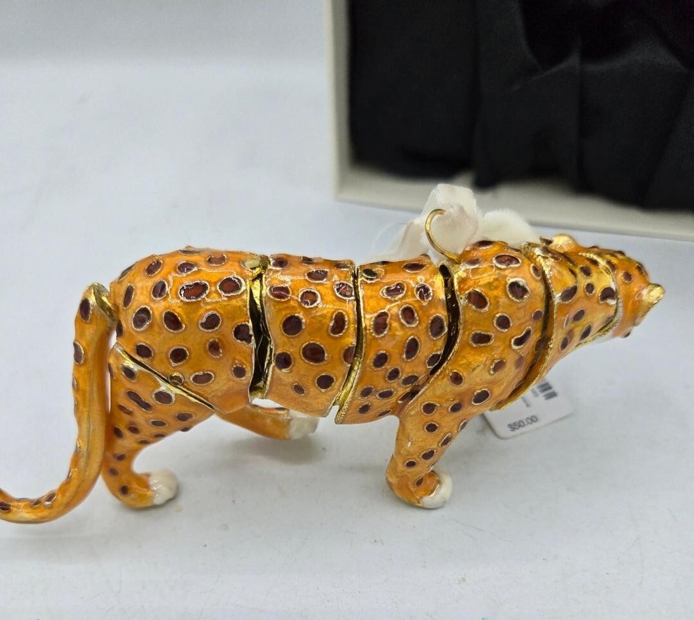 The Dillard's Trimsetter Leopard Cloisonné Christmas Ornament is a stylish and eye-catching addition to any holiday decor. This collectible ornament features a leopard design crafted in cloisonné, a decorative metalworking technique. Made in China in 2020, this ornament is part of Dillard's ornament collection for the year and would make a unique and elegant accent for your Christmas tree or home decor. Room-K