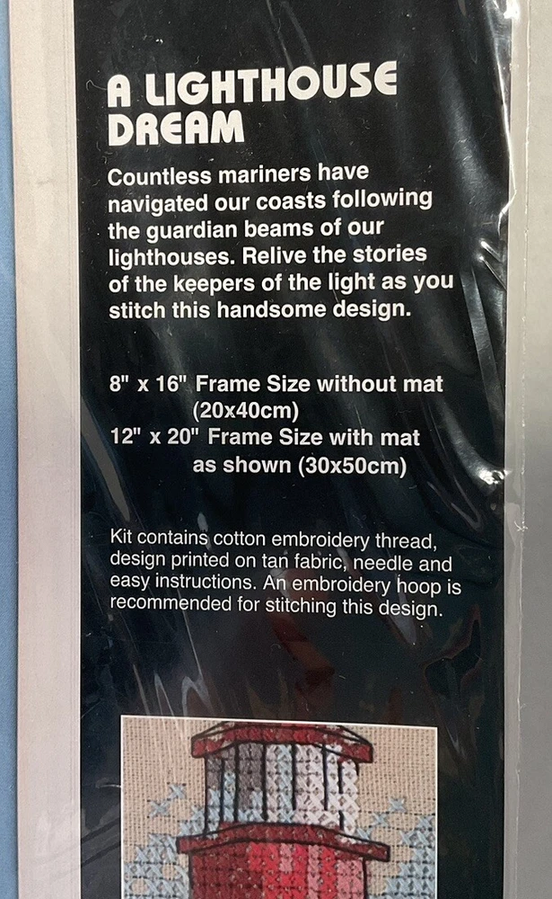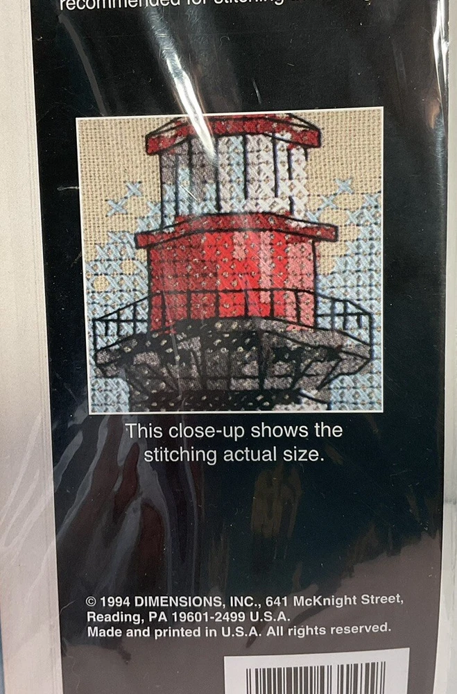 This vintage NIB Dimensions cross stitch kit, titled "A Lighthouse Dream" (kit number 3145), captures the beauty of landscapes and seascapes with its design printed on fabric. The kit, made in the United States in 1994, is perfect for beginners with its easy to follow instructions and skill level labeled as "easy." 8” by 16” The kit includes everything needed to create a beautiful cross stitch piece, including dimensions for the finished product. This cross stitch kit is a perfect addition to any craft collection and will provide hours of relaxing and enjoyable stitching.