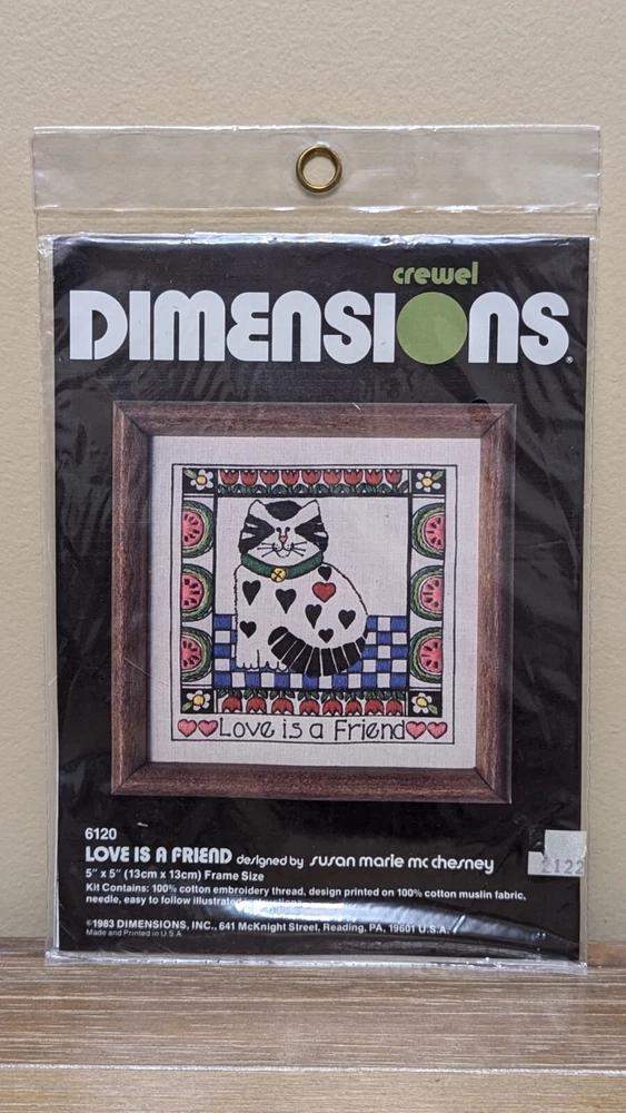 Dimensions Crewel Embroidery Kit #6120 LOVE IS A FRIEND 5x5 Cat Vintage 1983 **Designed by Susan Marie McChesney **SEE PHOTOS! This vintage item is New & Sealed in its original package! From a pet-free & smoke-free home. Shipped quickly and carefully from Kansas! Thank you for looking 😊 -------------------------