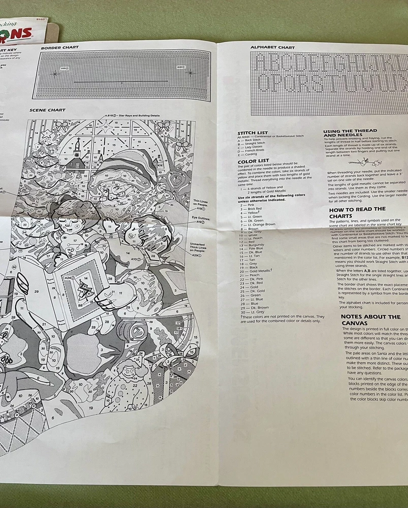 Dimensions Christmas Holiday Needlepoint Kit 9103 SANTA'S STORY STOCKING 1996. This kit is opened but hasn’t been started. It looks like the floss, yarn and filament has been sorted into 4 groups in 4 envelopes. See photos. Comes with 2 needles, canvas, instructions, felt backing, floss, in original packaging. Makes a 16” stocking. This is a lovely and rare stocking kit for that special someone. Comes with alphabet stitching guide for personalization. What a wonderful project and a labor of love to give to someone special. Sold as-is. Thank you for looking.
