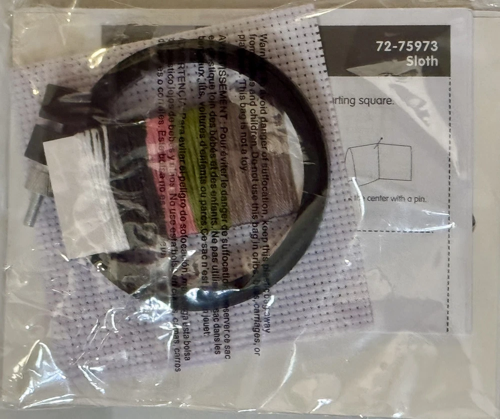 Dimensions Learn a Craft Cross Stitch Kit. 3 inch. Baby Sloth. Kit contains thread, 11 count white Aida, 3 inch hoop, needle and instructions. Recommended for ages 8 and up. New in package.