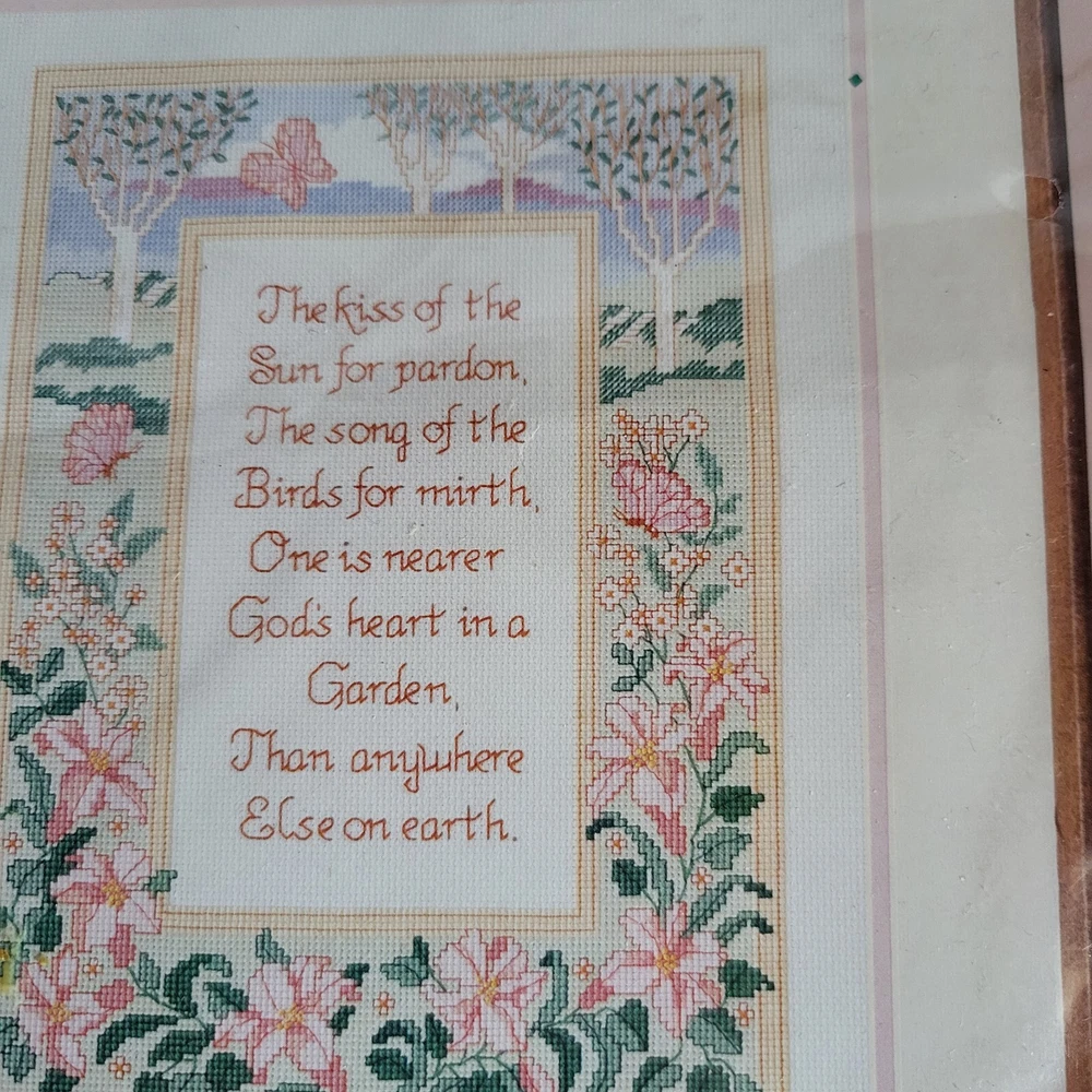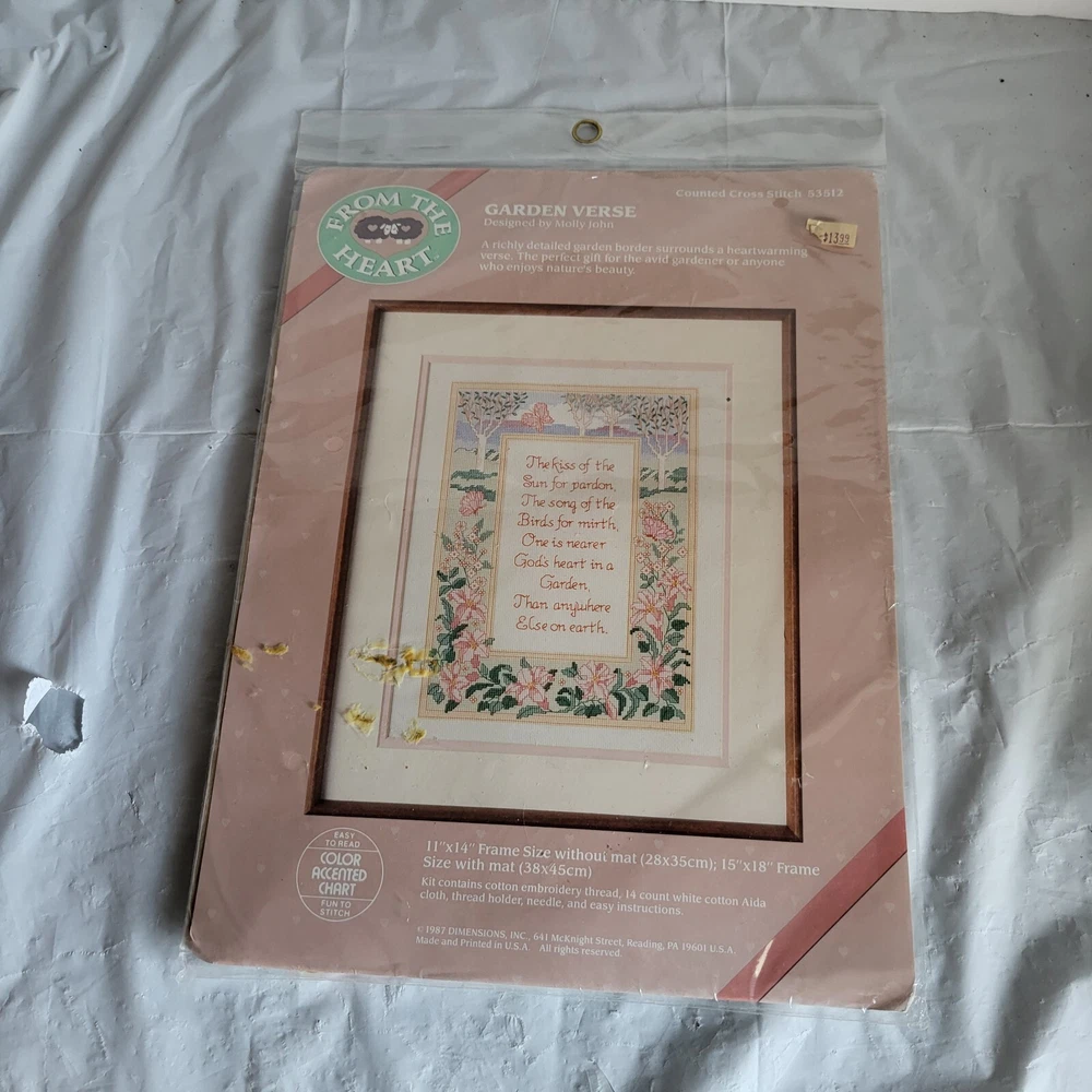 This counted cross stitch kit features a beautiful garden verse design by Molly John from 1987. The kit includes everything you need to create a stunning piece of art, including fabric, floss, needle, and instructions. The brand is "From the Heart" and the theme is "Flowers & Plants". This kit is perfect for anyone who loves cross stitch and wants to add a touch of elegance to their home decor.