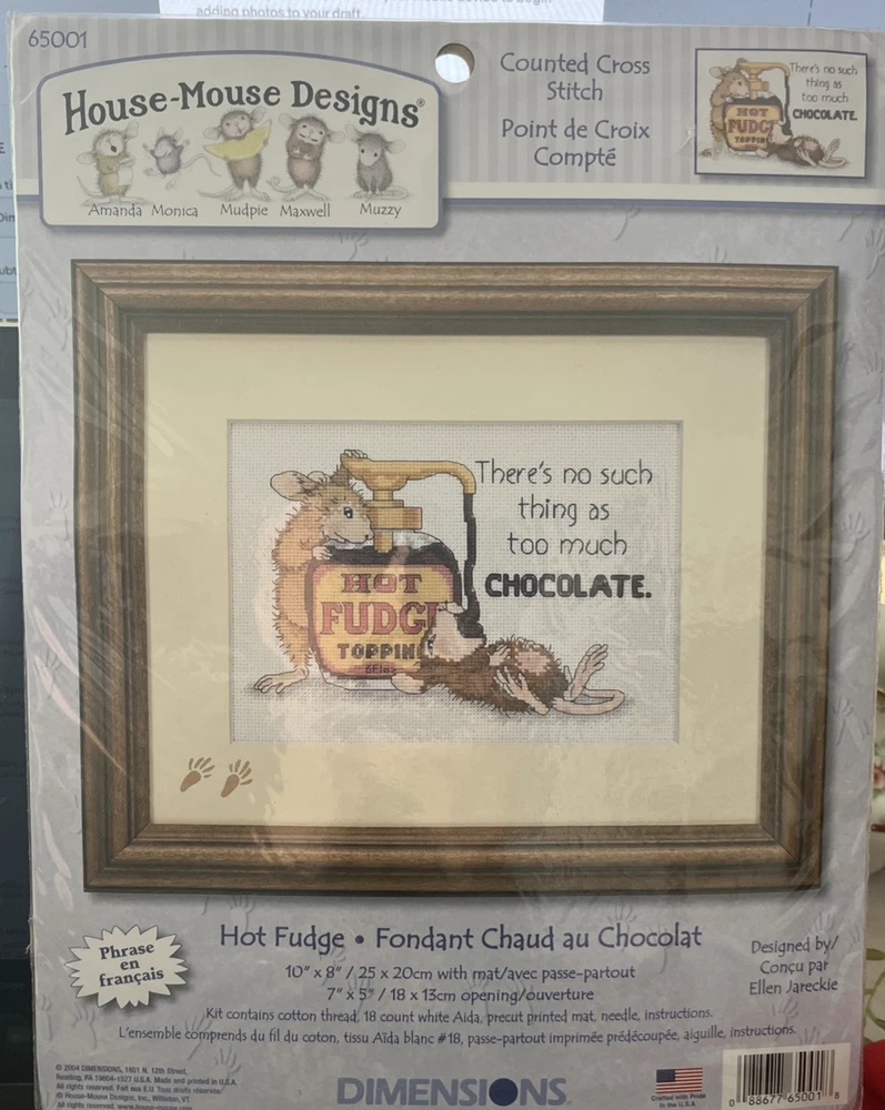 This Dimensions HOUSE MOUSE "HOT FUDGE" Counted Cross Stitch Kit #65001 is a must-have for crafters and collectors alike. The kit contains all the necessary materials to create a beautiful cross stitch masterpiece, including high-quality floss, fabric, and a needle. This item is unopened and ready for a new home. New Sealed