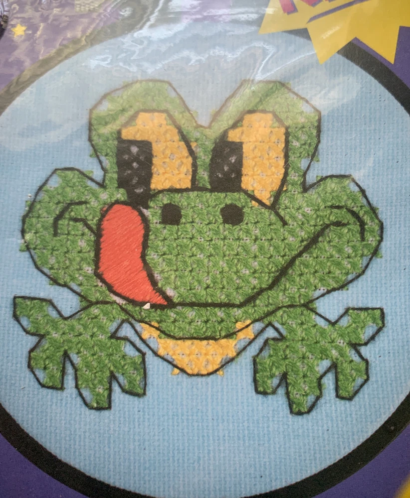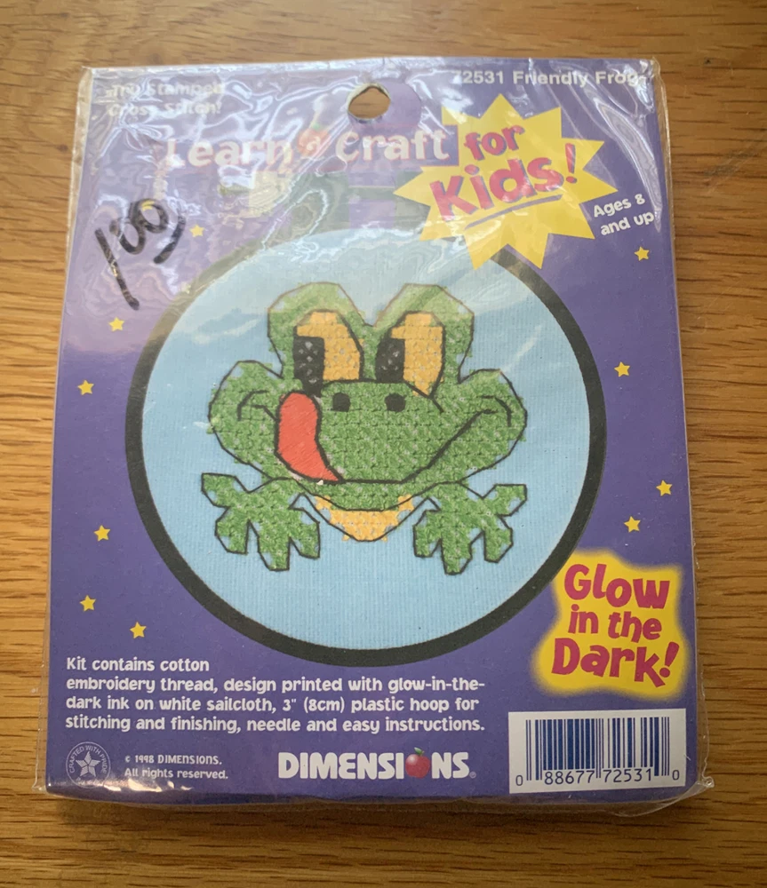 Create a charming cross-stitch masterpiece with this Dimensions Learn A Craft Friendly Frog GLOW IN THE DARK Mini Cross Stitch Kit. This kit includes everything you need to start stitching, including a needle and fabric/cloth. The sampler format showcases an adorable animal and insect theme, with the added bonus of glowing in the dark. The framed style offers a finished and polished look, perfect for display or gifting. The kit is made in the United States and is suitable for beginners or experienced stitchers alike.