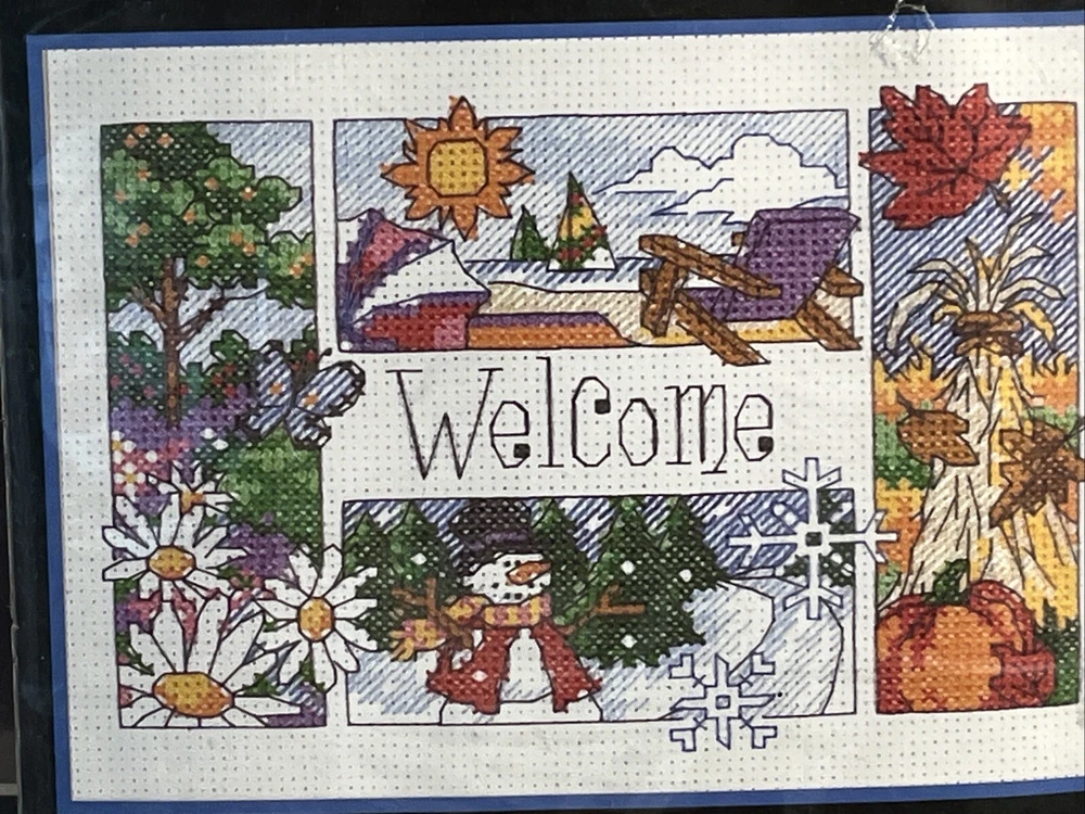 Dimensions Seasonal Welcome 6916 Counted Cross Stitch Kit 7 x 5 W/Frame C3 This cute sampler will look so cute when you get it done. It comes with a frame and mat, along with the sampler. Please see all the pictures before you purchase. Thank you for looking at our listings. We will combine shipping when possible. We will send this either by USPS or FED EX. Whichever is the cheapest way. If there is shipping over payment, we will refund you the difference. Feedback is appreciated. If you have any problems, please contact us before leaving feedback. We will do whatever we can to resolve issues. Have a great day.
