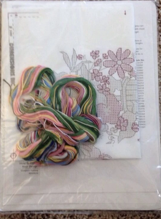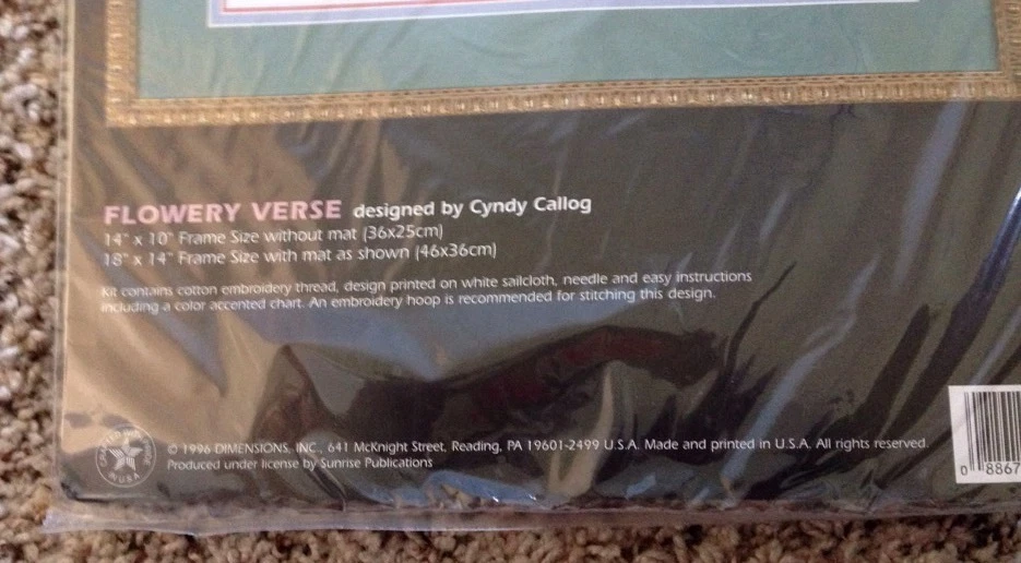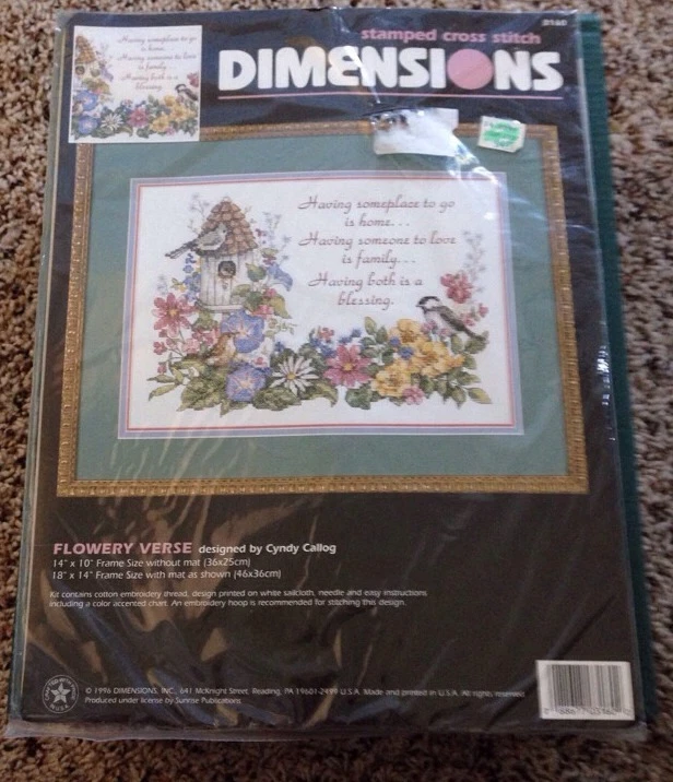 1996 Dimensions FLOWERY VERSE Stamped Cross Stitch New, unopened Kit #3160 Frame size with out Mat is 14" x 10" Frame size with mat is 18" x 14" Please see pictures for details as this is part of my description.