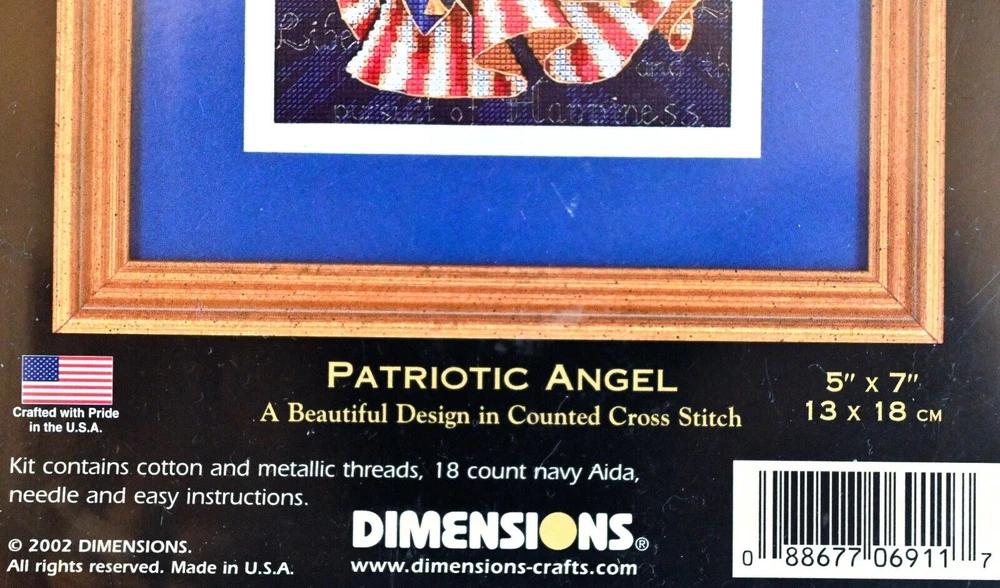 THIS LISTING IS FOR A counted cross stitch KIT titled, Patriotic Angel. Kit # 6911. Brand is Dimensions from their Gold Collection Petites line. The finished size is 5" x 7". COVER PHOTO SHOWS A FINISHED DESIGN IN A MAT AND FRAME; THEY'RE NOT INCLUDED IN THIS FACTORY SEALED KIT; THEY'RE NOT INCLUDED IN THIS LISTING EITHER. LISTING PRICE IS FOR KIT ONLY. KIT INCLUDES: 🇺🇸 18-count navy cotton Aida 🇺🇸 Cotton thread and metallic threads 🇺🇸 Needle 🇺🇸 Design Chart 🇺🇸 Easy Instructions Country of Manufacture: ♡ USA Year of Manufacture: ♡ 2002 Condition: ♡ Kit is Unopened, never opened, and contents are in original factory sealed packaging. The original hard plastic packaging is clean, clear and looks good for its age. Please see and enlarge all photos of actual kit. Item is stored in a smoke free and odor free place. ABOUT "LAST MINUTE BEST OFFERS:" 🤔 Some folks prefer to make an offer the last minute before a listing ends; they won't get the item. That's not enough time for me to accept or decline. Same day...maybe. ******************************************************* And thank you for reading the important info below. 👏👏👏👏👏🤗 COMBINED SHIPPING: 🥳 Buy 4 kits in 7 days. I'll combine shipping and refund any overage. DOMESTIC SHIPPING🇺🇸💌 I ship everyday, usually same day, if purchase is completed well before post office closes and if I can. I always ship your package with care for safe arrival. Transit time is usually 3 to 5 business days. INTERNATIONAL SHIPPING✈💌 Transit time is 8 to 25 business days or longer to Canada or England, only. International Shipping cost, which is to anywhere outside the US, is based on auction value of item, the package weight, its dimensions, and depending on the destination- country. Buyer is responsible for paying the following: (1) actual shipping cost, (2) VAT tax that Ebay collects from me, and (3) custom fees, duties and taxes that your country, the buyer's country, collects when the package arrives to you, the buyer. Some countries do not give tracking updates and/or do not honor USPS insurance. There are no refunds on International purchases. I'm happy to answer your questions. It may take a few days. Just ask.😉 PAYMENT😇/UNPAID ITEM😪 POLICY Once you win a bid, the deal is you pay up what's due within 4 days of winning a bid.If you forget, a gentle reminder will follow. If you need an extension, up to 7 days, that's ok too; just let me know asap. Otherwise, after 4 days of silence and non-payment, it looks like I lost income owed to me, so I file a complaint. ⚡Check ebay's policy for more info regarding penalty for unpaid bids. RETURNS POLICY💌💫 I stand by my products. I do accept domestic returns if the product arrives to you damaged or you changed your mind. But item must be returned as mailed out, in unused, complete condition