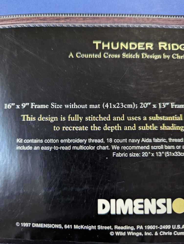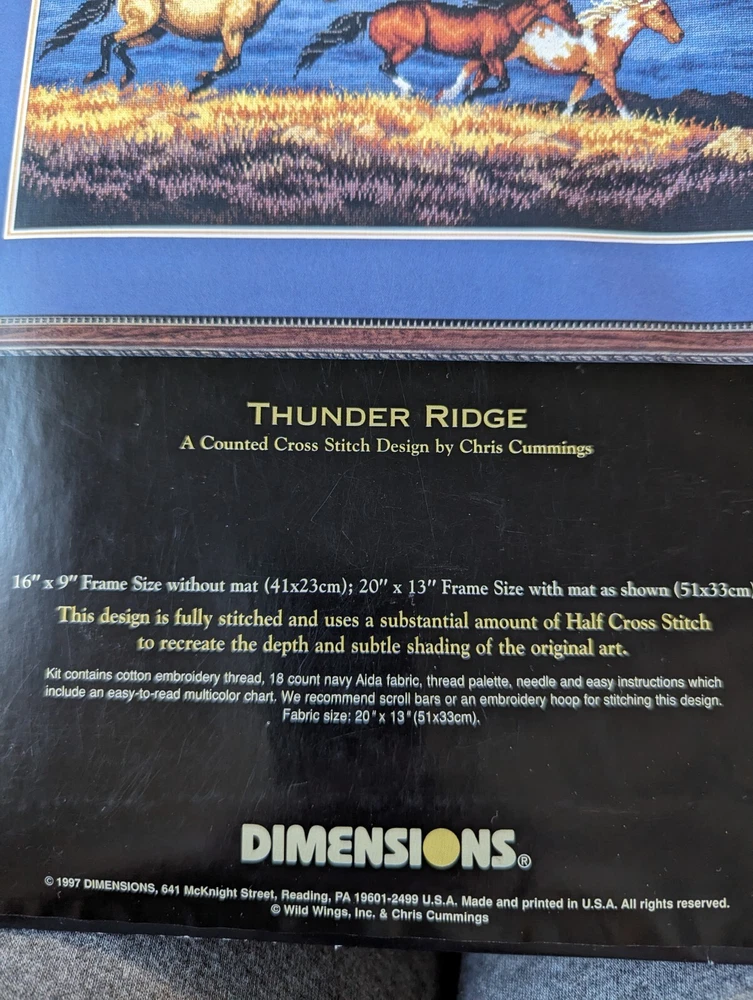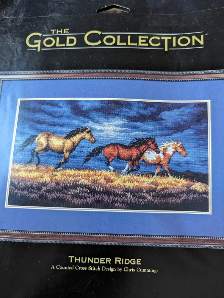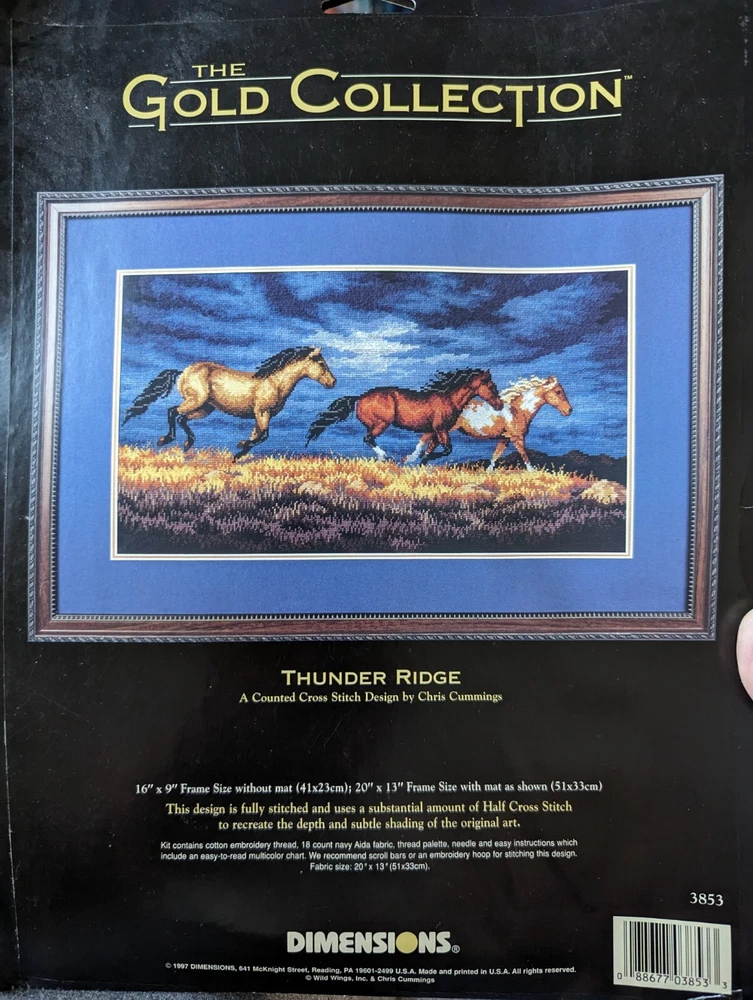 Add a touch of elegance to your home decor with this Dimensions The Gold Collection Thunder Ridge COUNTED CROSS STITCH KIT 3853. The kit includes everything you need to create a beautiful framed picture of wild horses running at dusk. The kit features half stitch and cross stitch techniques, making it a perfect project for anyone who loves to work on counted cross stitch kits. The kit includes a needle, multi-color chart, fabric/cloth, thread/floss, and everything else you need to create a stunning piece of art. This kit is classified as a counted cross stitch kit and is perfect for anyone who loves to work on such projects. The Thunder Ridge Wild Horses model is a great addition to any collection and will make your home decor stand out.