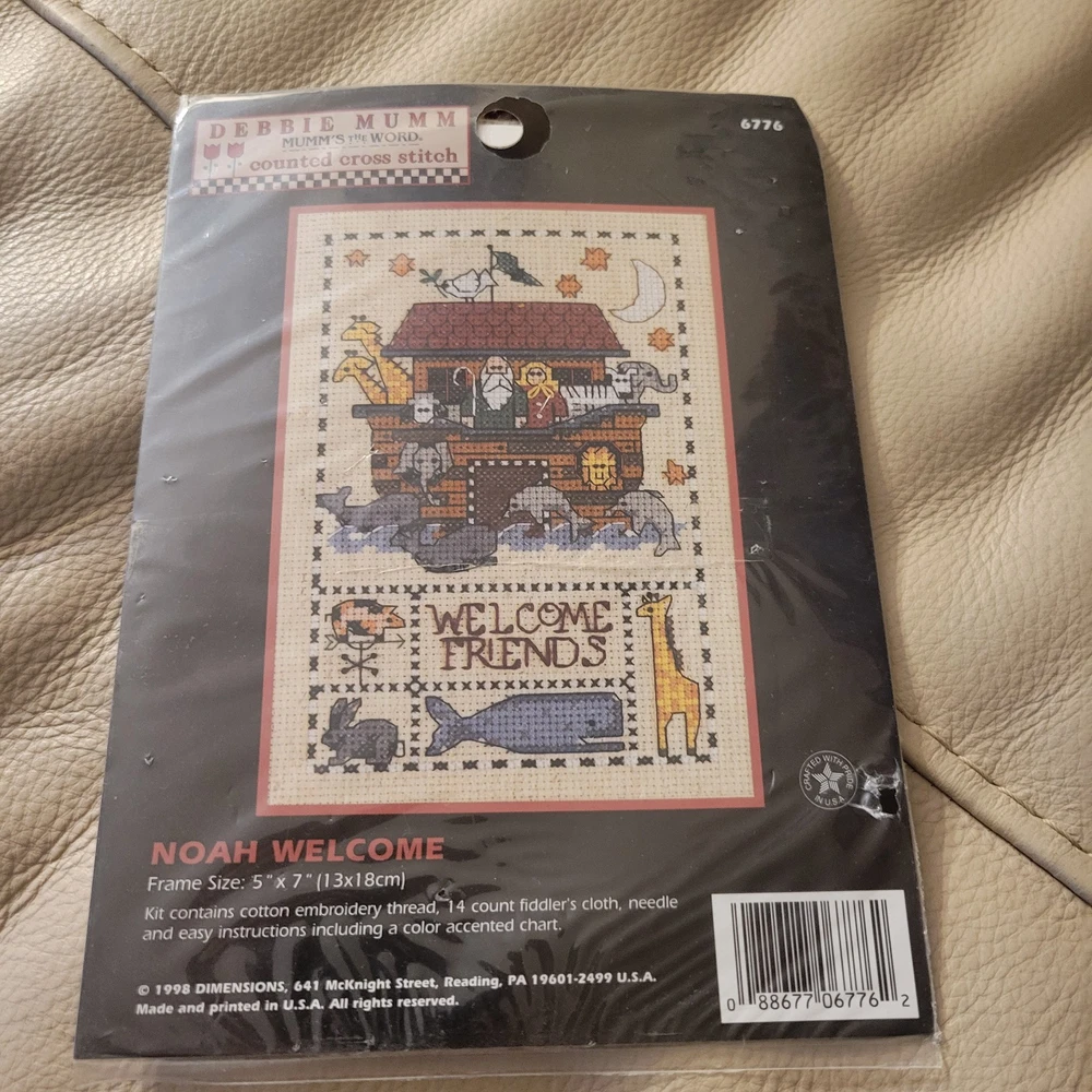 This is a Dimensions counted cross stitch kit featuring a framed picture of Noah Welcome by Debbie Mumm from 1998. The kit includes a needle, color guide, fabric/cloth, and thread/floss. It is a sealed package and does not come with any custom bundle. The theme of the kit is holidays and it is made in the United States.