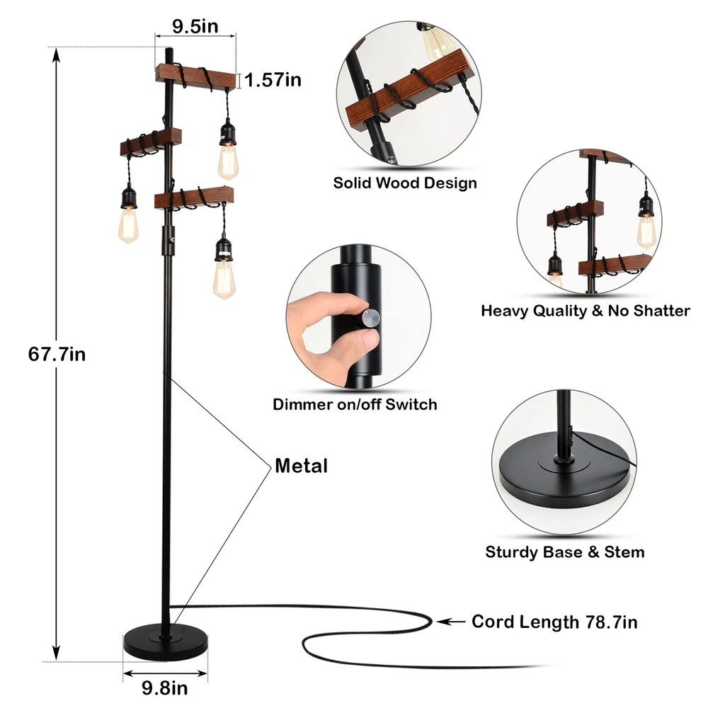 【3-Heads Lighting & Dimmable Switch】 With a dimmer switch on lamp pole, the farmhouse floor lamp offers full range of brightness from 0% to 100%, allowing you to mood of your room just how you want. The 3-heads design provides a great solution to the harsh brightness of traditional fixtures so that you feel relaxed. A Dimmable floor lamp can meet different needs. 【Well-made & Sturdy Base】Our free standing lamp is made of superior metal from top to the base to ensure it keep standing steadily even on the carpet. The base of the floor standing lamp is made of metal which is not flimsy, heavy enough make sure children and pets' safety when they are playing in the room. 【Unique Patent & Retro Appearance】With design of the elegant, simple black metallic construction make the tall tree lamp well matched to styles of industrial, vintage and farmhouse furnitute. The special solid wood design makes it ideal for multiple styles of decoration, such as minimalist, traditional and mid-century. 【Easy Assemble and Use】This 67.7 inches tall floor lamp is easy to assemble without any tools, you just need to screw all the parts together via following the instruction on the page; 78.7in cord and its compact base allow you to move the rustic floor lamp in any corner of your room, sliding it behind a sofa or place it beside a cabinet ; Combined with the dimmable rotary switch, you can easily spin the floor lamp on or off with your hands; Easy to assemble and use, makes your life much easier. 【24 MONTHS WARRANTY】offering every customer 2 Years After Sale Service. No hurry to return or apply for refund, just contact us first for the best solution. We provide 24/7 Customer Service! We will responsible for any defective issue, just contact us via buyer-seller message for a replacement or refund. No Hassle to Return.