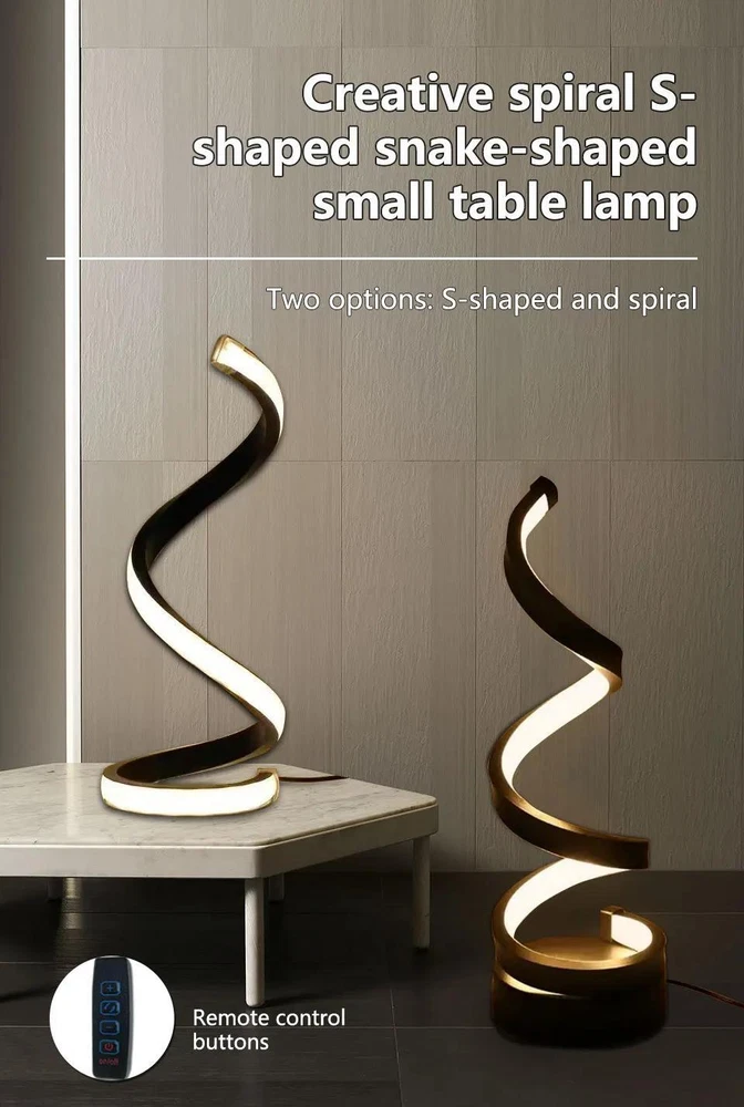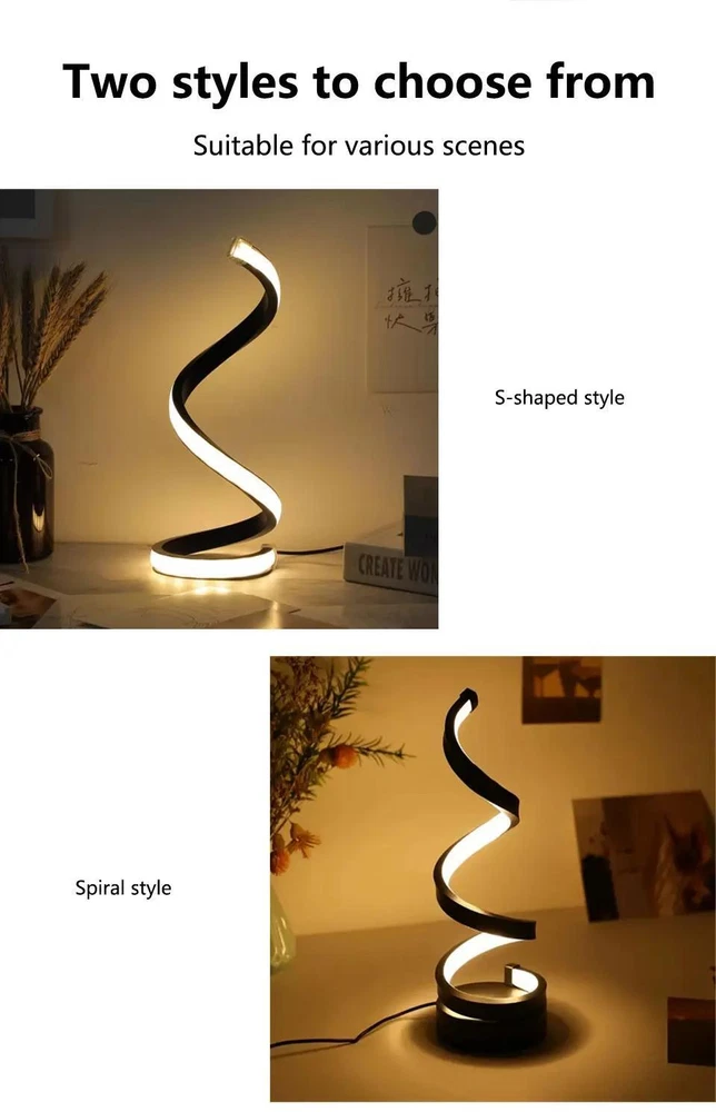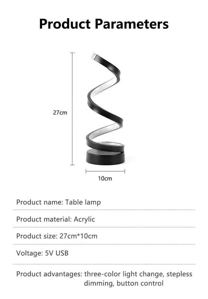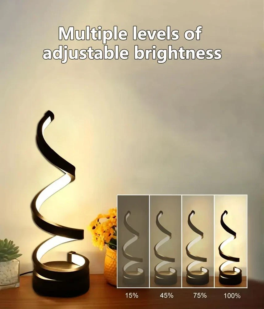 FREE SHIPPING 30 DAYS RETURN EASY PAYMENT LED Spiral Table Lamp - Dimmable, Modern Bedside Light for Bedroom & Office Features: 1. Minimalist line design: This dimmable desk lamp is a beautiful artistic decoration. The spiral curve winds upwards, creating a harmonious and elegant atmosphere for your home. 2. USB cable control switch: The USB cable has a light switch, which can switch between three color temperature and brightness adjustments. Three color temperature options: 3000K warm light suitable for sleeping, eating, and watching movies, 4500K neutral light suitable for reading without severe eye fatigue, 6500K white light suitable for writing or studying on the desk.. 3. Spiral streamline design: Special spiral streamline design and side emission technology prevent direct light and eye damage. Wave shaped design, simple and beautiful. This stylish indoor desk lamp decorates tables, shelves, and any furniture with its stylish design, helping to decorate your space in an elegant and exquisite way. 4. Wide application range: This dimmable spiral light is suitable for decoration, tasks, atmosphere, and emotional lighting of entry-level tables, coffee tables, desks, study rooms, bedside, bedside lights, cafes, dining tables, bars, bedrooms, restaurants, and living rooms. It is also suitable for dimmable LED study night lights, desk reading light. Thank you for shopping
