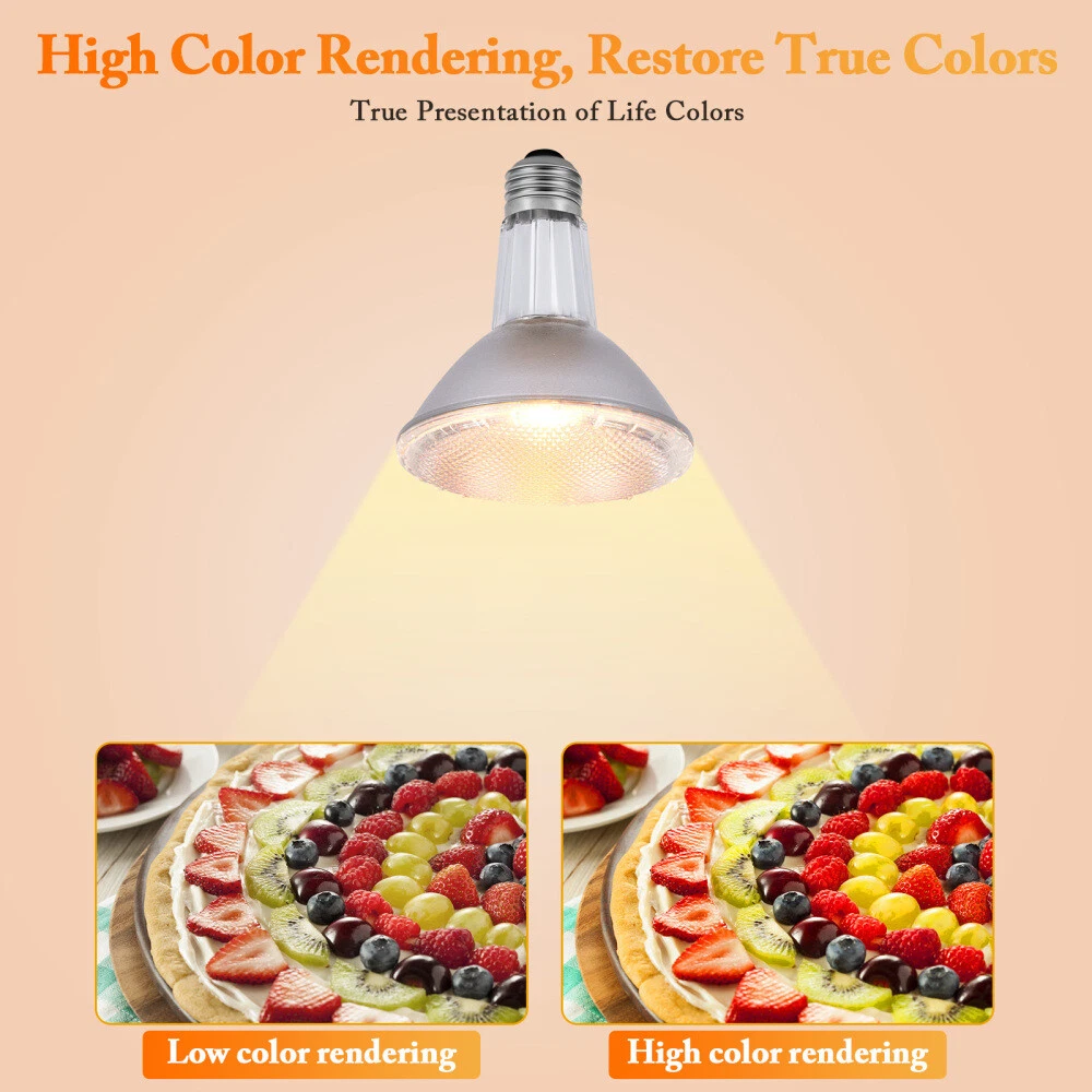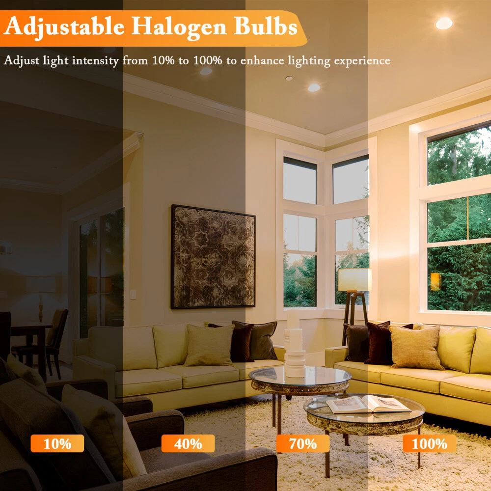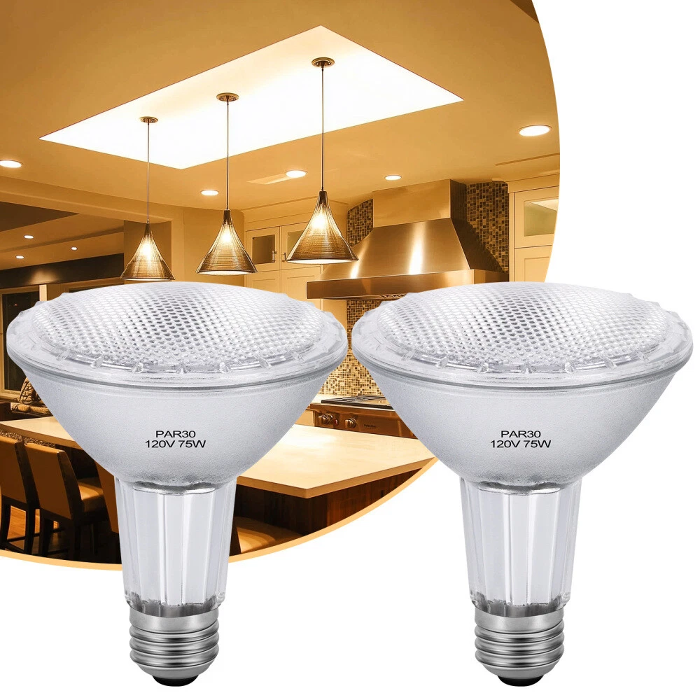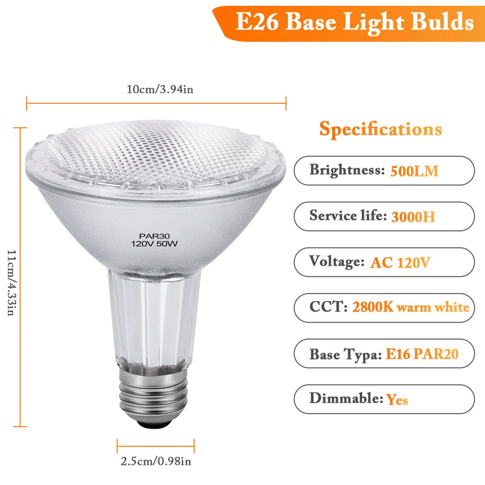 Features: Long Lasting Lifetime: Enjoy 3000 hours of long-lasting life with this pack of 6 high-quality tungsten filament par30 long neck halogen 50w/75w, switch on and off about 8000 times. Our par30 bulb saving you the cost of frequent Bulb replacement. PAR30 Warm White 2800K: Emitting a high output of 500/750 lumens, this par30 flood light provides a bright warm white light at 2800K, creating a cozy and inviting atmosphere. The CRI up to 99 restores the real color of objects, Par30 flood light bulbs, making the illuminated area more colorful. PAR30 Dimmable & Eye-Protective: Seamlessly Dimmable from 10% to 100%, these par30 bulb 50w/75w are suitable for any atmosphere or decoration. They contain no lead or mercury, ensuring zero flickering and protecting your eyes and family. With no hazardous emissions, UV, or IR radiation, par30 halogen bulb are an environmentally friendly light source. PAR30 E26 Base Bulb: With standard E26 base, our par30 halogen light bulbs perfectly fit in any E26 medium Screw base sockets / 120v for most fixtures. 50w/75w par30 halogen often used for track light bulbs, recessed light bulbs and perfect for indoor 5-6in ceiling cans. Specifications: Brightness: 500lm/750lm Wattage: 50W/75W Material: Alumilum, PC Color: 2800K warm white Voltage: AC 120V Base type: E26 Beam angle: 36 degrees Dimming range: 100%~10% Lifespan: 3000H Bulb Shape Size: PAR30 Package: 2/6 x flood light bulbs